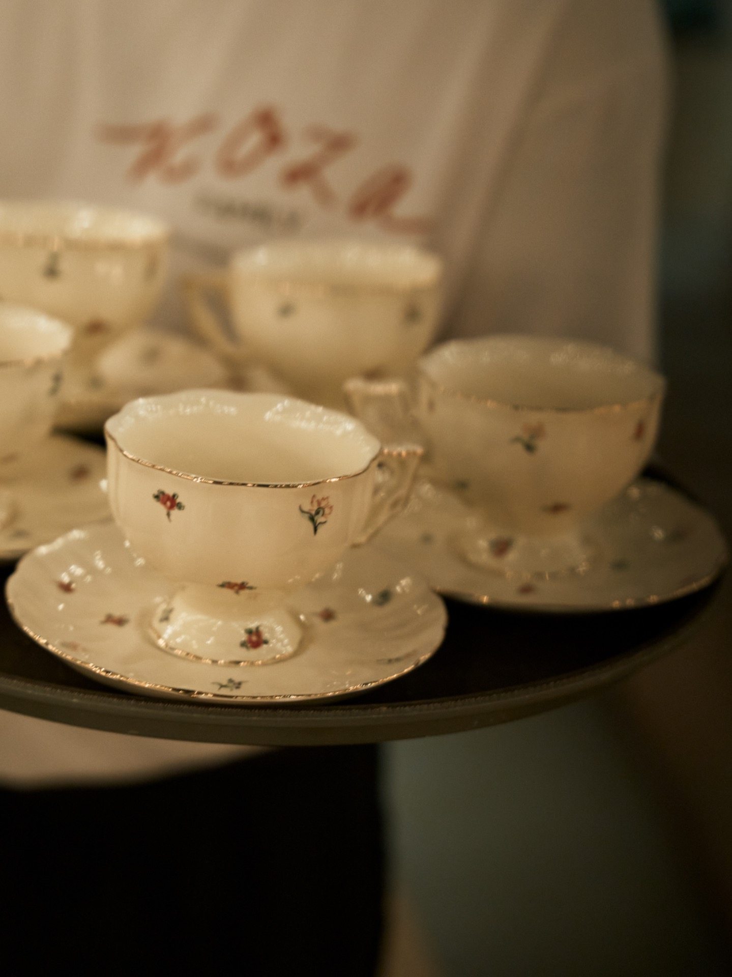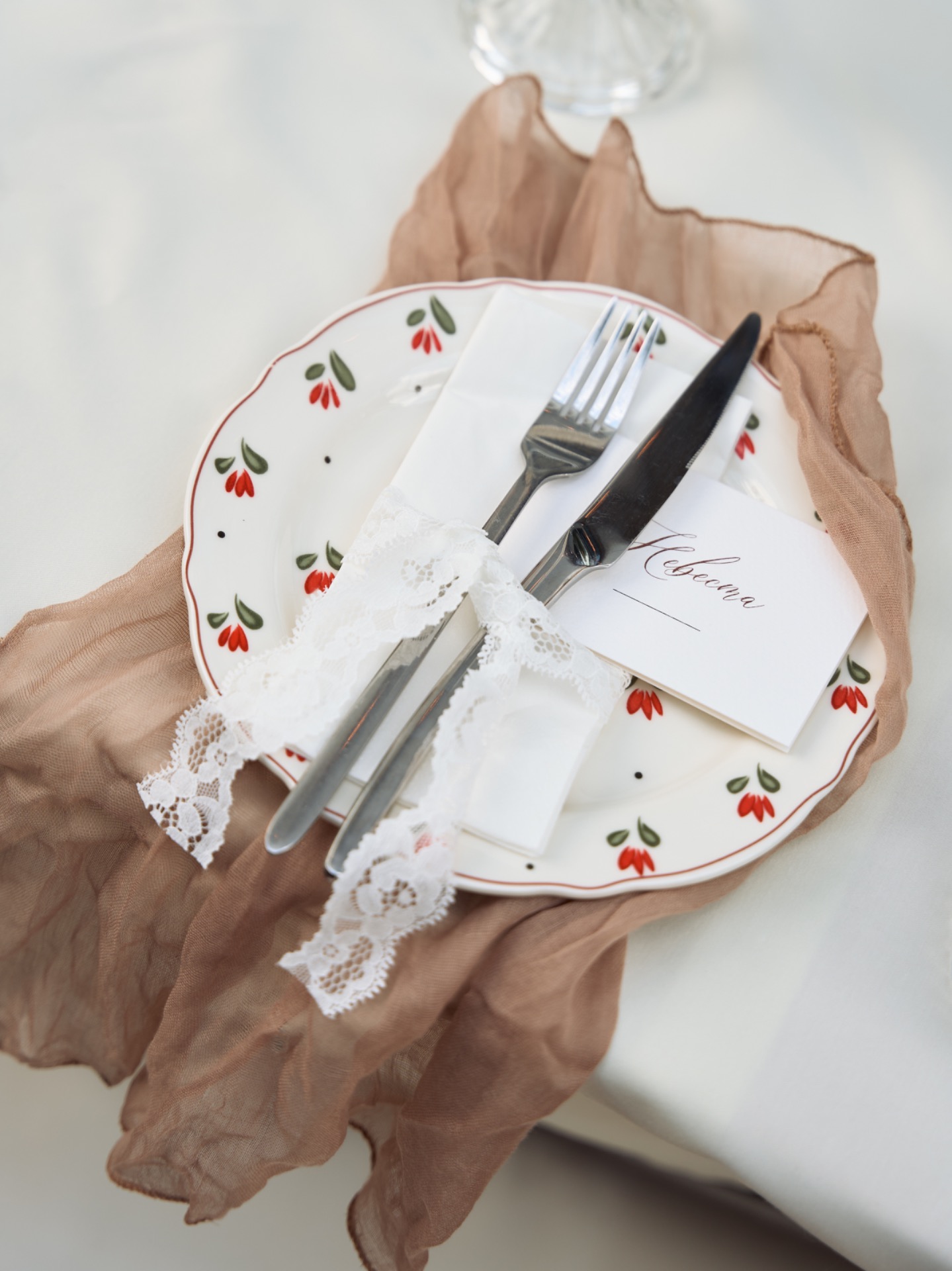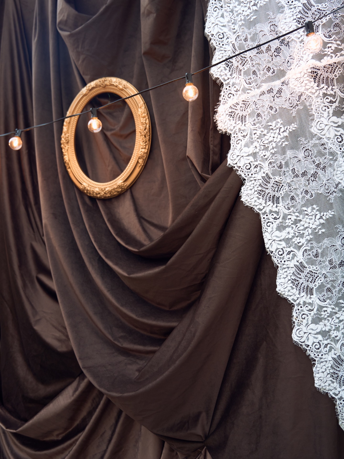 В качестве декора мы выбрали акцентную зрительную зону в виде стены из велюровой шоколадной ткани, на которую были развешаны винтажные рамы и драпировка из кружевной ткани. На гостевом столе располагались живые свечи и минималистичные цветочные композиции. Декор дополняла очень милая цветочная посуда ресторана.