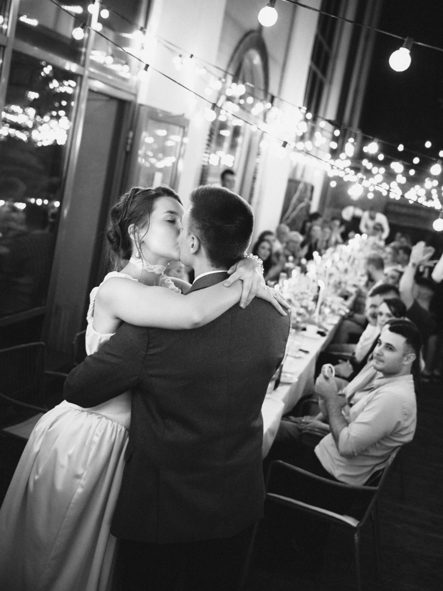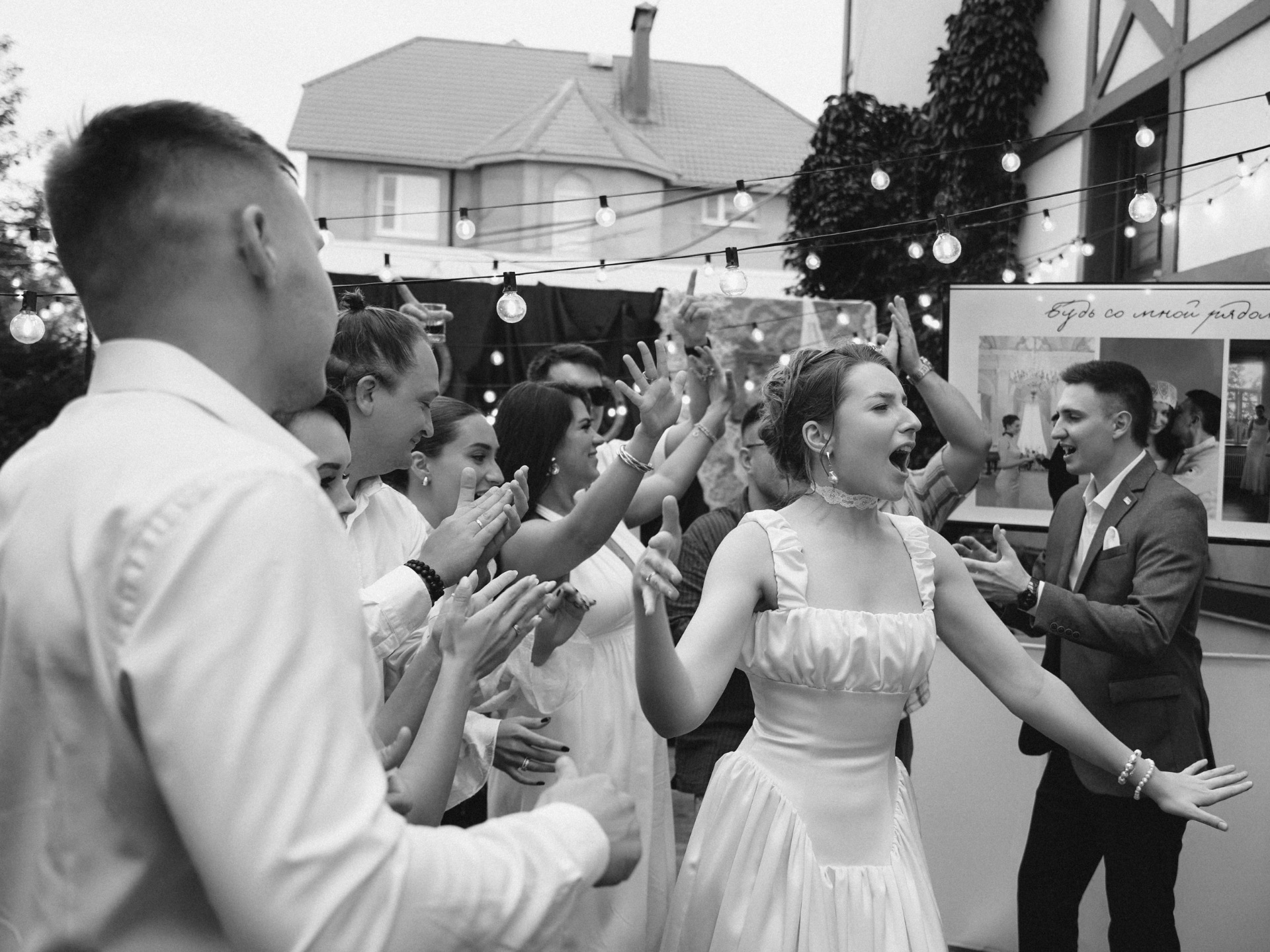 В течение ужина мы много общались, смеялись, танцевали и пели — атмосфера была невероятно дружелюбной и весёлой. Вместо букетов мы попросили гостей принести бутылочки вина, которые они могли подписать с указанием случая, когда их следует открыть.