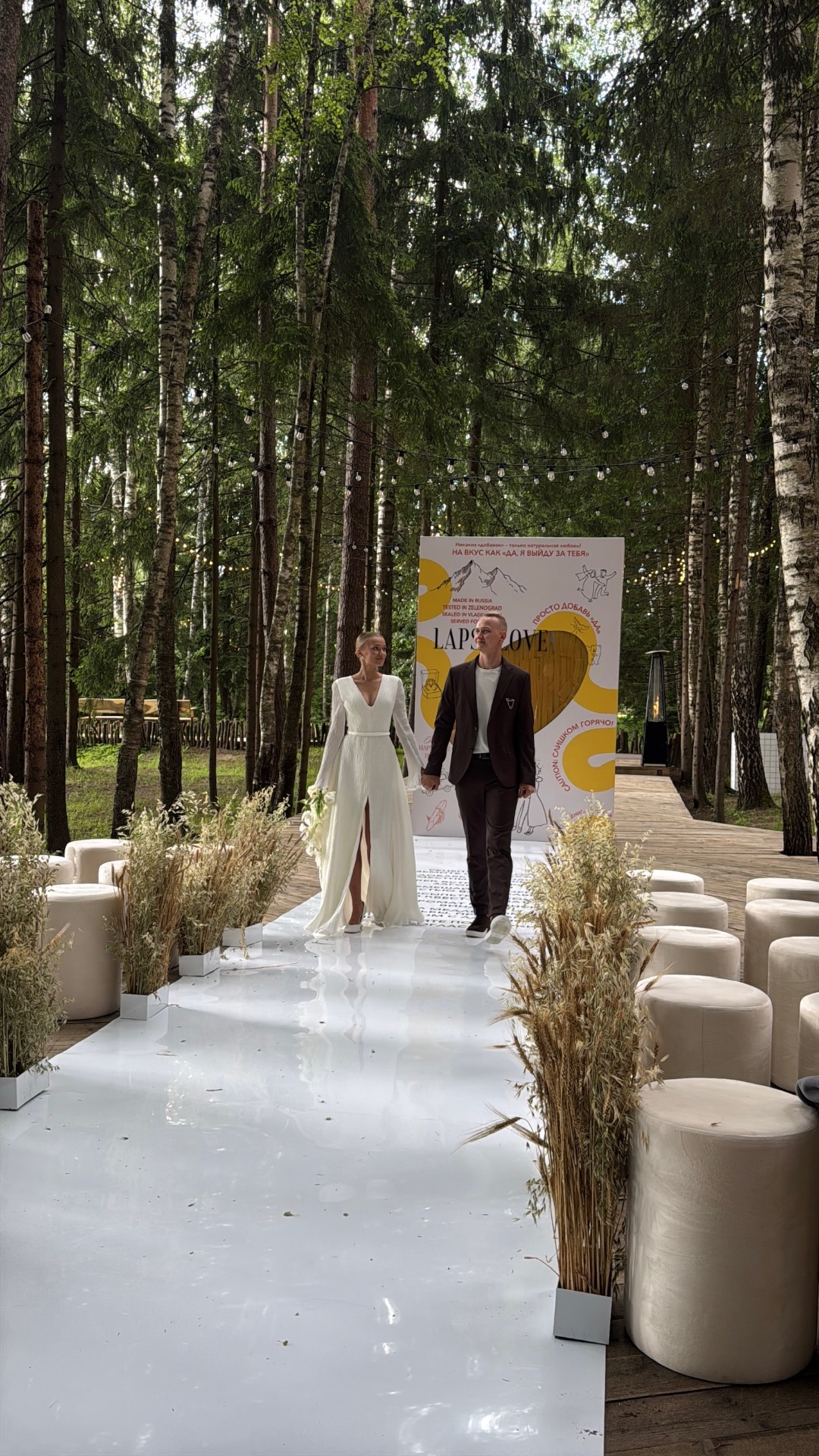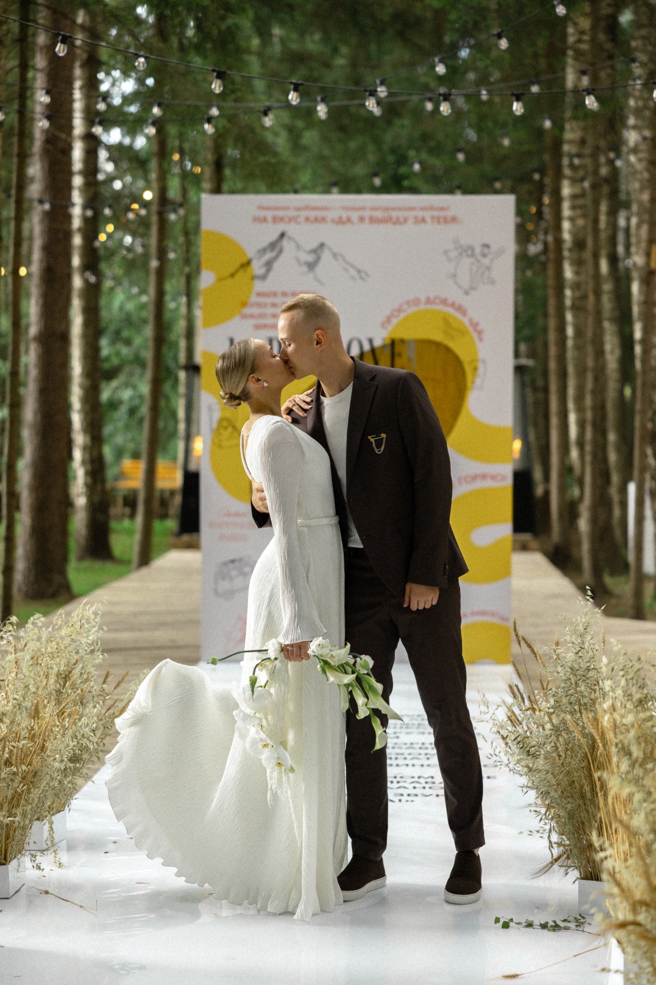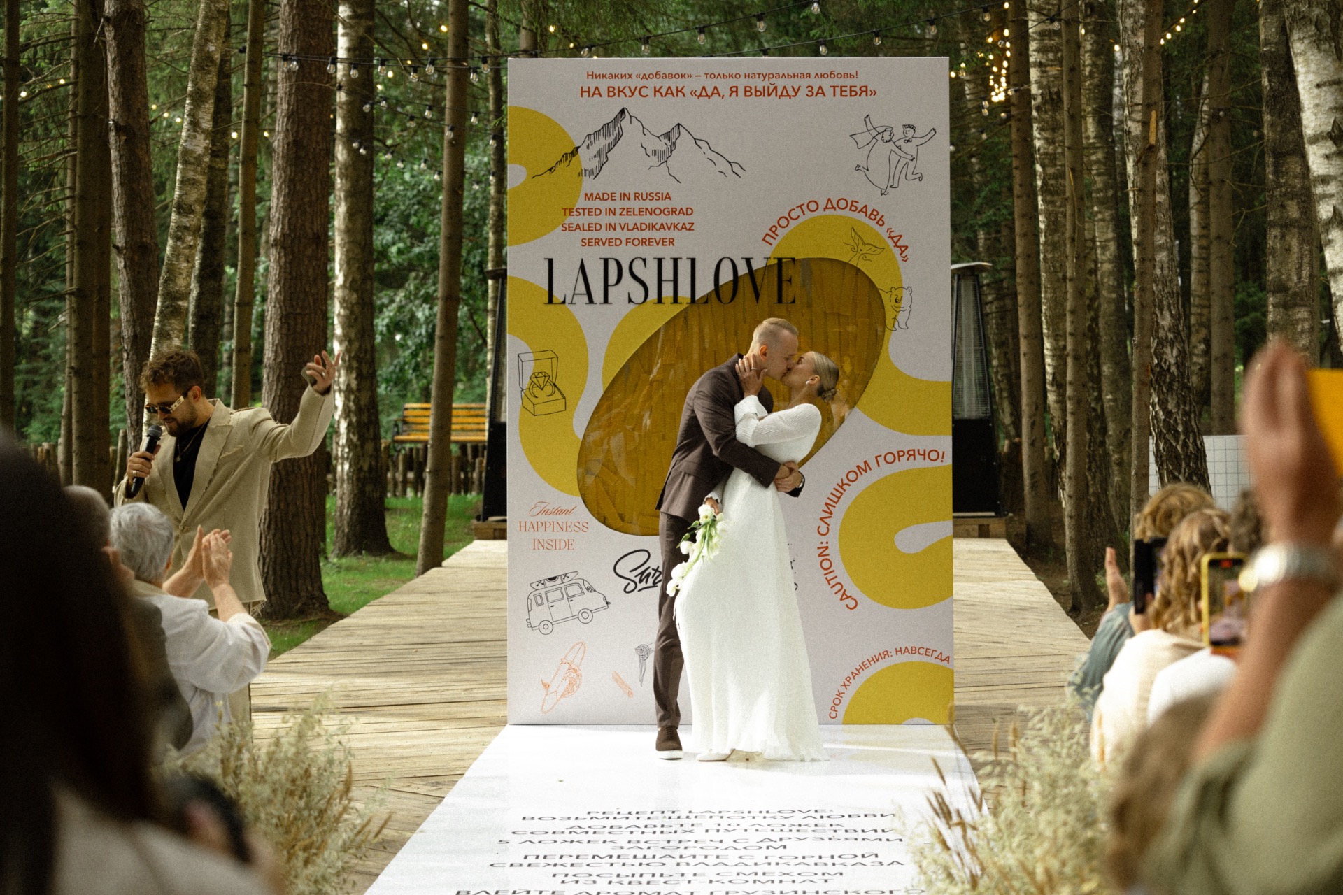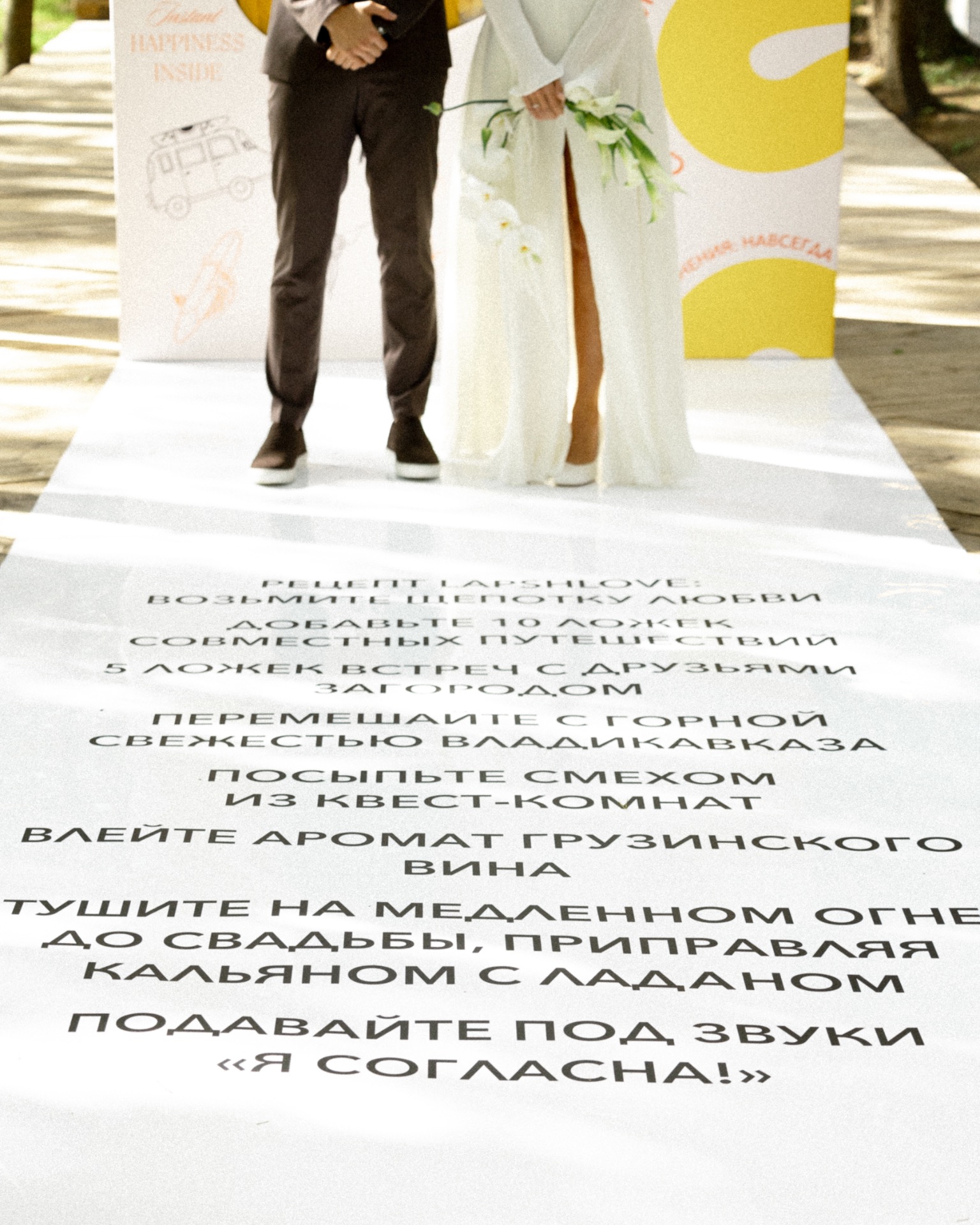 Нам пришла в голову идея сделать волнистые столы в виде длинных спагетти и украсить их декоративными сумочками, сделанными из макарон. А цветы и все остальные детали декора также напоминали различные виды макаронных изделий. Для зоны церемонии мы вместе с декораторами создали трёхметровую коробку с лапшой, которая стала настоящим вау-элементом нашей свадьбы.