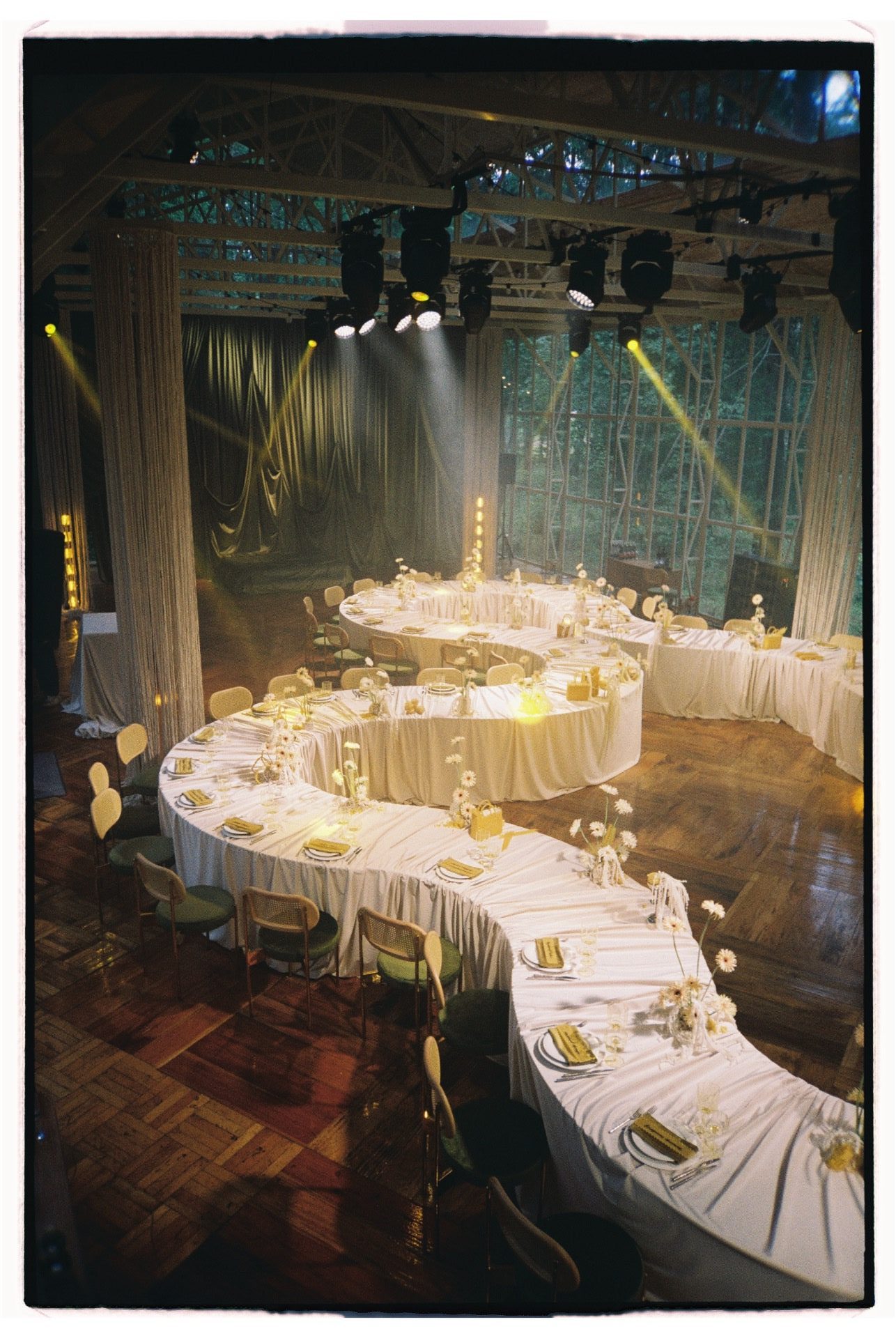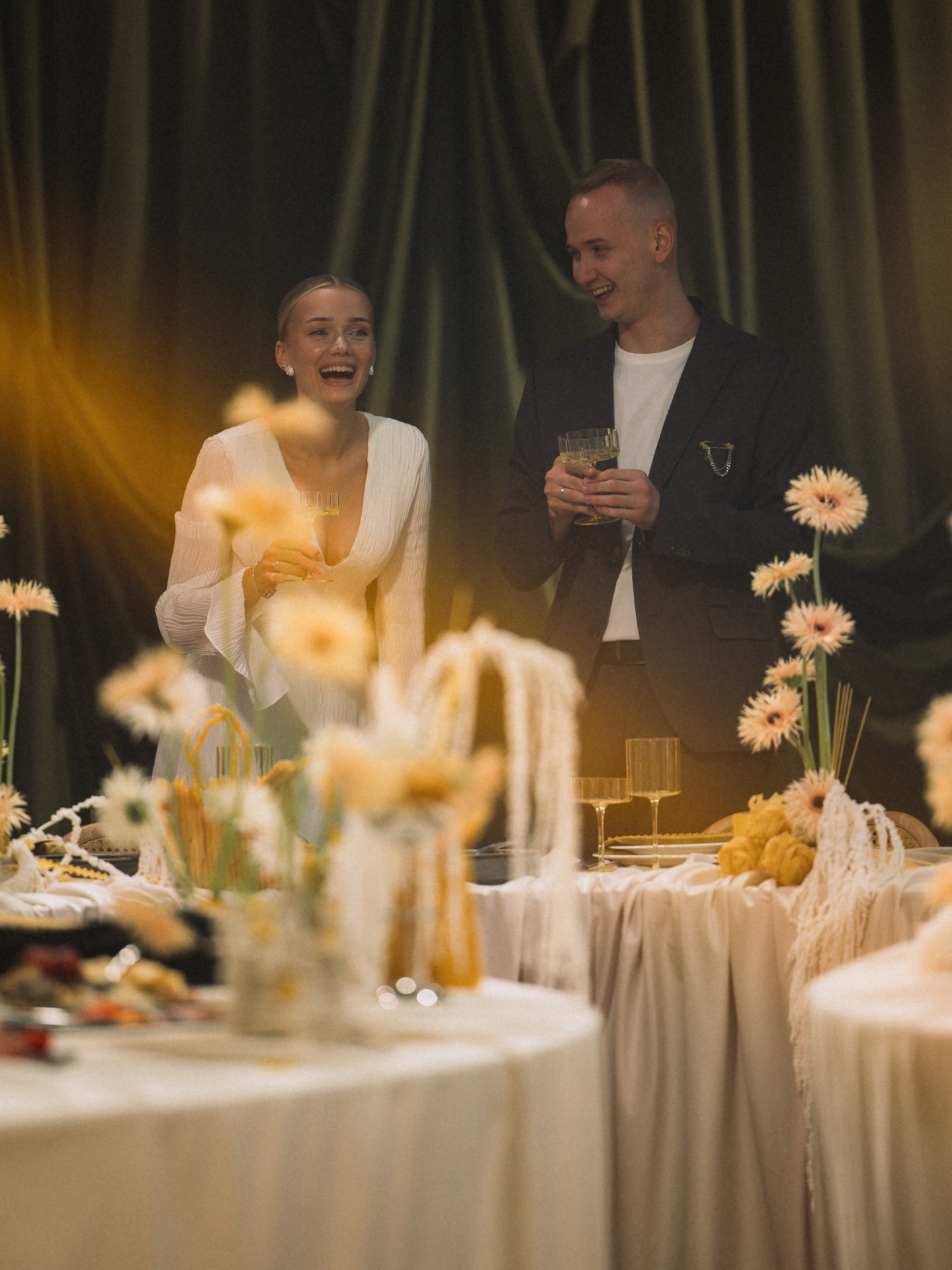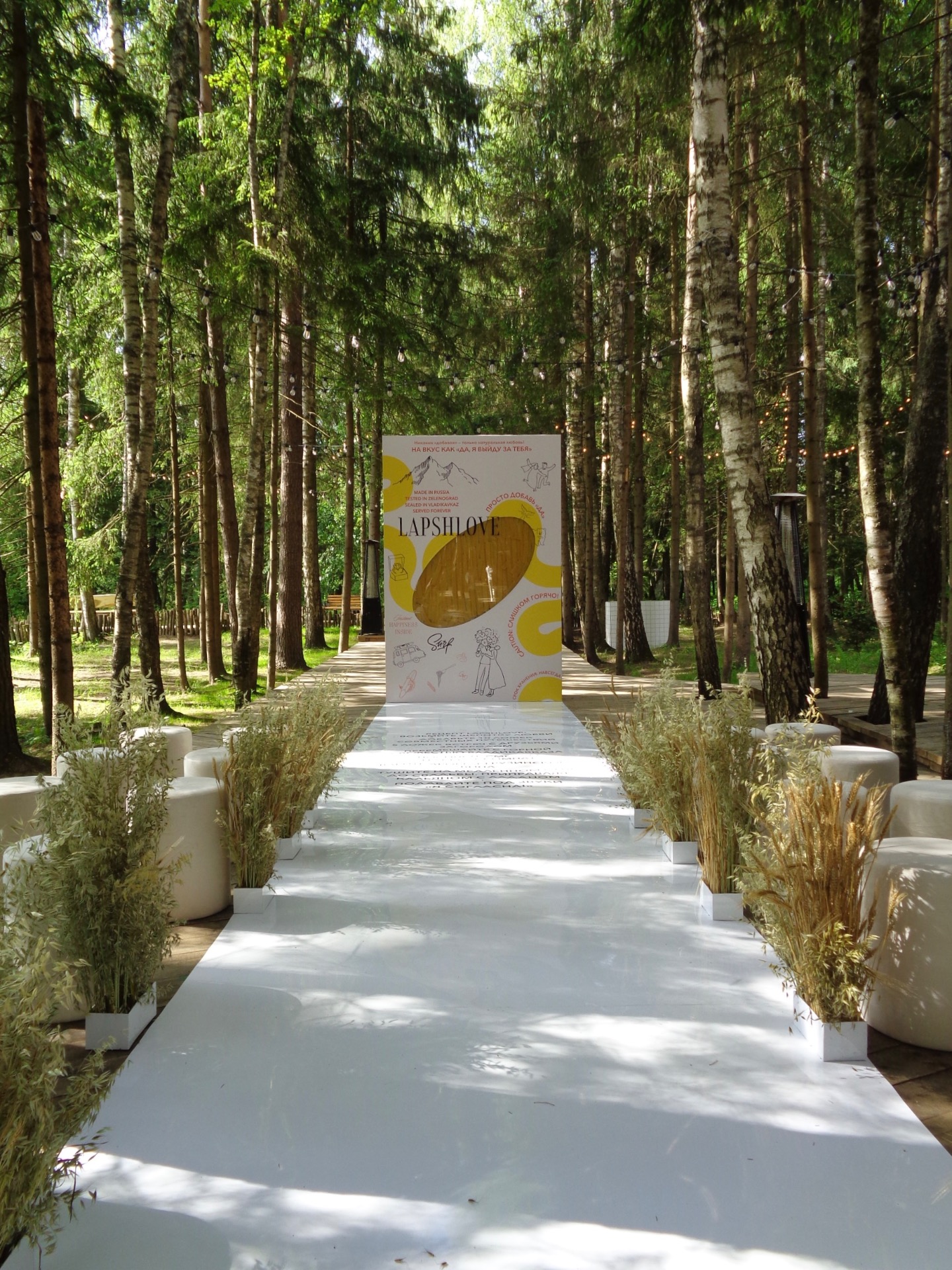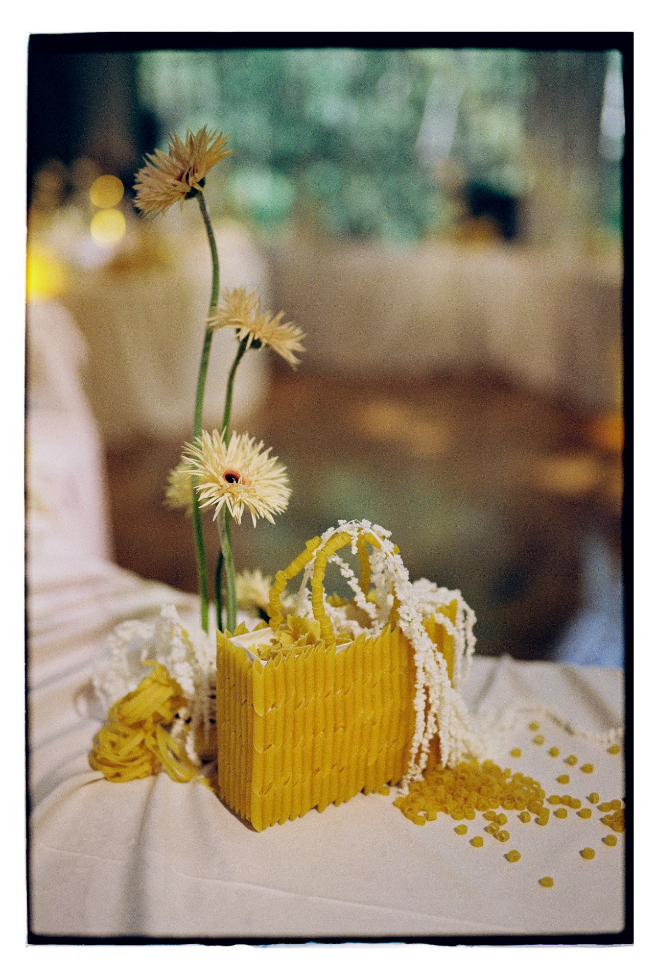 Нам пришла в голову идея сделать волнистые столы в виде длинных спагетти и украсить их декоративными сумочками, сделанными из макарон. А цветы и все остальные детали декора также напоминали различные виды макаронных изделий. Для зоны церемонии мы вместе с декораторами создали трёхметровую коробку с лапшой, которая стала настоящим вау-элементом нашей свадьбы.