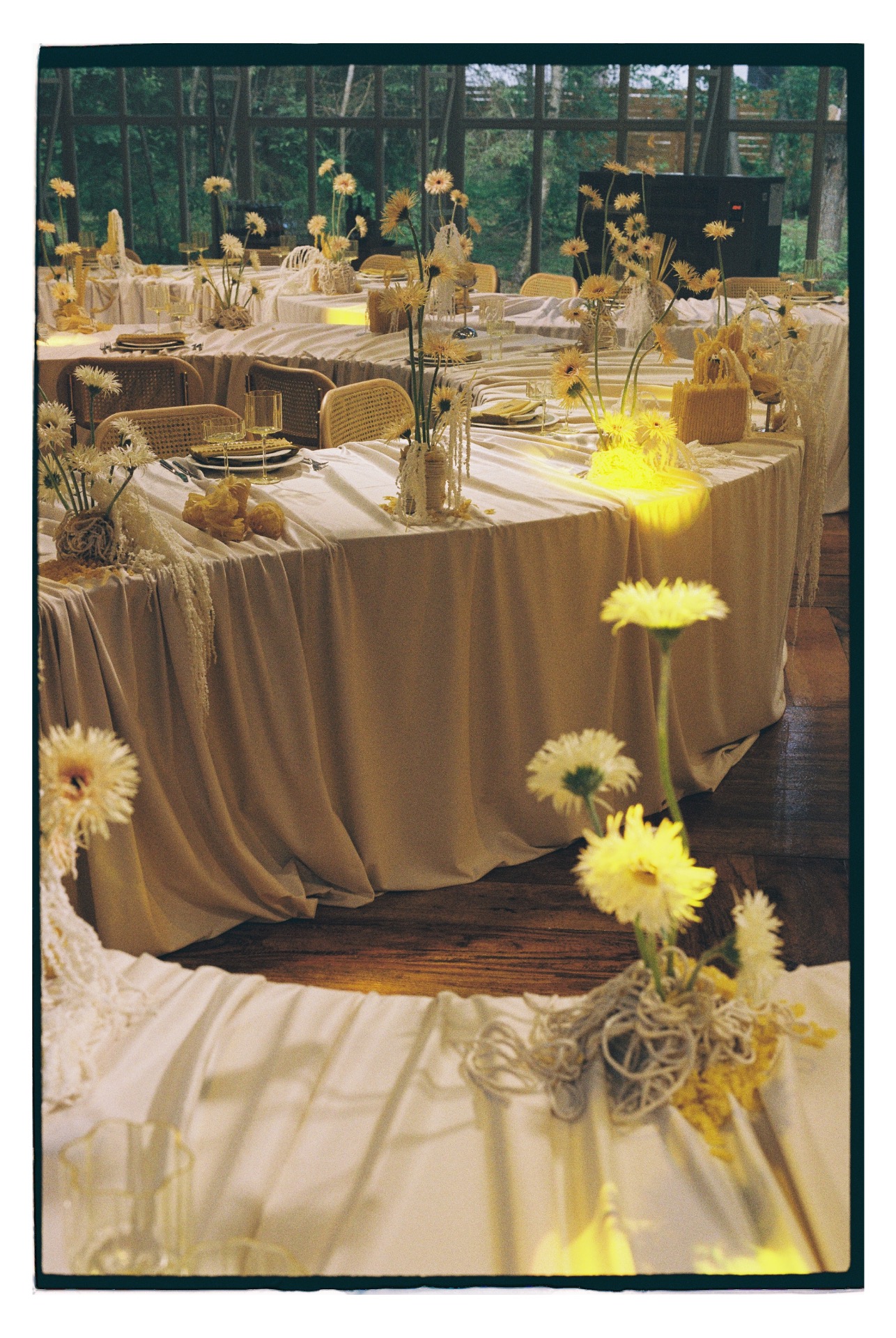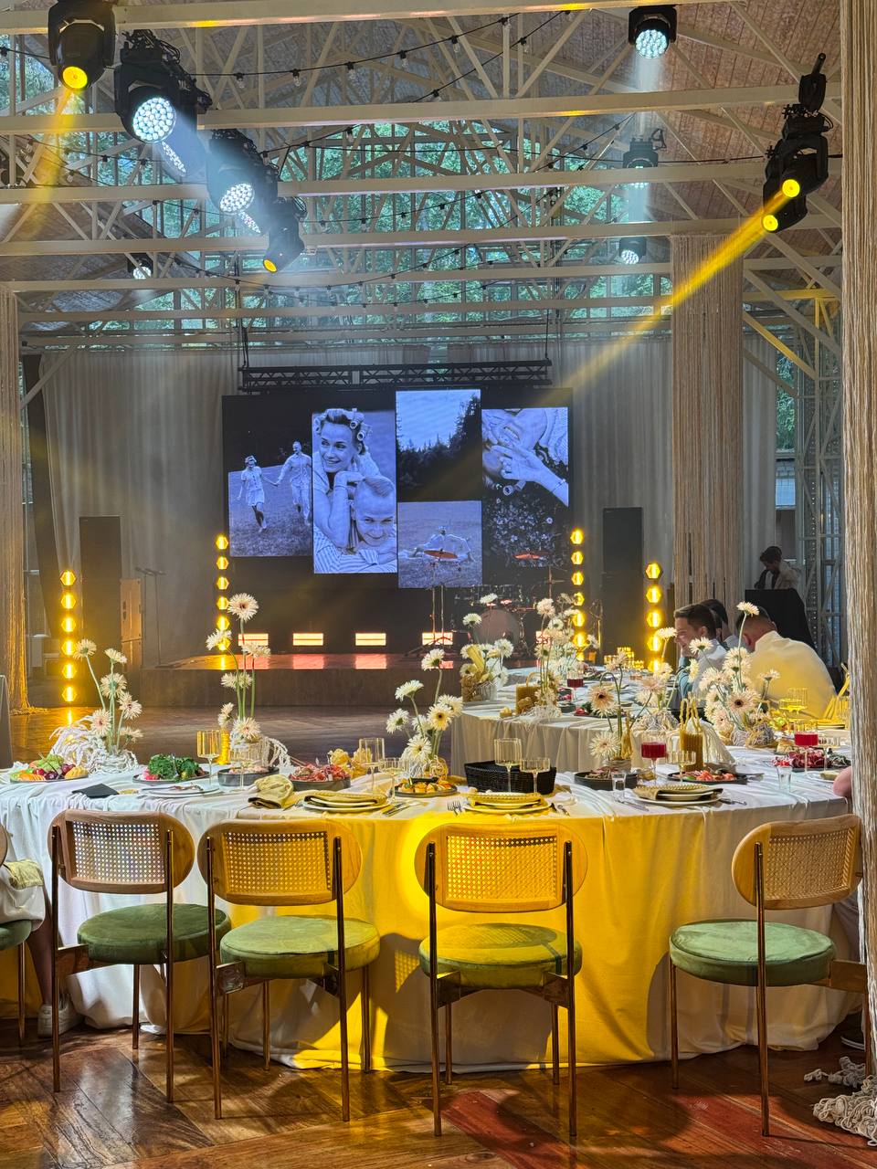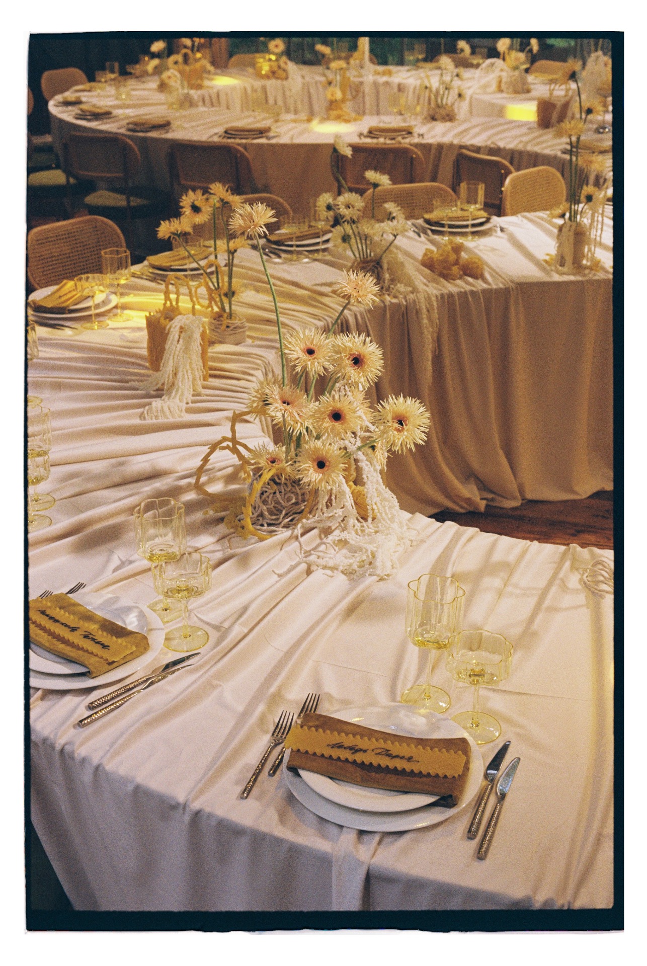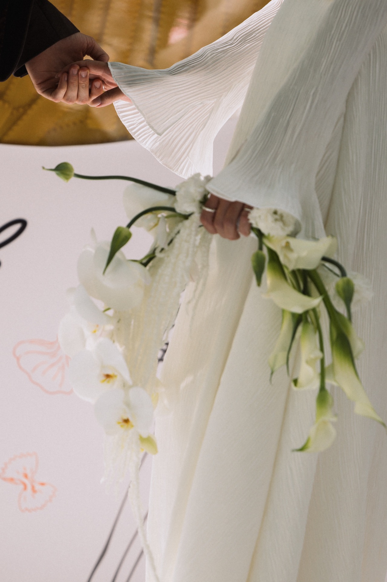Нам пришла в голову идея сделать волнистые столы в виде длинных спагетти и украсить их декоративными сумочками, сделанными из макарон. А цветы и все остальные детали декора также напоминали различные виды макаронных изделий. Для зоны церемонии мы вместе с декораторами создали трёхметровую коробку с лапшой, которая стала настоящим вау-элементом нашей свадьбы.