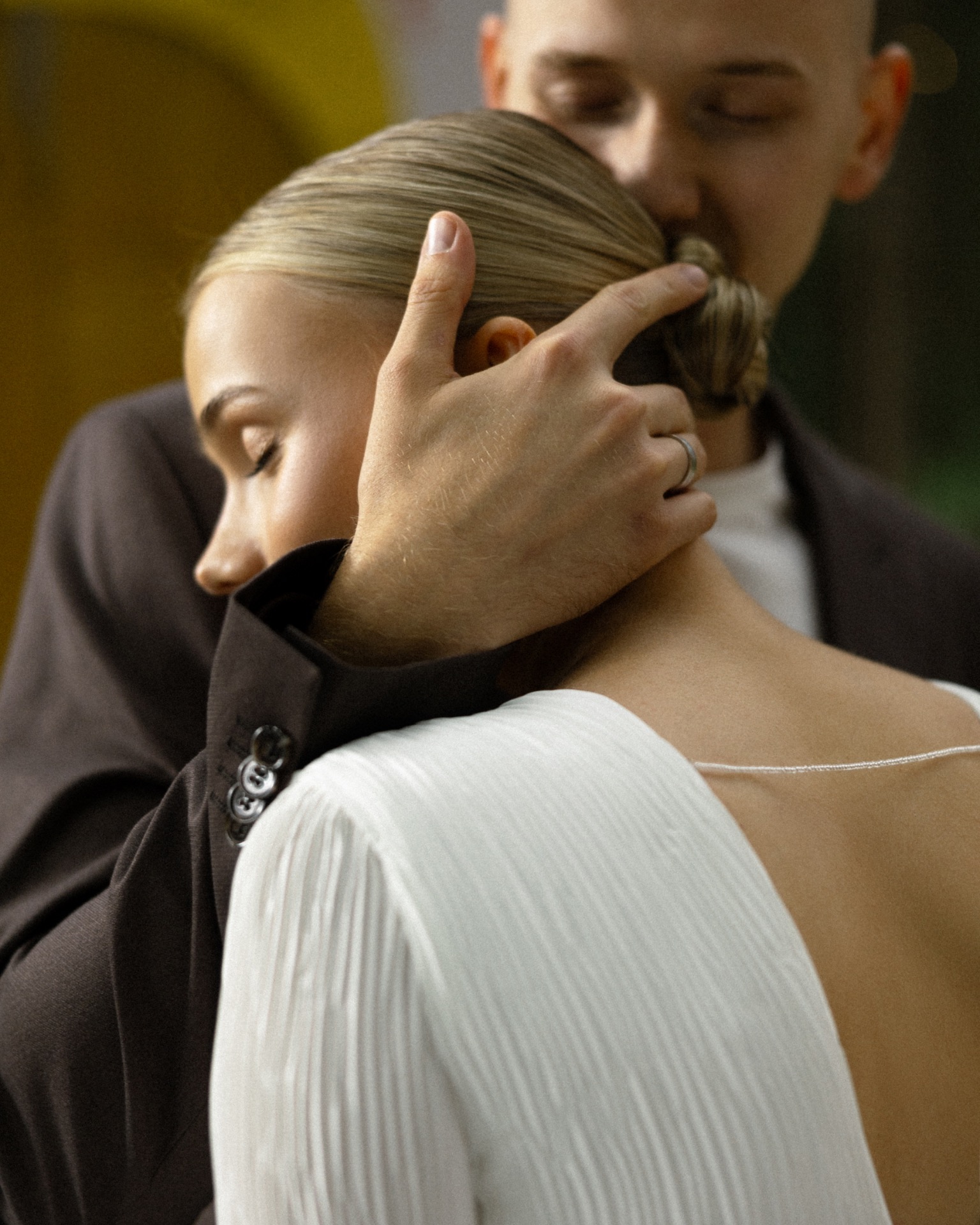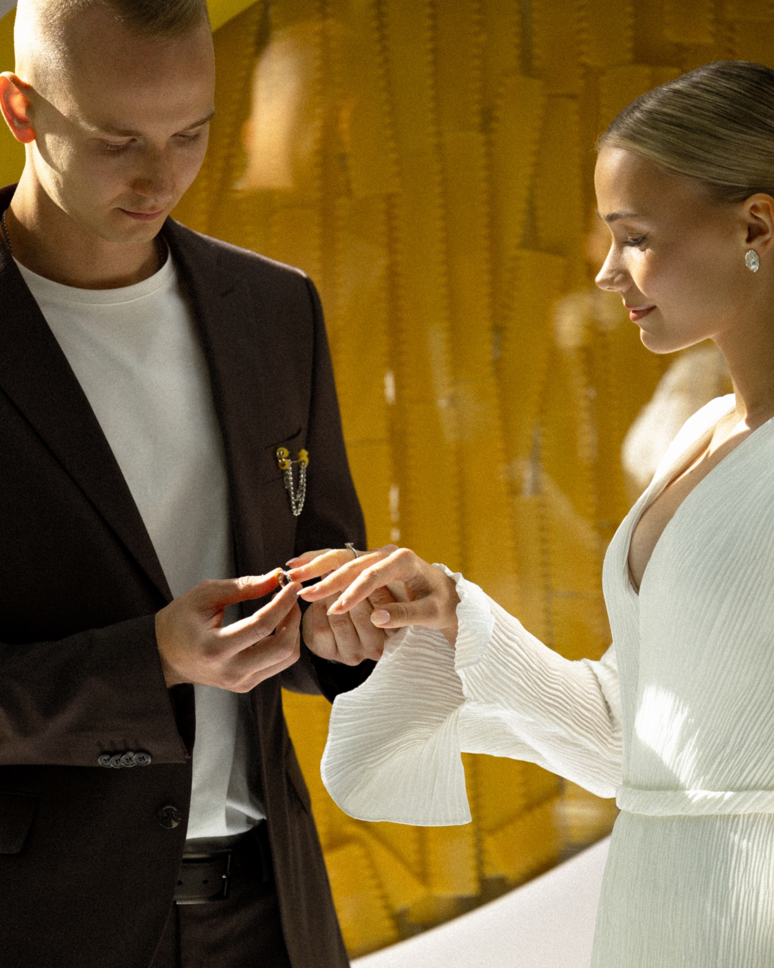 Для образа жениха Дима выбрал костюм современного кроя тёмно-коричневого цвета. Основным акцентом в его наряде стала булавка из макарон на кармане пиджака.