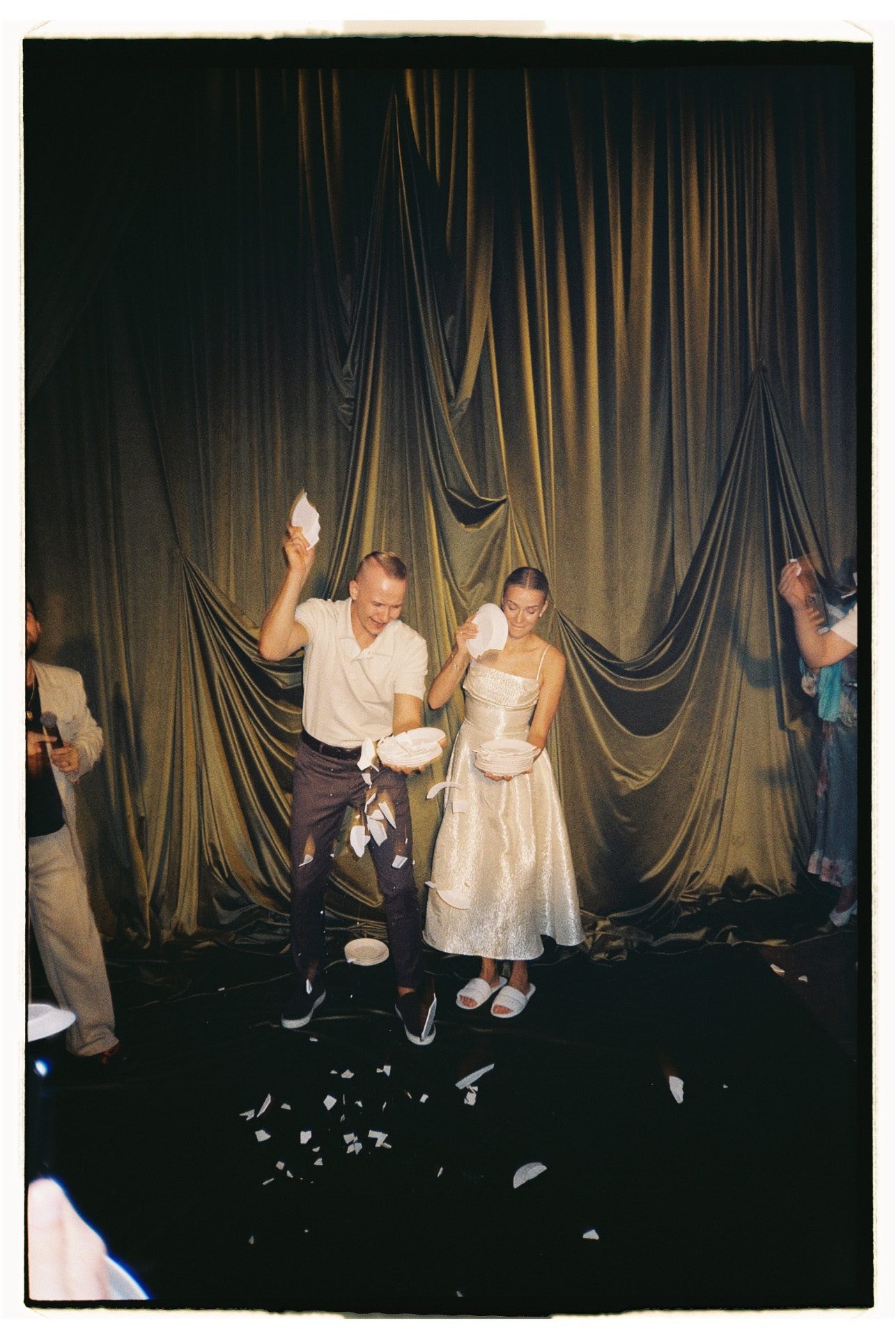 День получился просто великолепным. Нам с Димой запомнилась каждая минута, начиная от утренней фотосессии с макаронами вместо бигудей и заканчивая необычным финалом нашего праздника. Вместо привычных бенгальских огней или конфетти в завершение вечера мы разбили друг о друга специальные тарелки.