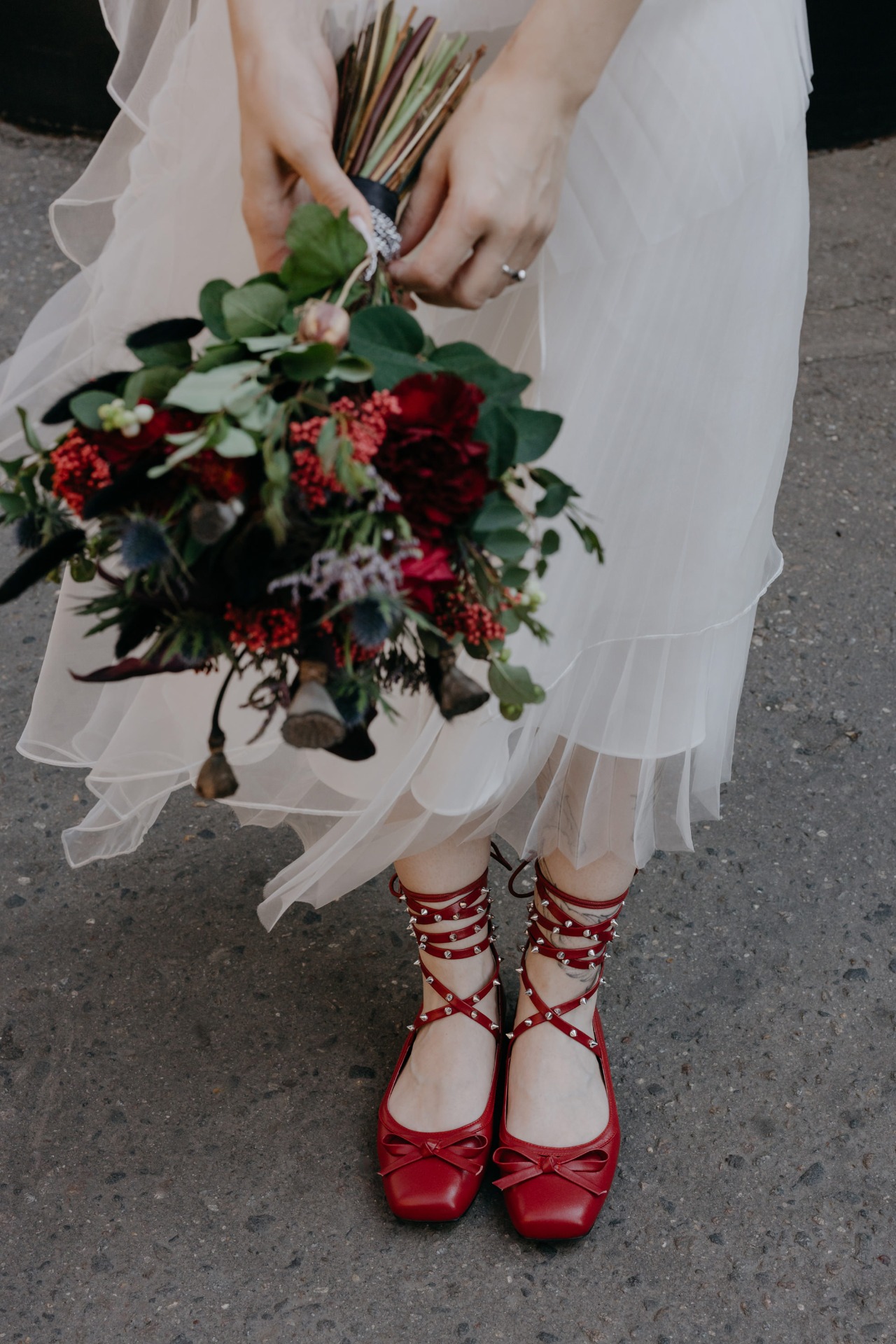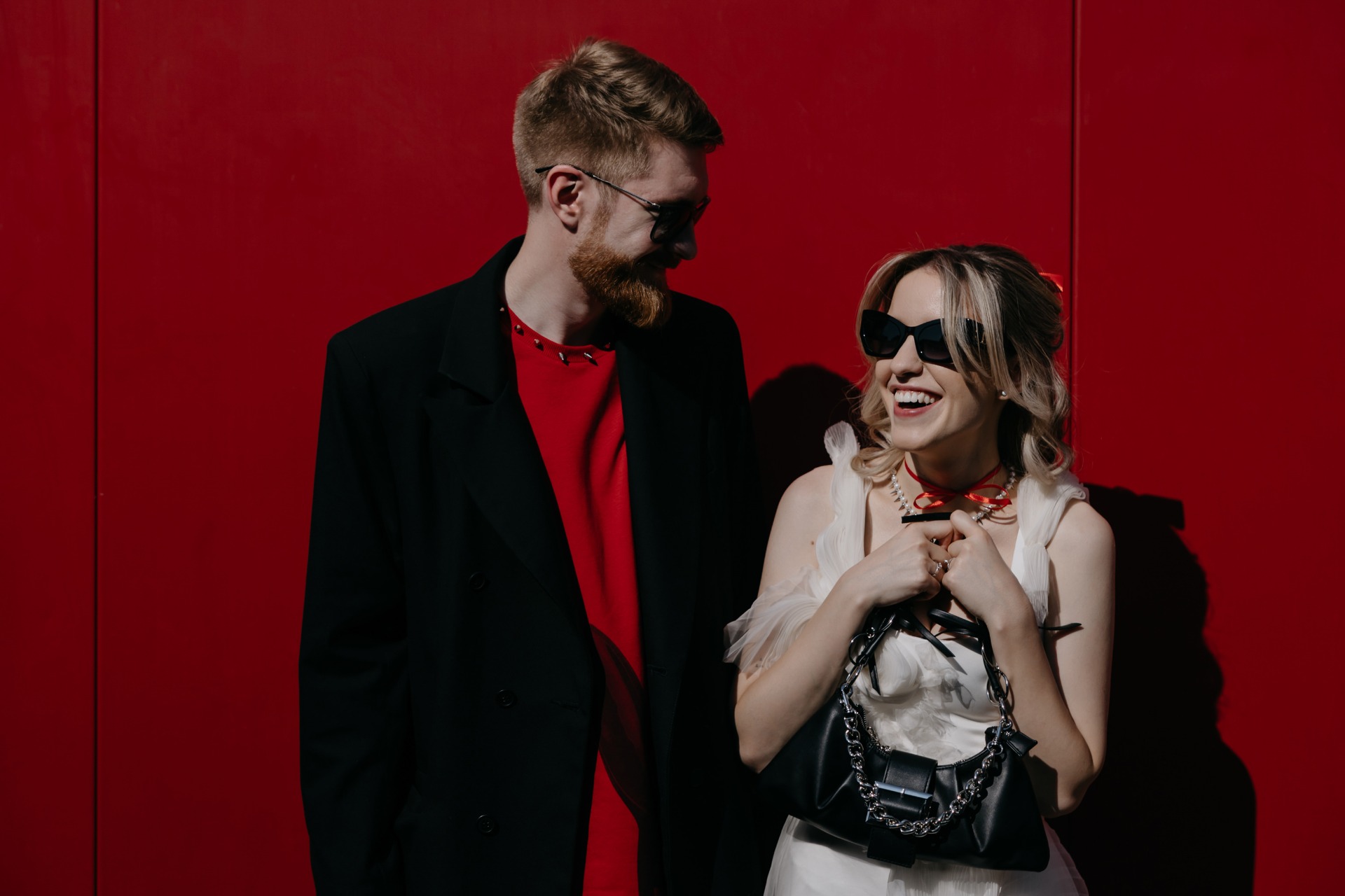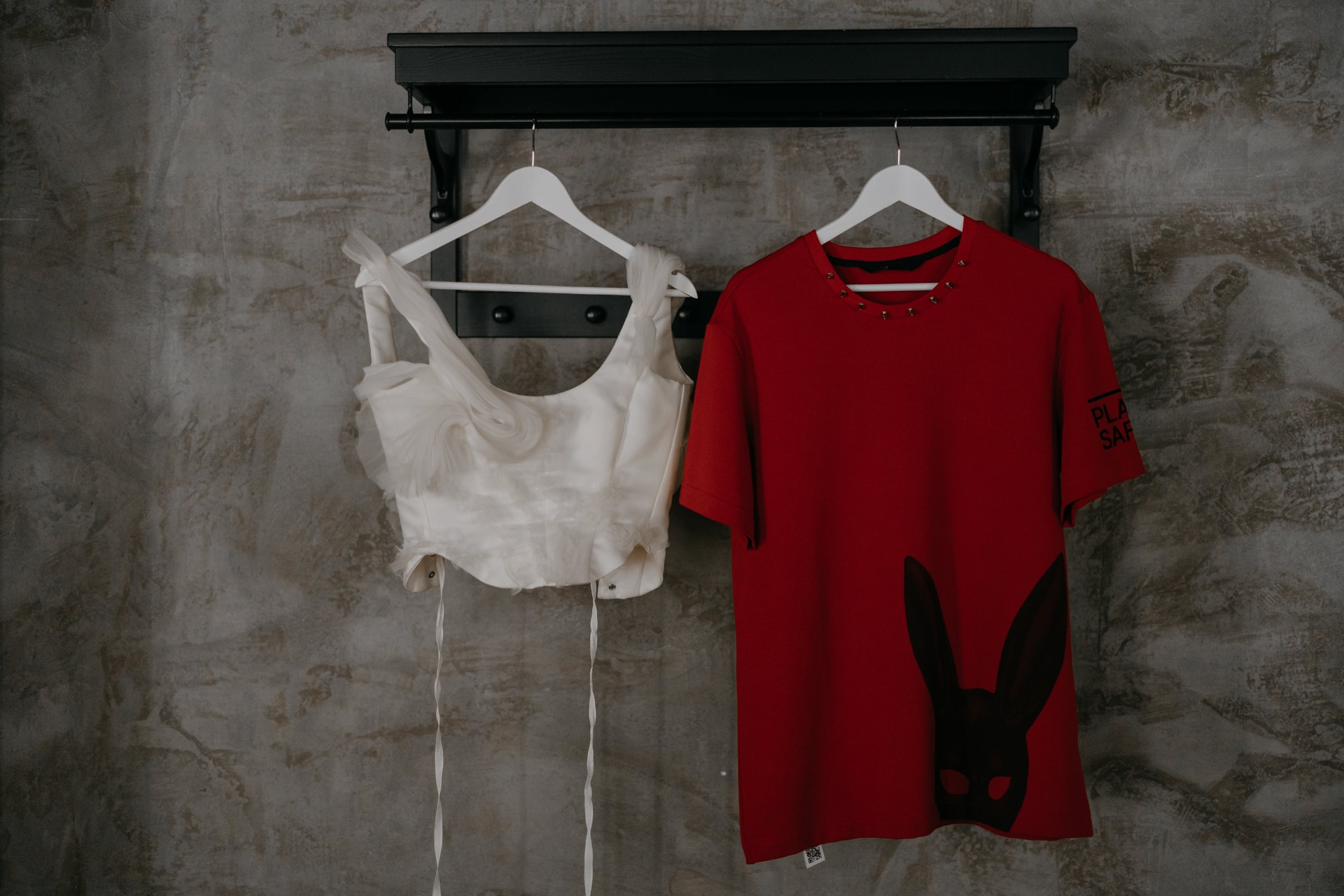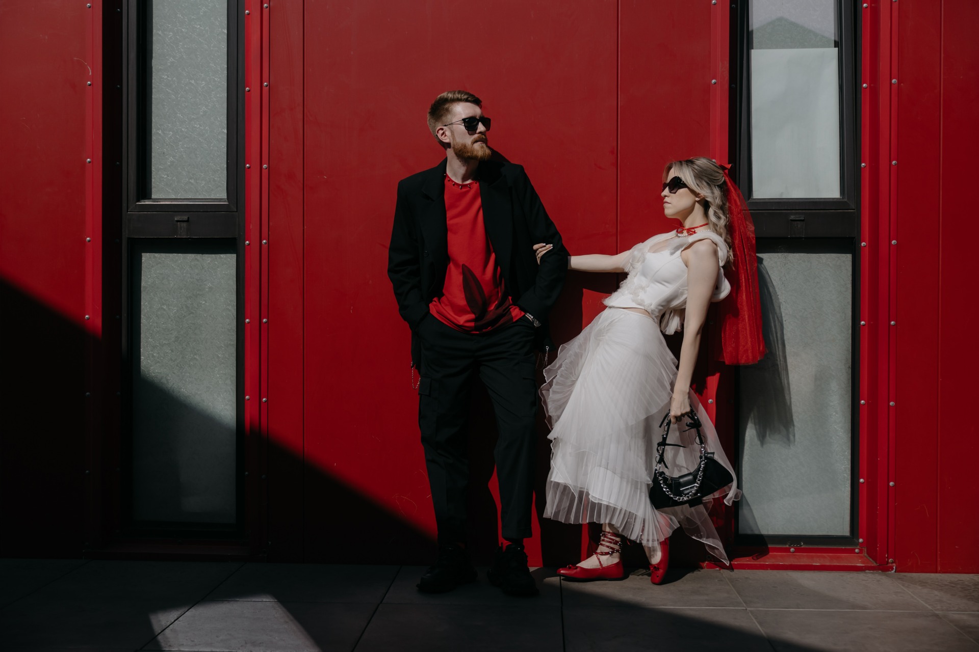 Образ жениха должен был быть достаточно рокерским и, при этом, классическим. Здесь мы тоже немного помучались с балансом рокерское vs торжественное, и, в итоге, сделали выбор в сторону красной футболки с шипами на воротнике, которые я добавила сама, и пиджака из Bat Norton.