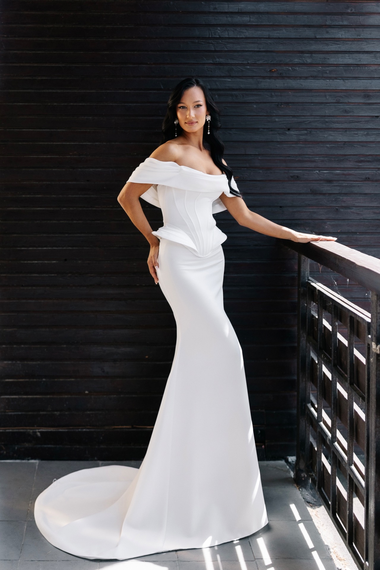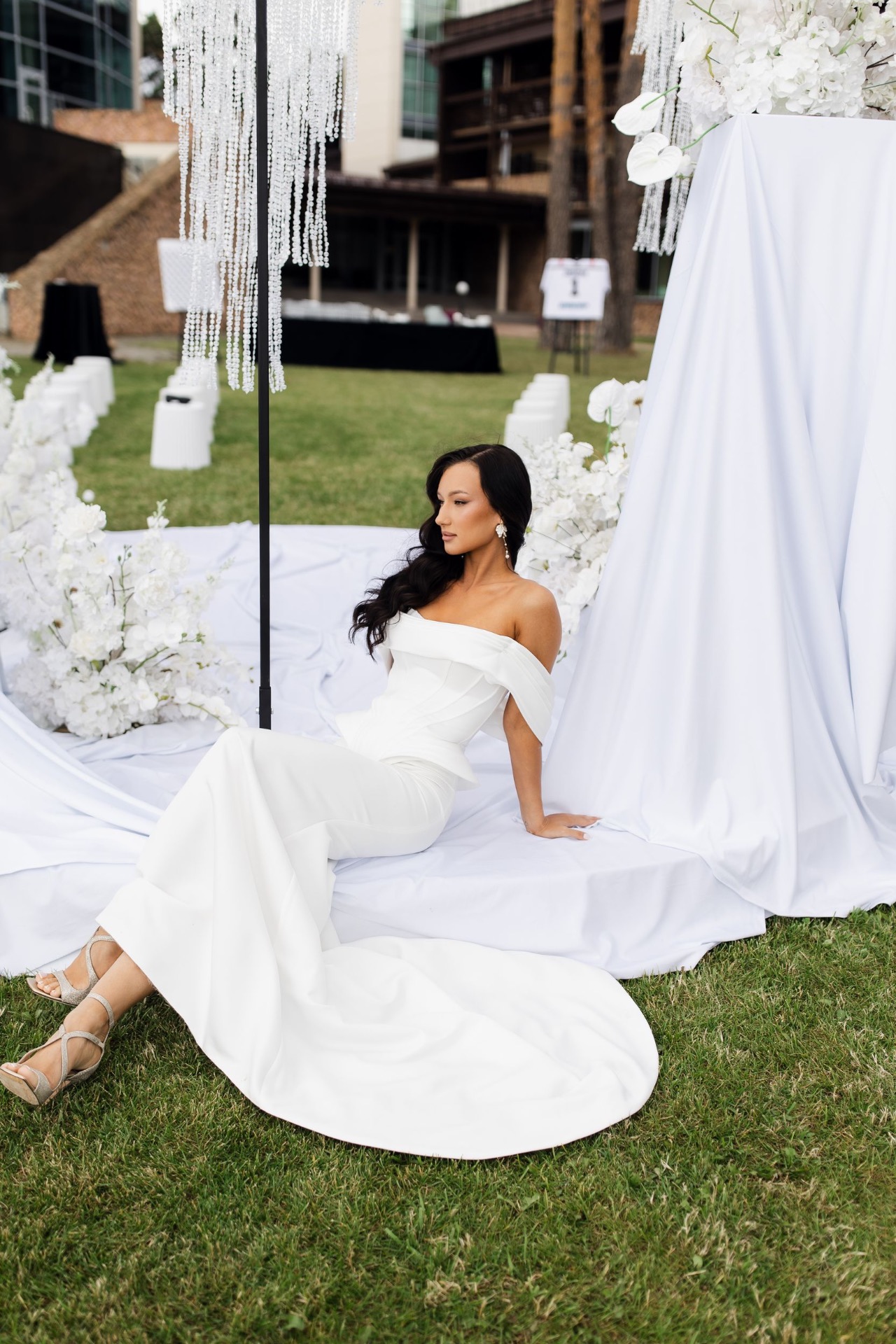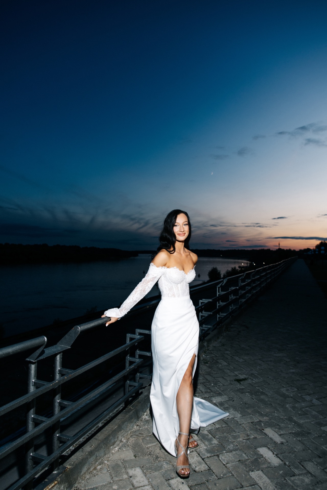 На выездную церемонию — очень эстетичная модель без лишних деталей. На основную часть — красивое платье со шлейфом, и заключительное короткое кружевное платье для выноса торта и нашего финального слова.