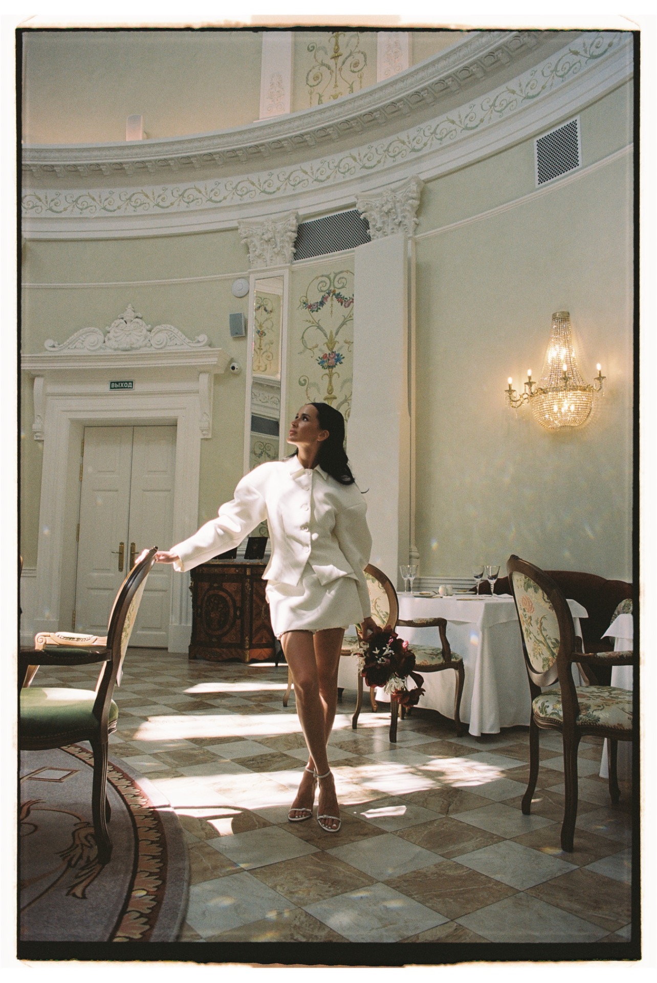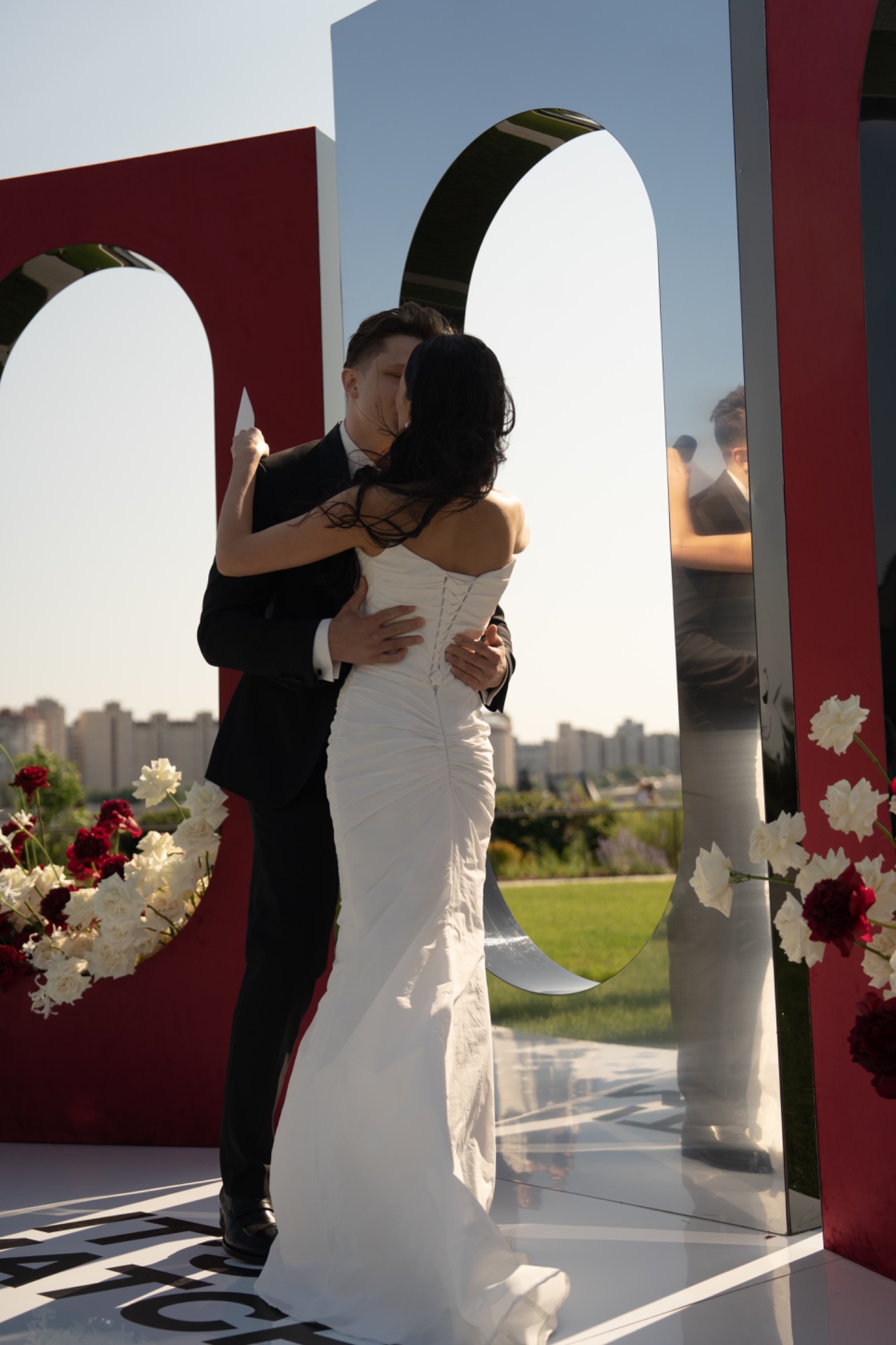 А у меня не было чёткого плана по платью. Я знала одно: пышные фасоны — это точно не моё. Мне хотелось выбирать по ощущениям. Я примерила несколько вариантов, и, когда надела то самое, сразу поняла всё поняла. Оно село идеально, даже подгонка не понадобилась. Платье было без громоздкого шлейфа, с необычной шнуровкой на корсете, аккуратной сборкой сзади и идеальной тканью — всё совпало на сто процентов.