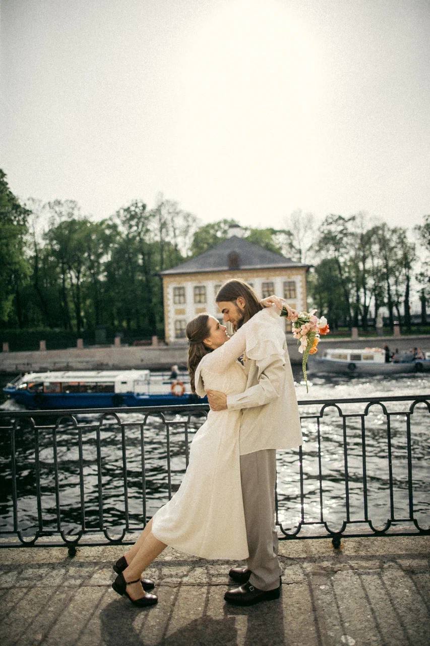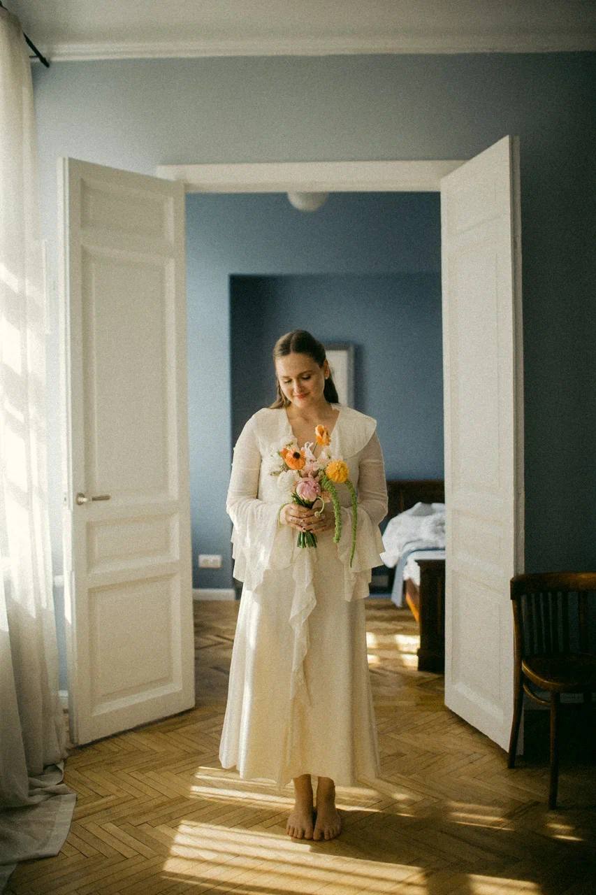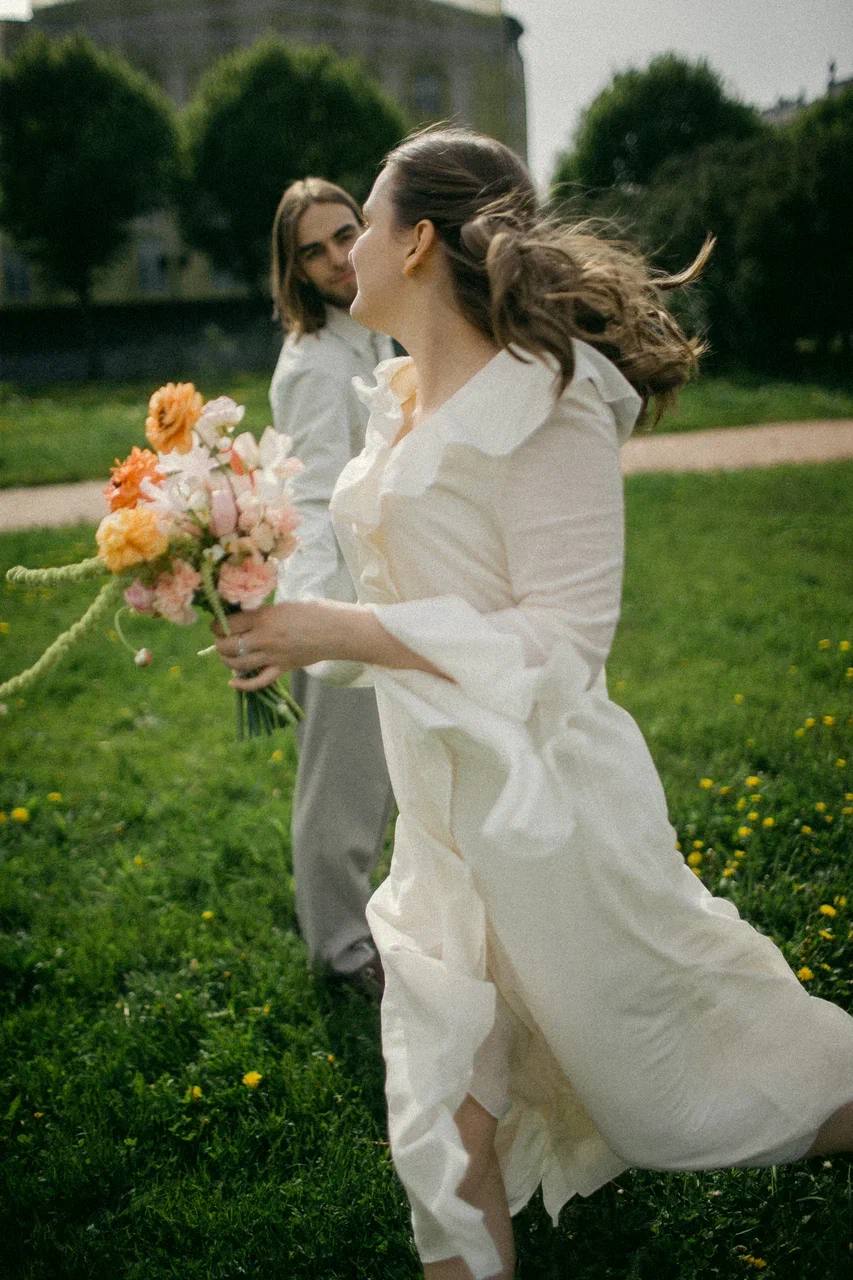 Для ЗАГСа я выбрала воздушное платье из жатой вискозы петербургского бренда MY812 и контрастные туфли из мастерской razumno, которые мне повезло поймать в последнем размере.