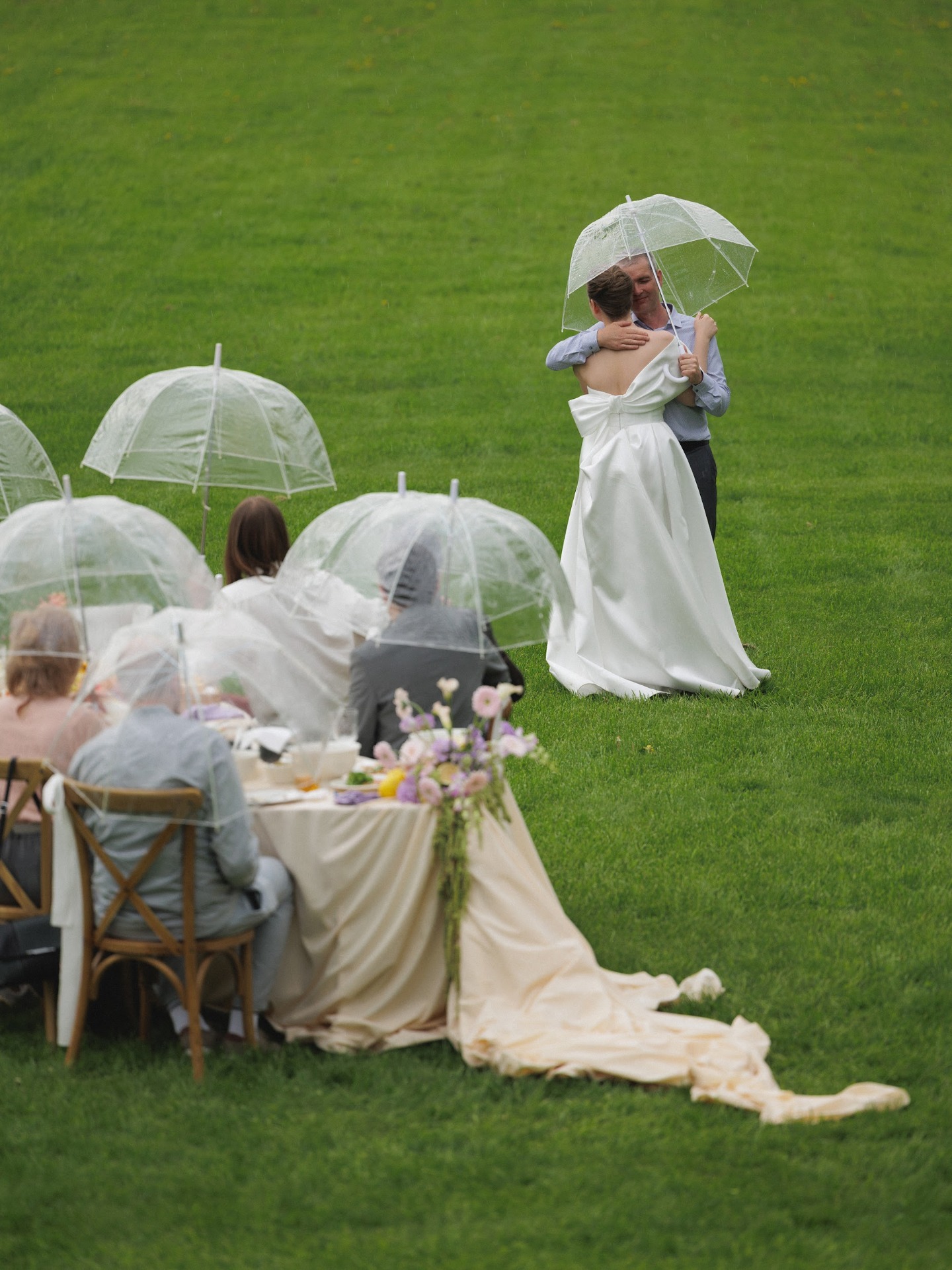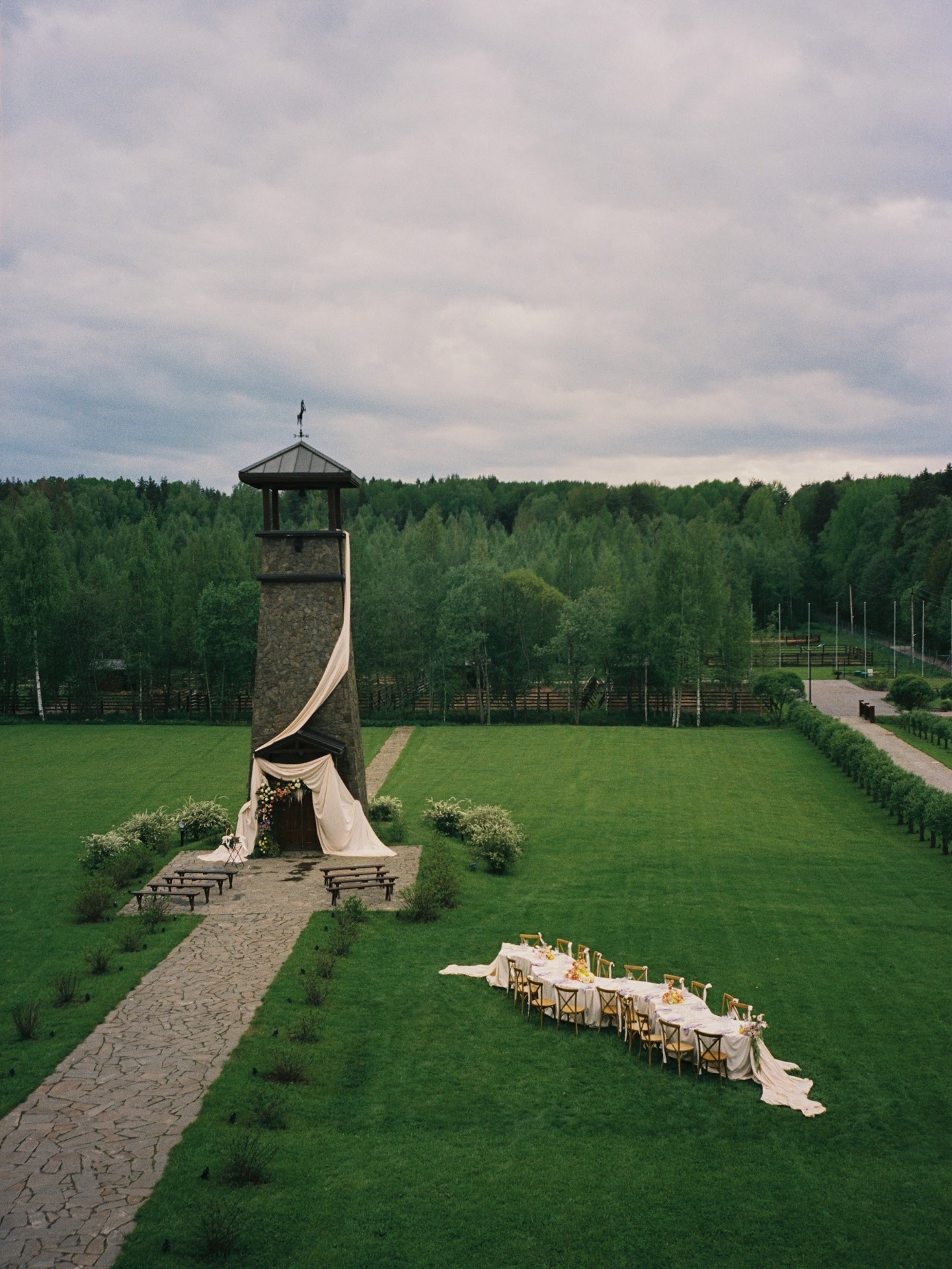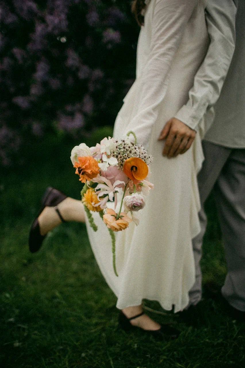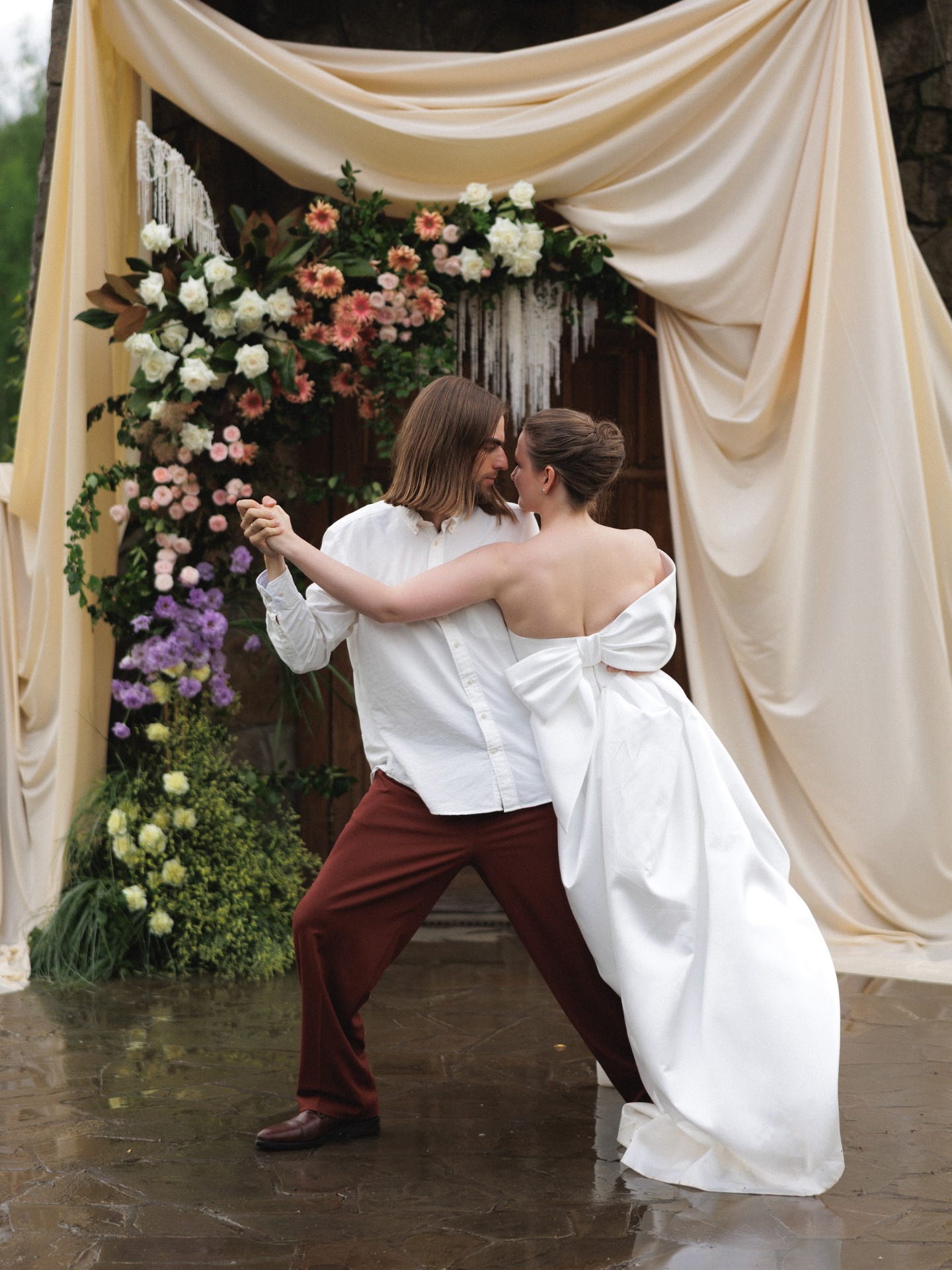 Вечер завершился ударом в колокол, танцами под дождём и снимками у промокшего праздничного стола. На прощание всю флористику мы собрали в букеты и подарили гостям.
