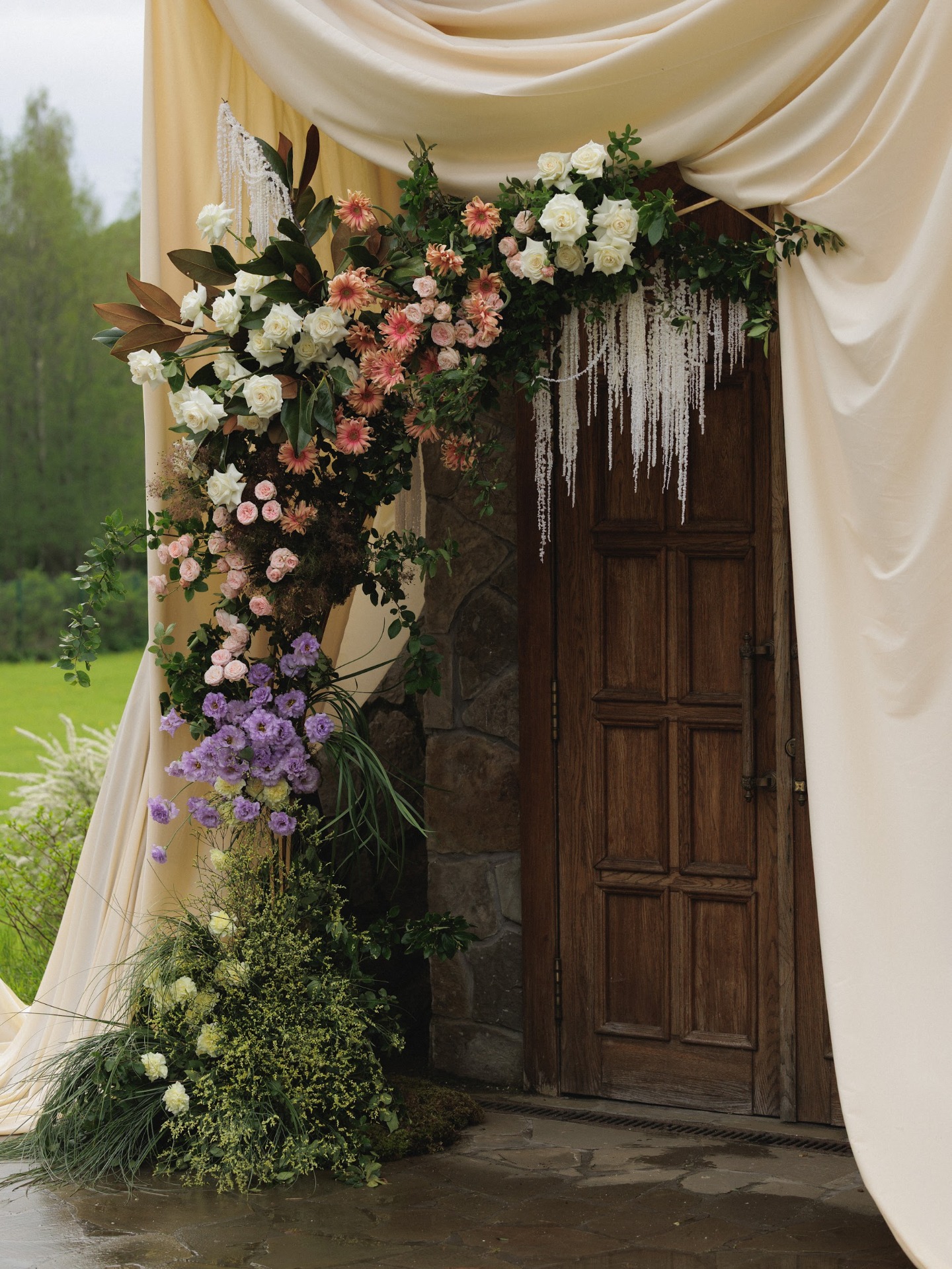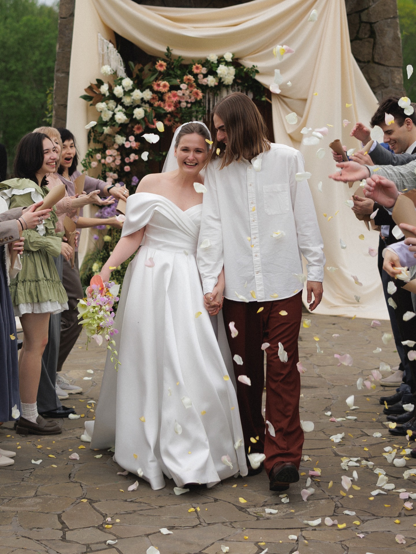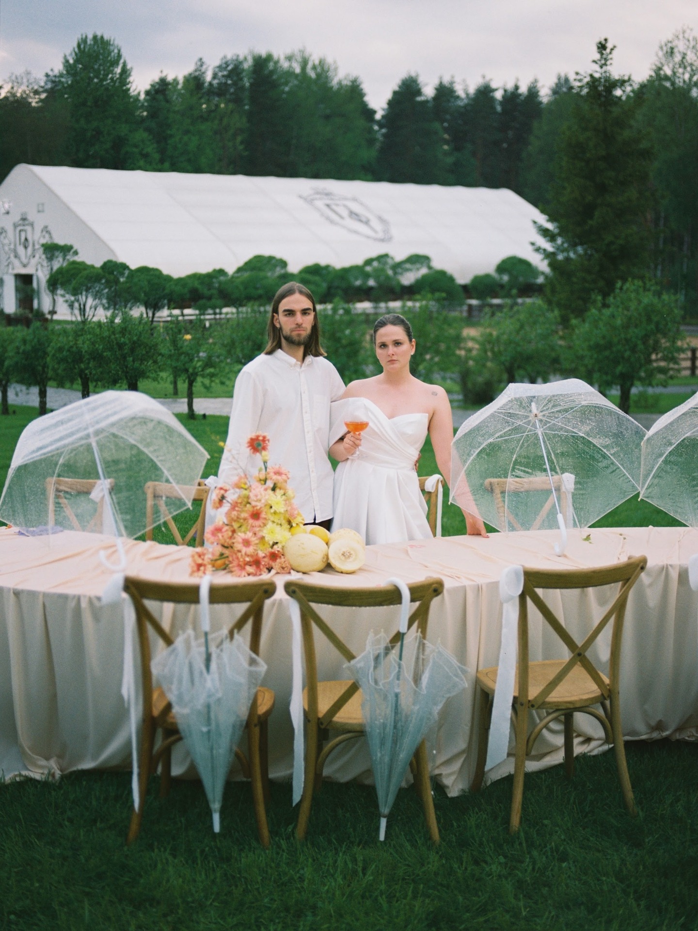 Вечер завершился ударом в колокол, танцами под дождём и снимками у промокшего праздничного стола. На прощание всю флористику мы собрали в букеты и подарили гостям.