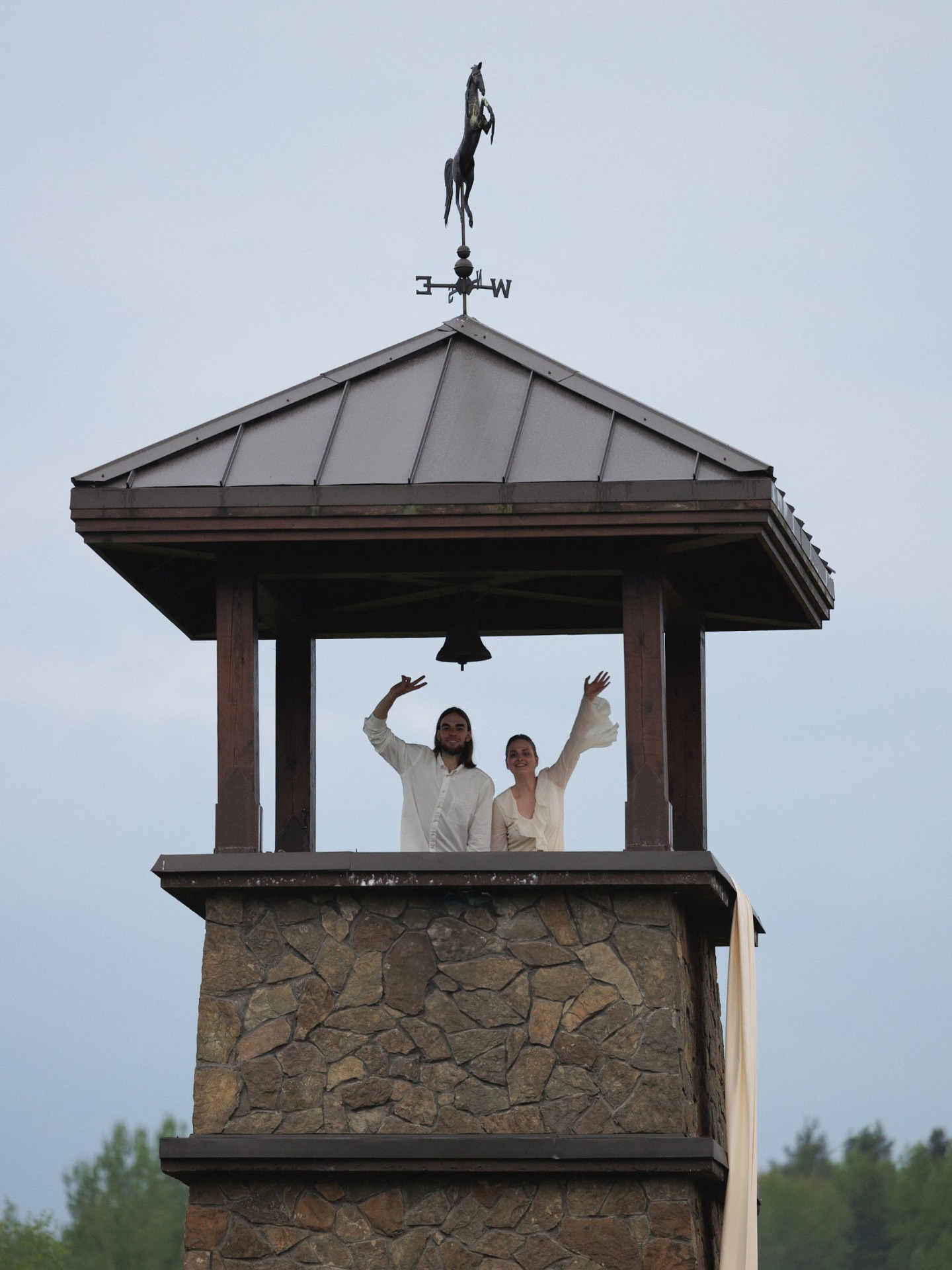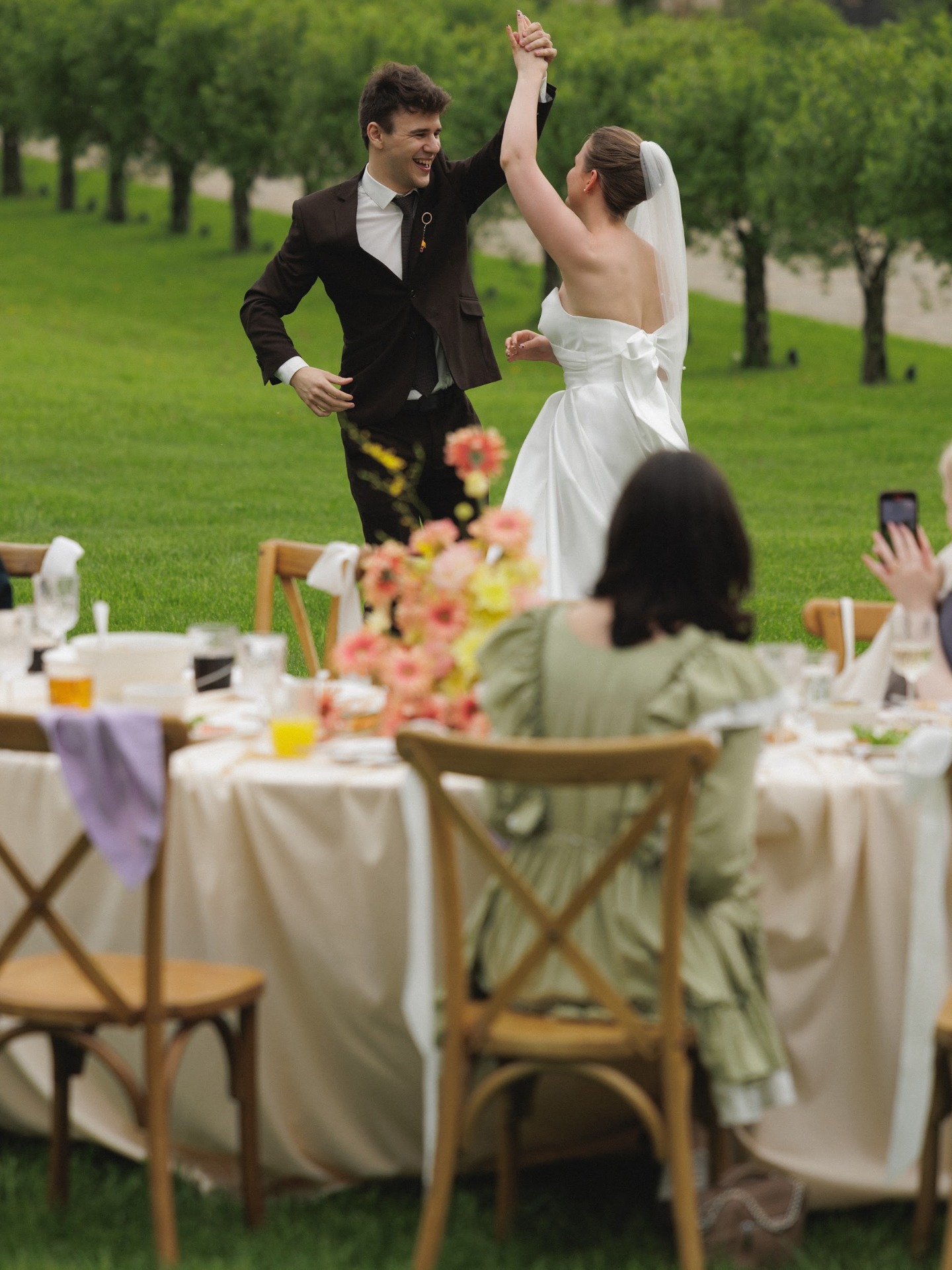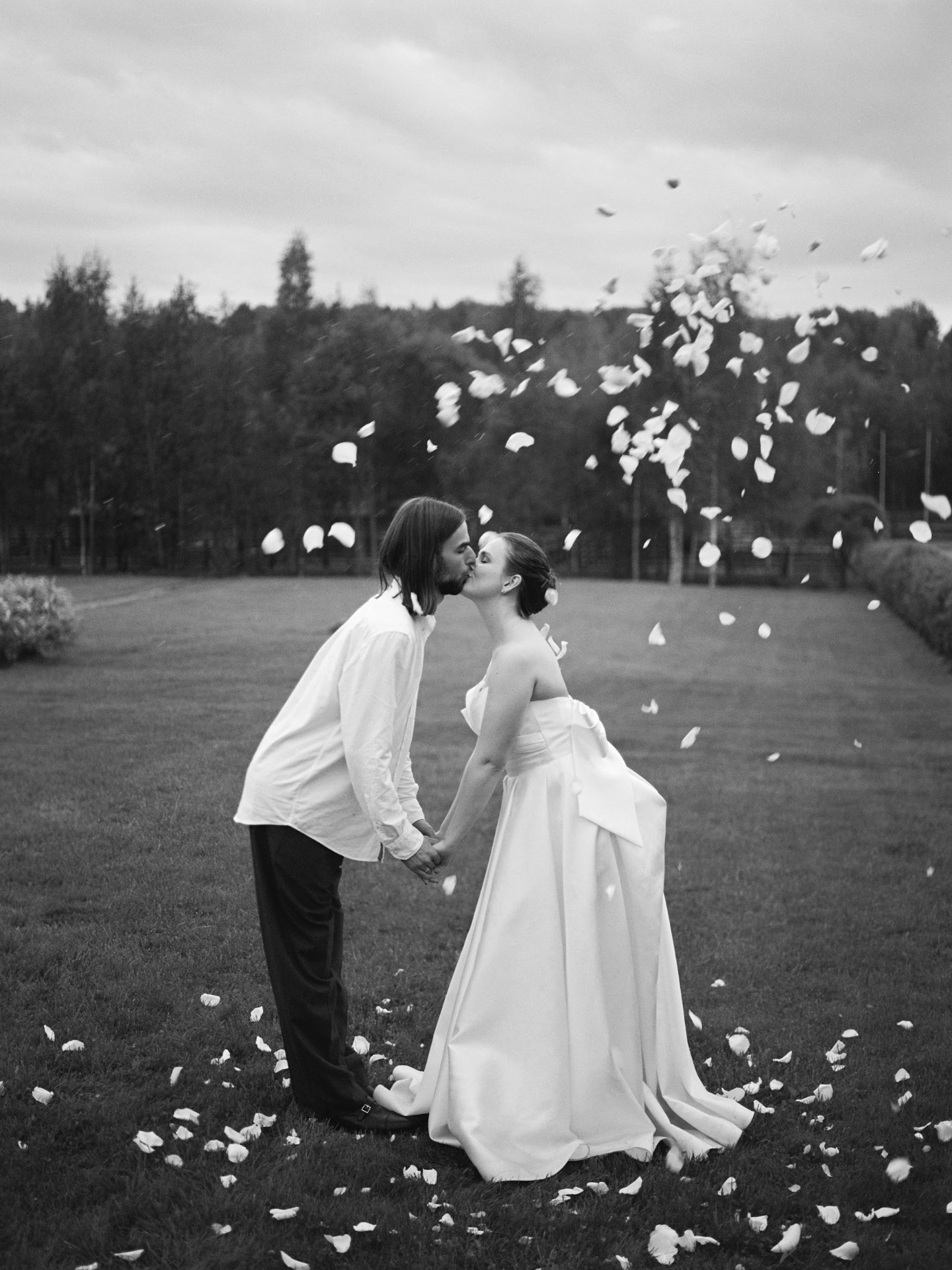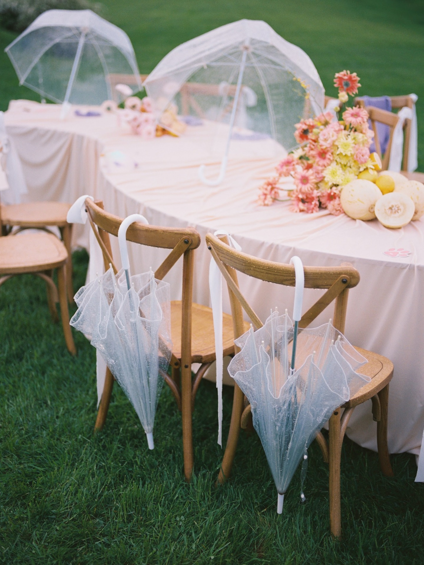 Вечер завершился ударом в колокол, танцами под дождём и снимками у промокшего праздничного стола. На прощание всю флористику мы собрали в букеты и подарили гостям.