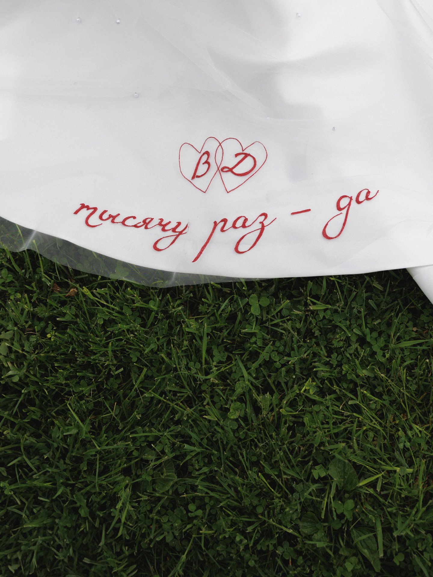 На утренней съёмке я была в кружевной комбинации от studio29. Основное свадебное платье нашлось с первой примерки в «Мэри Трюфель»: асимметричное, из благородного атласа, украшенное бантом. Фату для меня шили на заказ с жемчугом и вышивкой «Тысячу раз «да»» в цвет моих туфель. Эта фраза была завершающей в моей клятве Диме.