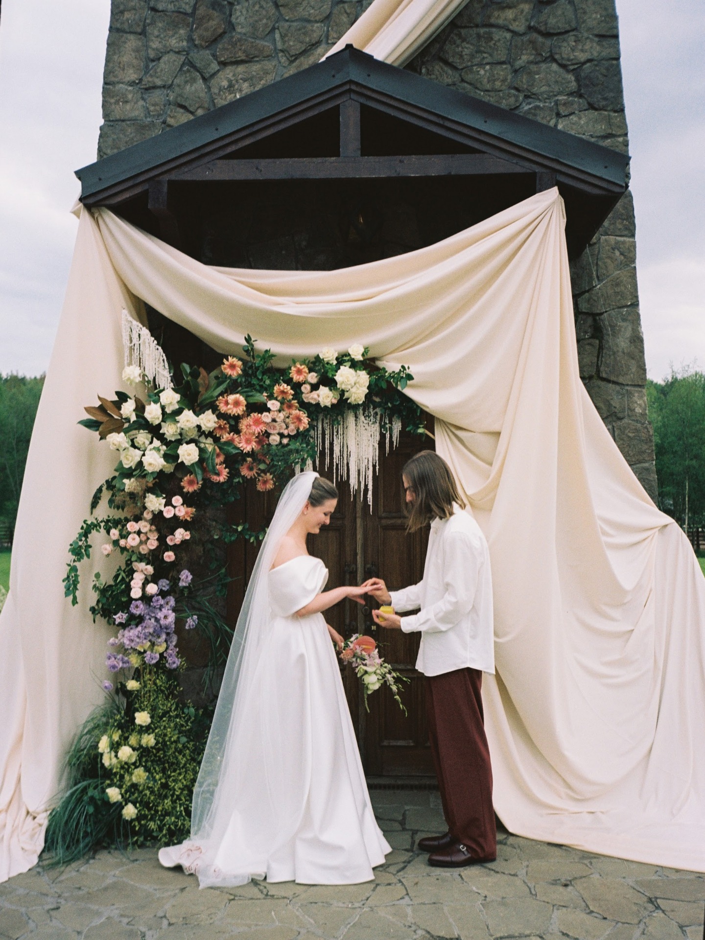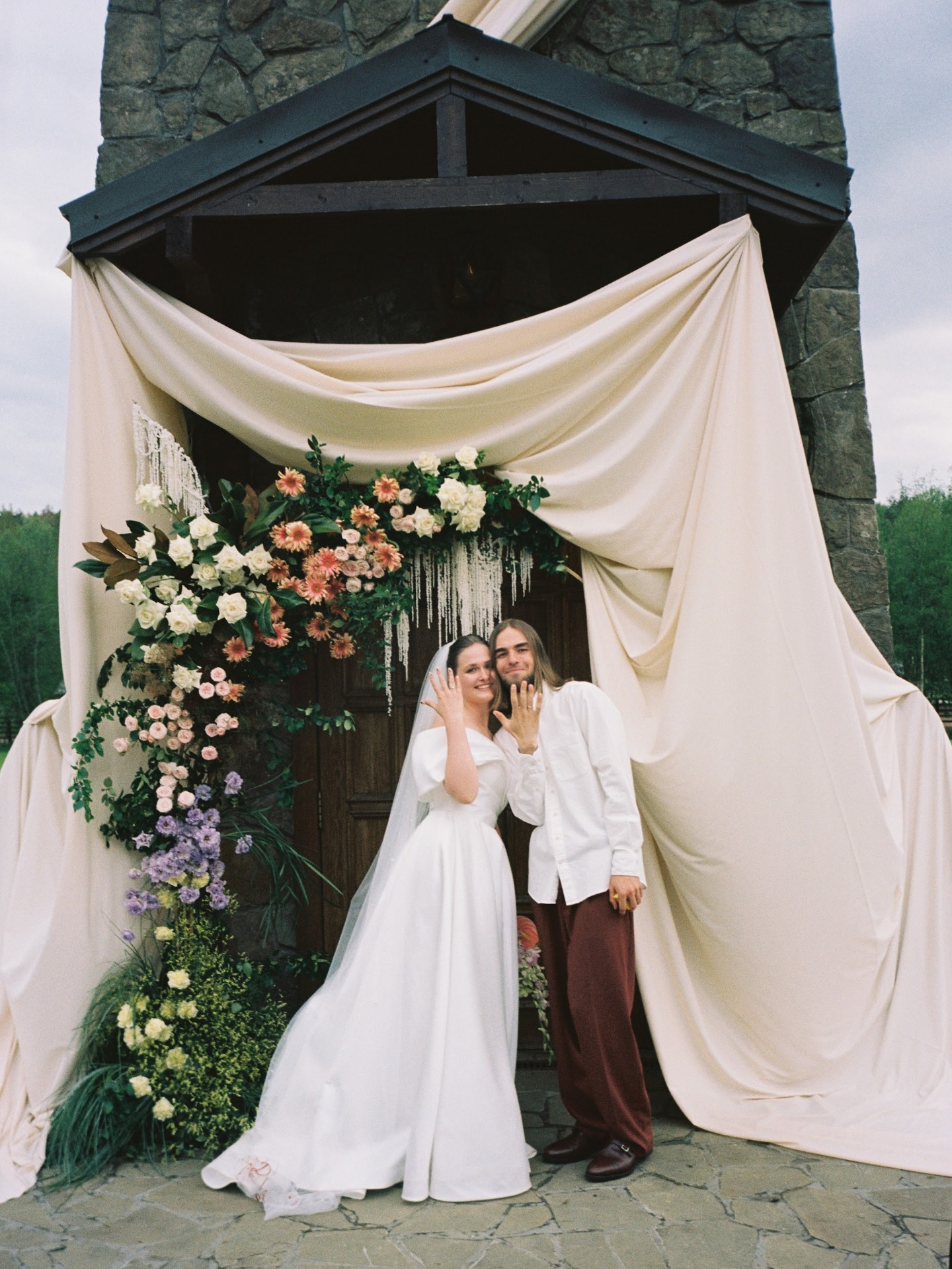 Церемония у башни под аркой из живых цветов стала любимым моментом Димы, благодаря трогательным клятвам и ритуалу согревания колец нашими родителями.