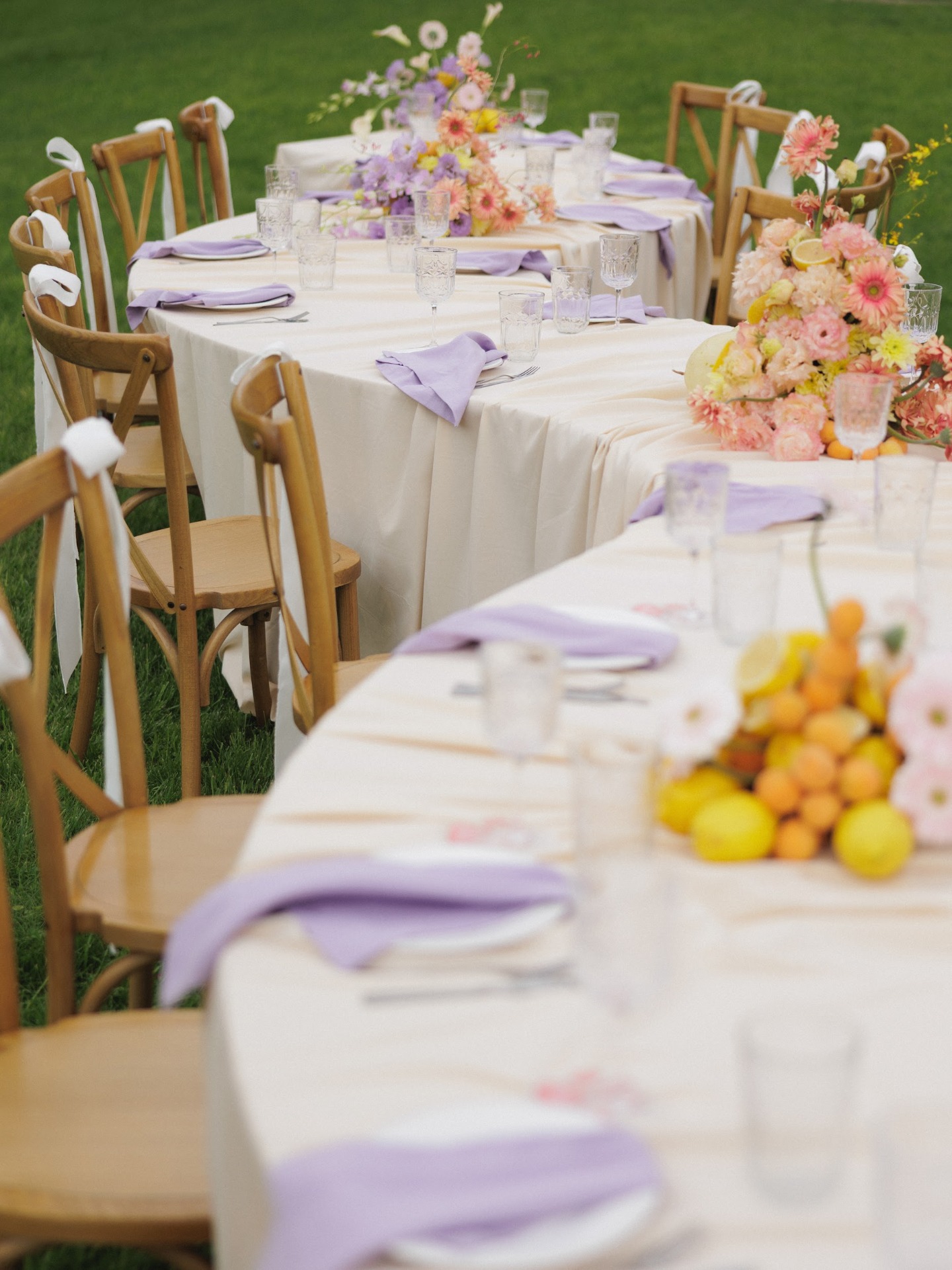 Так в антураже нашей свадьбы появились пастельные оттенки и ткани. На поляне мы решили поставить волнообразный общий стол — как мой личный символ любви к воде.