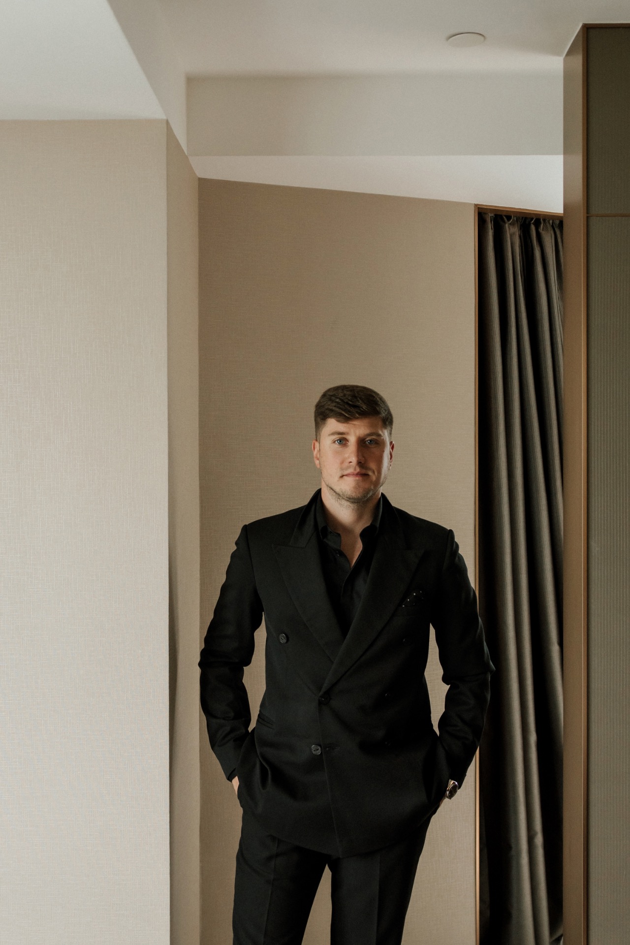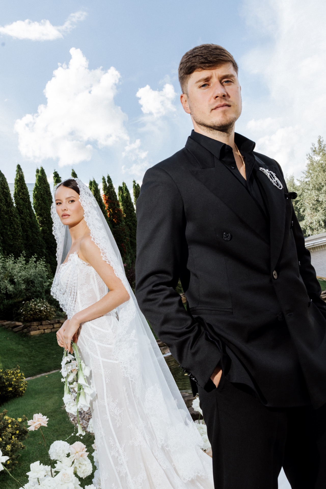 Андрей выбрал двубортный чёрный костюм, сшитый на заказ. Вместо классической бутоньерки он выбрал необычную брошь-булавку, которая отлично дополнила его образ.