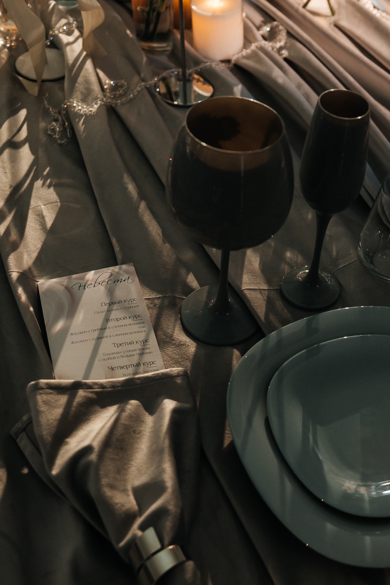 У нас была камерная свадьба, только для самых близких. Нам хотелось, чтобы этот вечер получился душевным, как тёплые семейные посиделки, без изнурительных конкурсов и принуждения. Так всё и вышло. Программа была спокойной и в меру насыщенной, поэтому у нас было время пообщаться с гостями и действительно провести этот день вместе. Мы также выбрали один большой круглый стол для всех гостей. Это добавило празднику ещё больше семейной атмосферы.