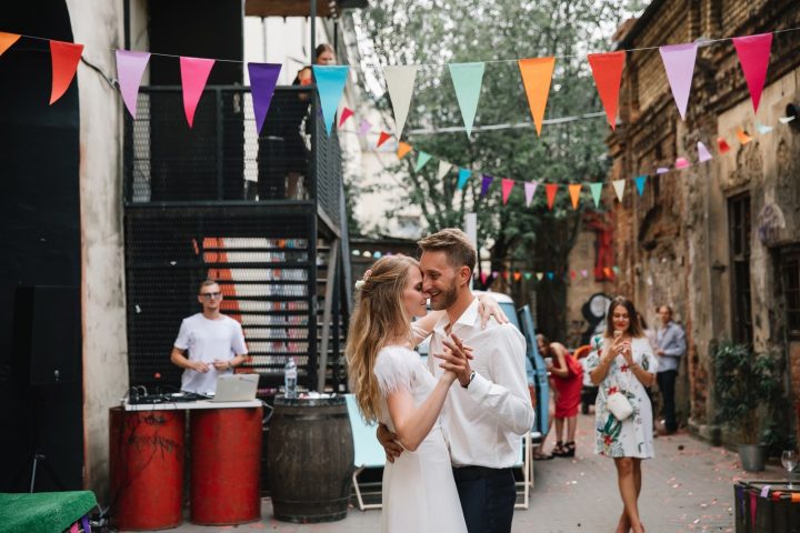 Пригласительные мы рассылали в электронном виде, выглядели они очень минималистично: на белом фоне текст и ряд смешных эмодзи. Площадку мы выбрали в самом сердце города. Это популярный ночной клуб «Танцплощадка». Никому даже в голову не могло прийти, что там получится такая атмосферная свадьба. Наша свадьба должна была быть вечеринкой для друзей с танцами и без неловких конкурсов. У «Танцплощадки» прекрасный зал и отличный дворик с баскетбольным кольцом. В день нашей свадьбы было жарко, так что практически всю вечеринку мы провели на улице.