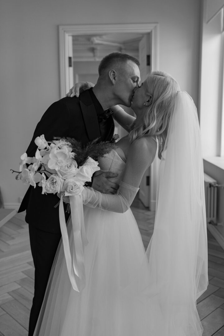 Сборы проходили в апартаментах, потому что хотелось свободы пространства и высоких потолков. Дом с атлантами идеально подходил под съемку и сборы. Чтобы отдохнуть, мы заселились туда на 3 дня заранее. День росписи в загсе, день свадьбы, день отдыха.