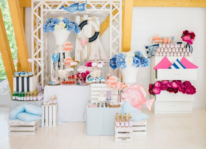 Таланты невесты и жениха организаторы использовали по максимуму. Нарисованный Ксенией венок из пионов превратился, с легкой руки декоратора, в необыкновенный штурвал, а синяя полоска, белоснежная палуба и нежная фуксия стали отправными точками декора.