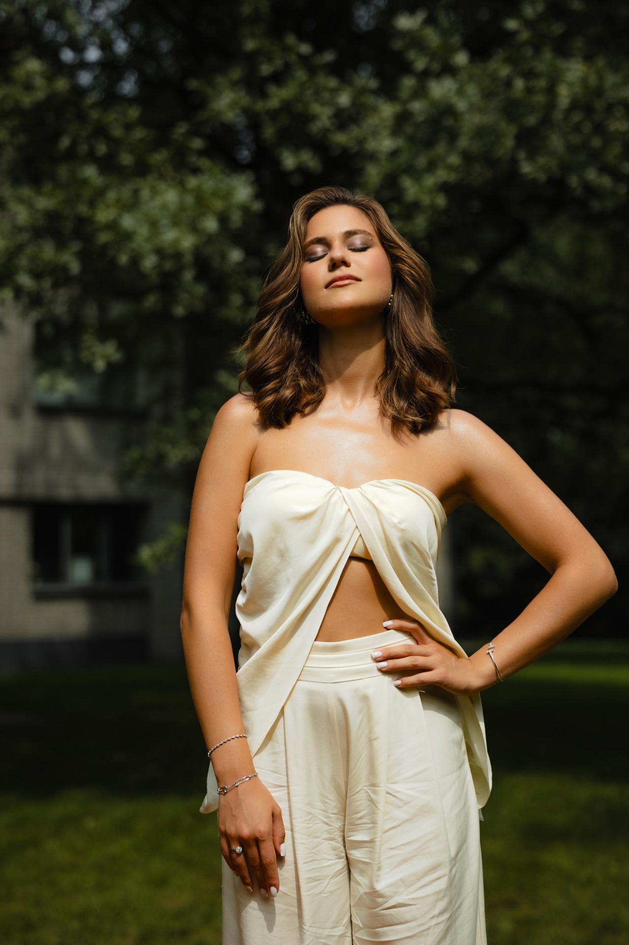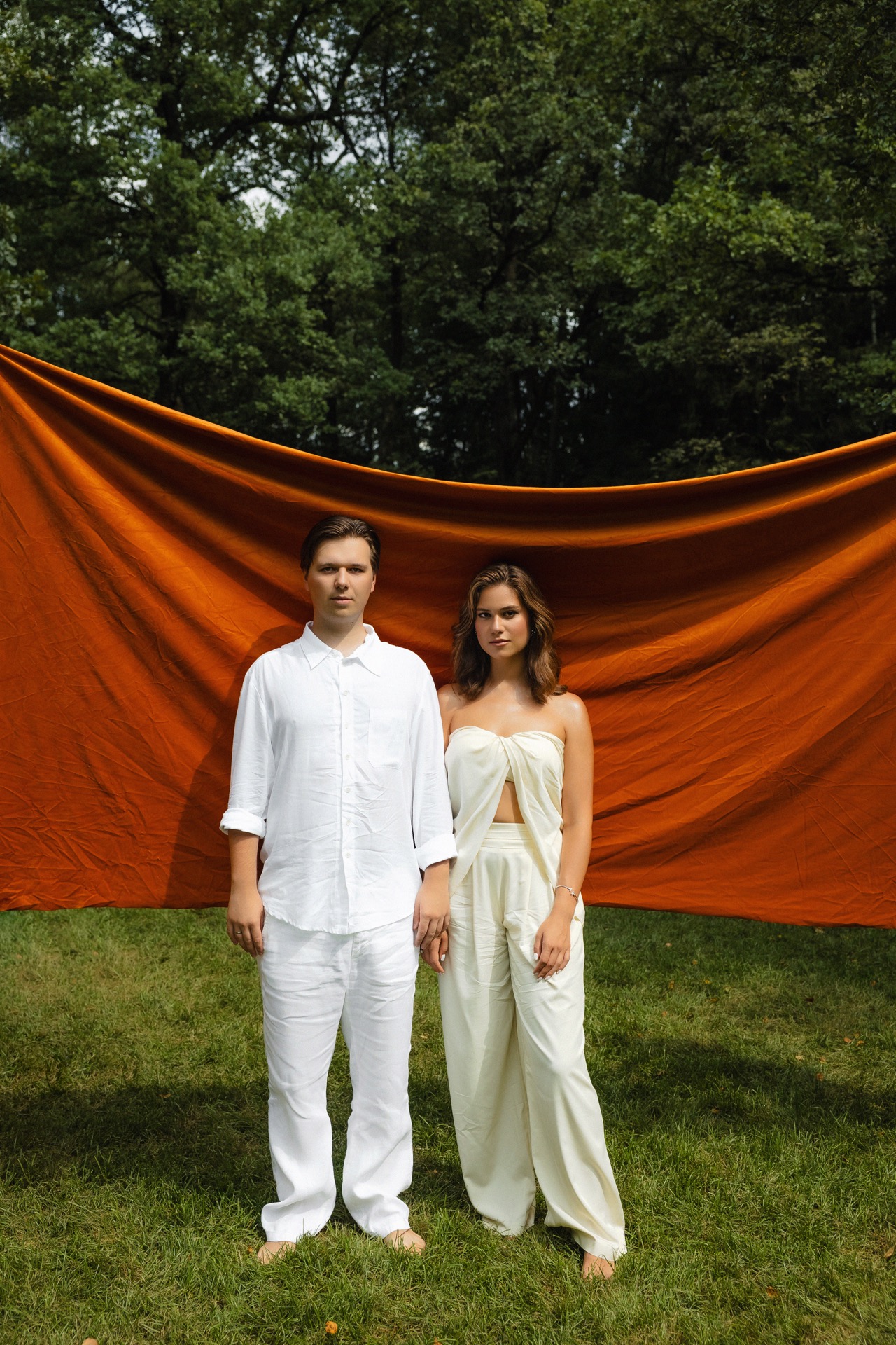 Невеста надела лёгкое винтажное платье с оттенком ретро, выбрала естественный макияж и мягкую укладку. Жених был в лаконичном костюме тёплого оттенка с акцентом на комфорт и натуральность фактур. Их образы не конкурировали с ярким визуальным фоном, а дополняли его своим спокойствием и индивидуальностью.