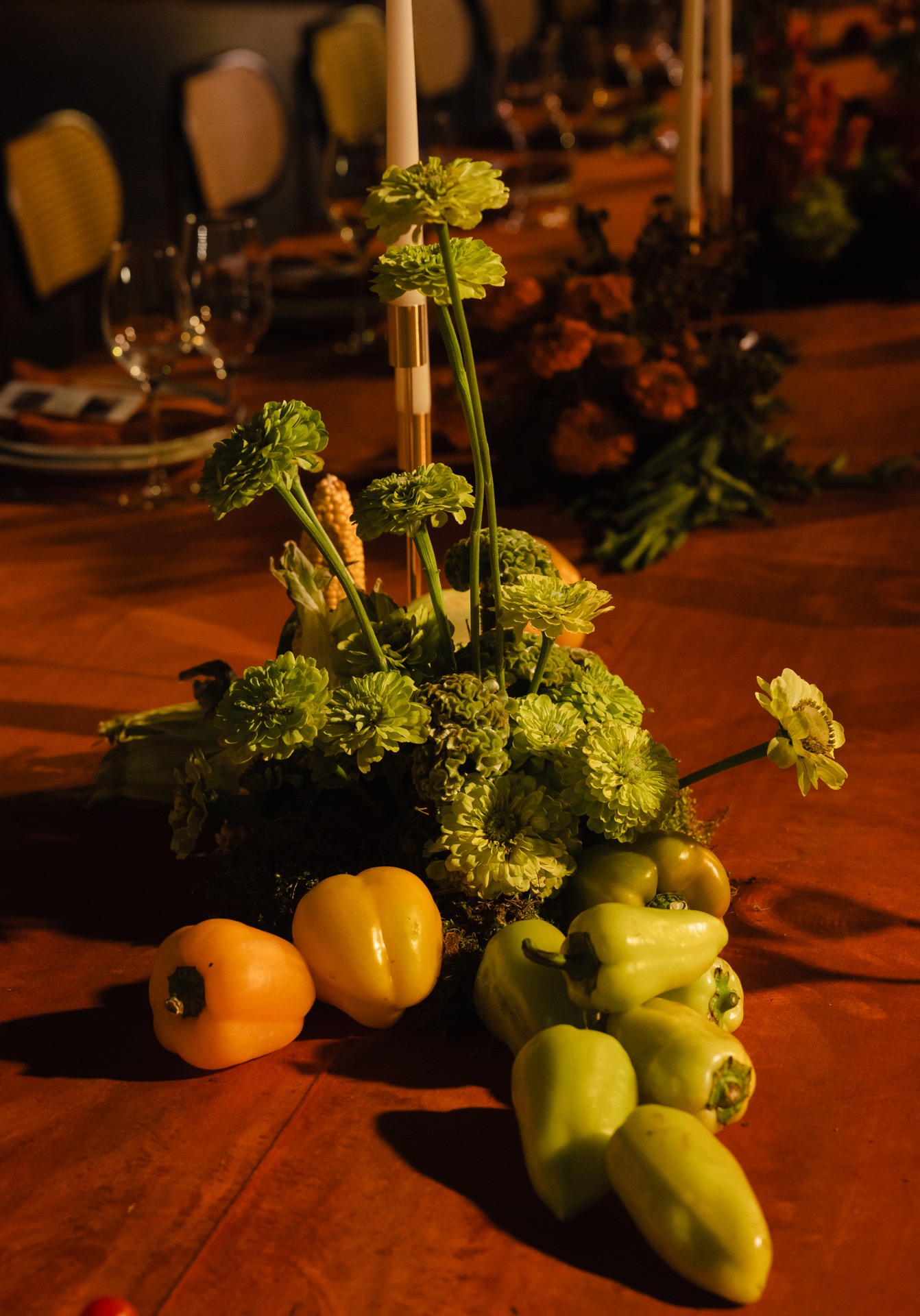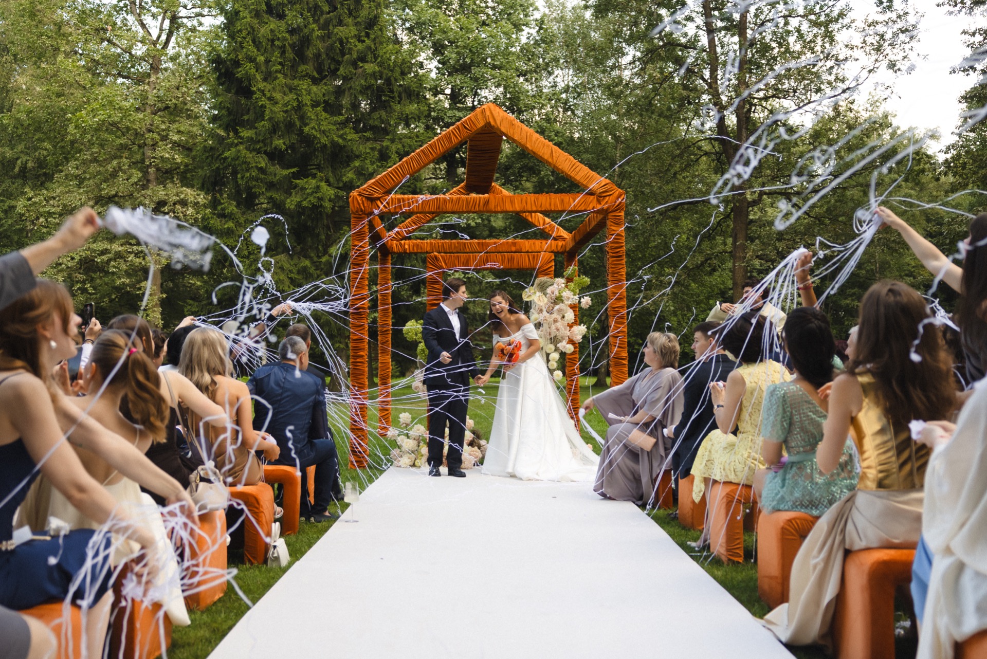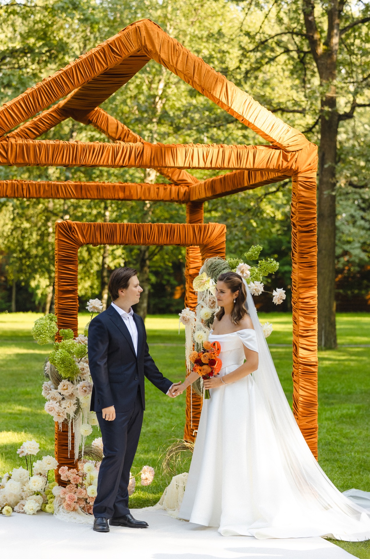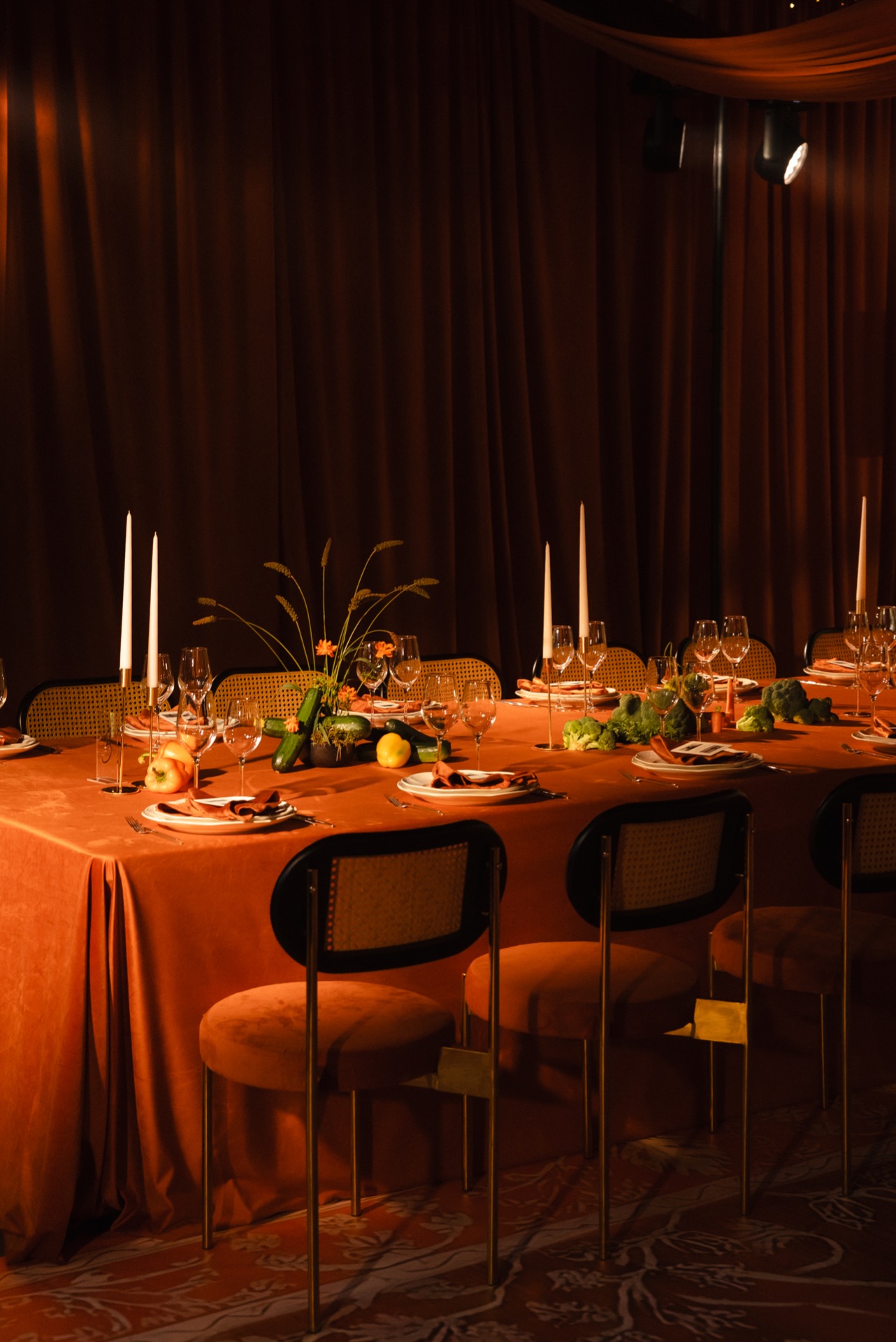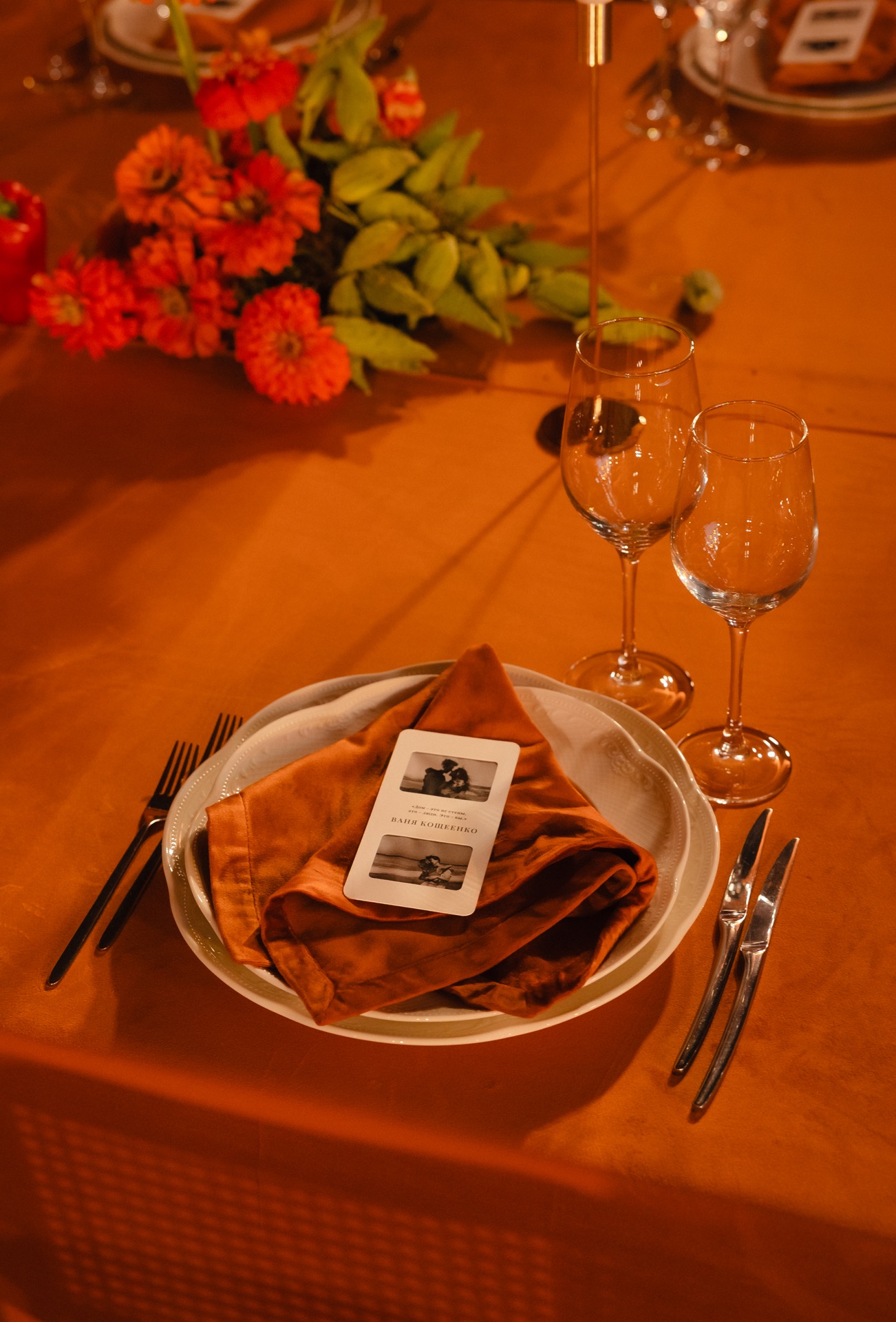 Главным визуальным решением стал оранжевый цвет — смелый, насыщенный и энергичный, он лёг в основу оформления, флористики и стилистических акцентов. Особенной деталью стали овощи в декоре — необычное, но тёплое и человечное решение, символизирующее заботу, дом и совместный быт.