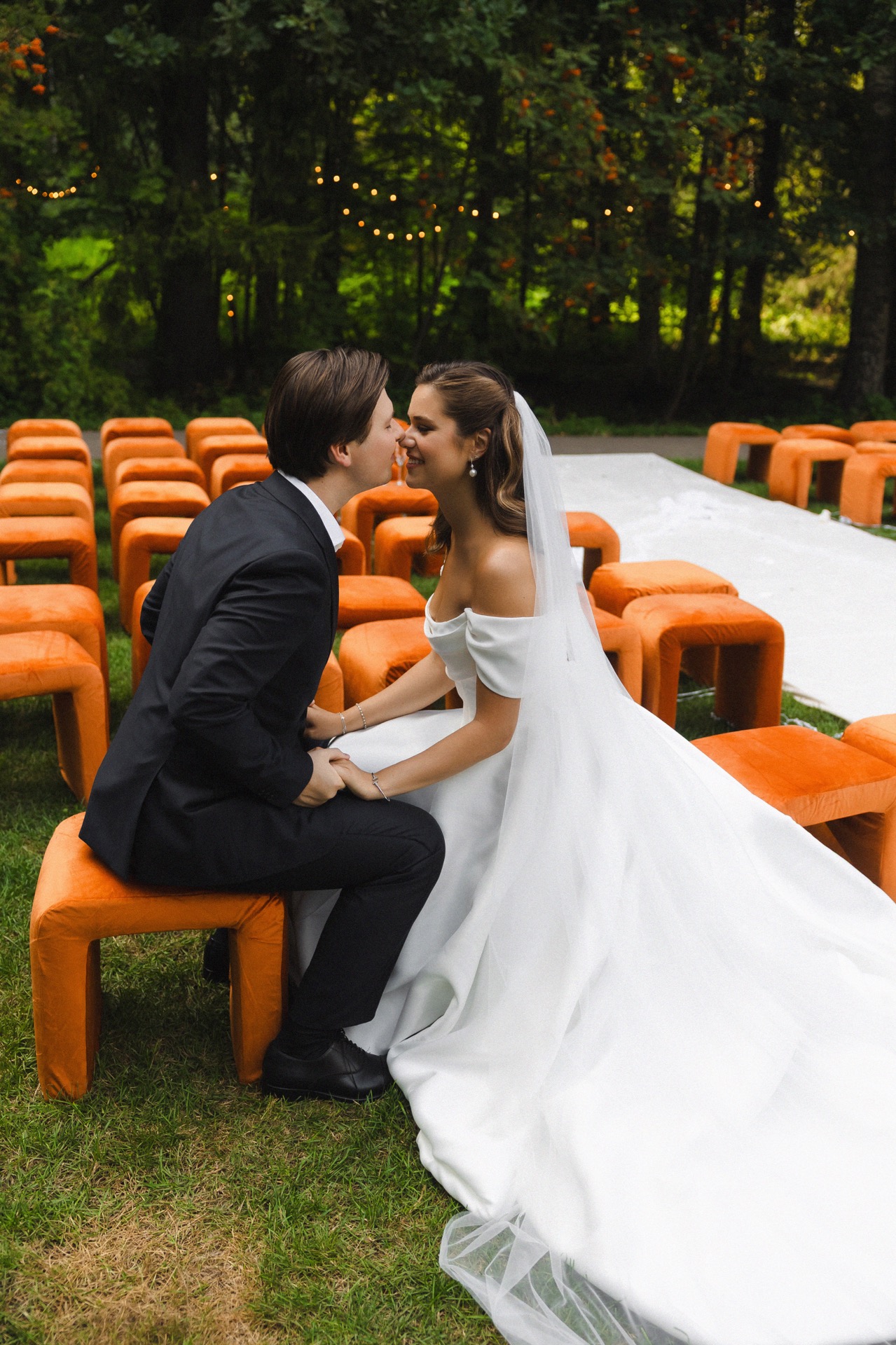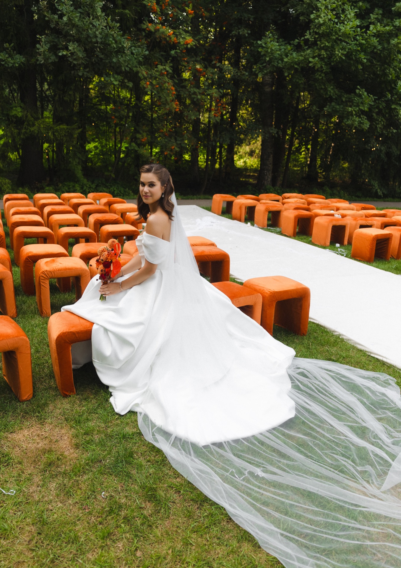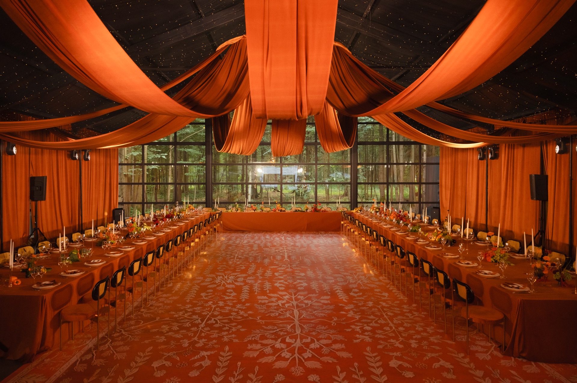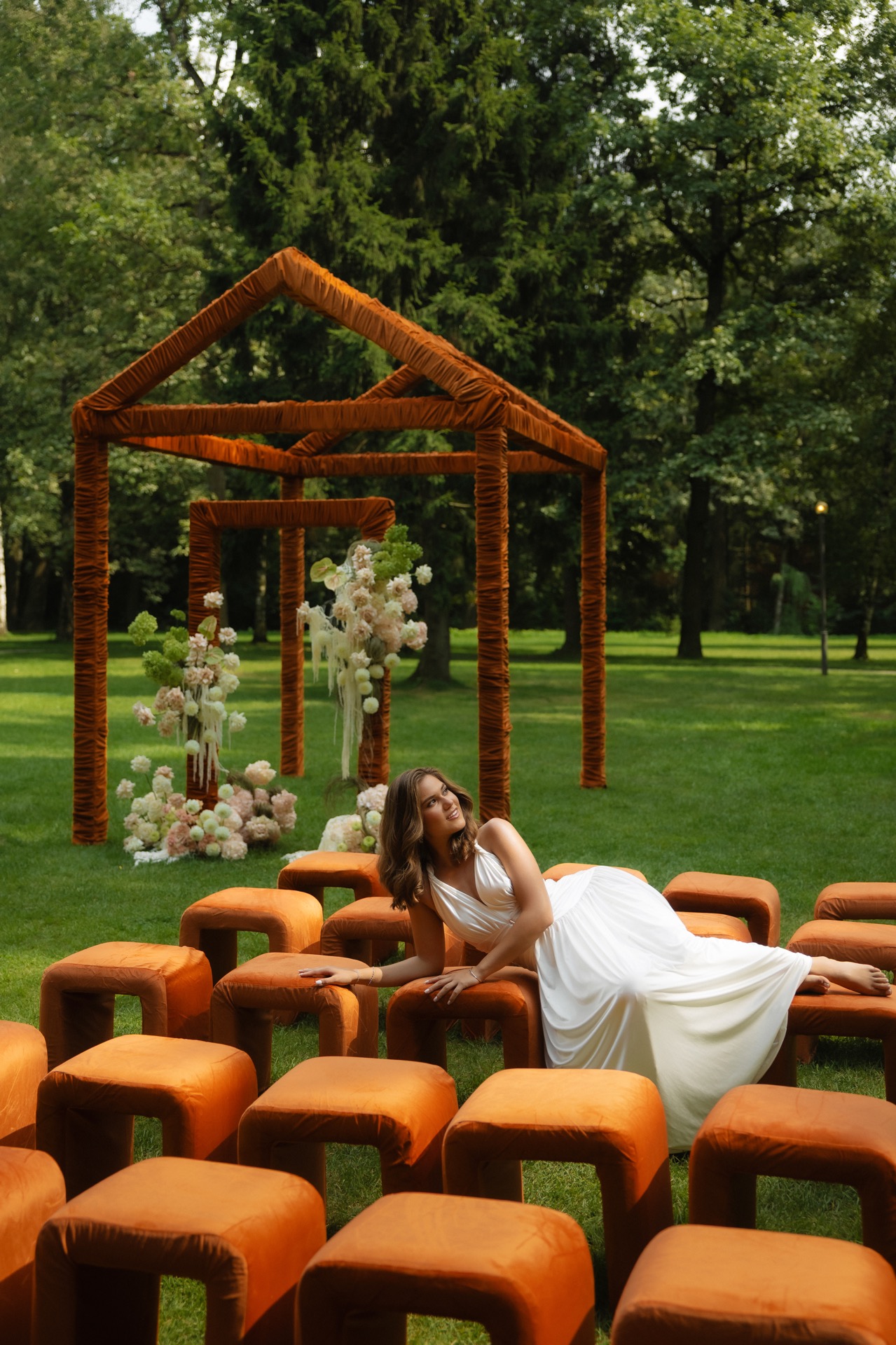 Главным визуальным решением стал оранжевый цвет — смелый, насыщенный и энергичный, он лёг в основу оформления, флористики и стилистических акцентов. Особенной деталью стали овощи в декоре — необычное, но тёплое и человечное решение, символизирующее заботу, дом и совместный быт.