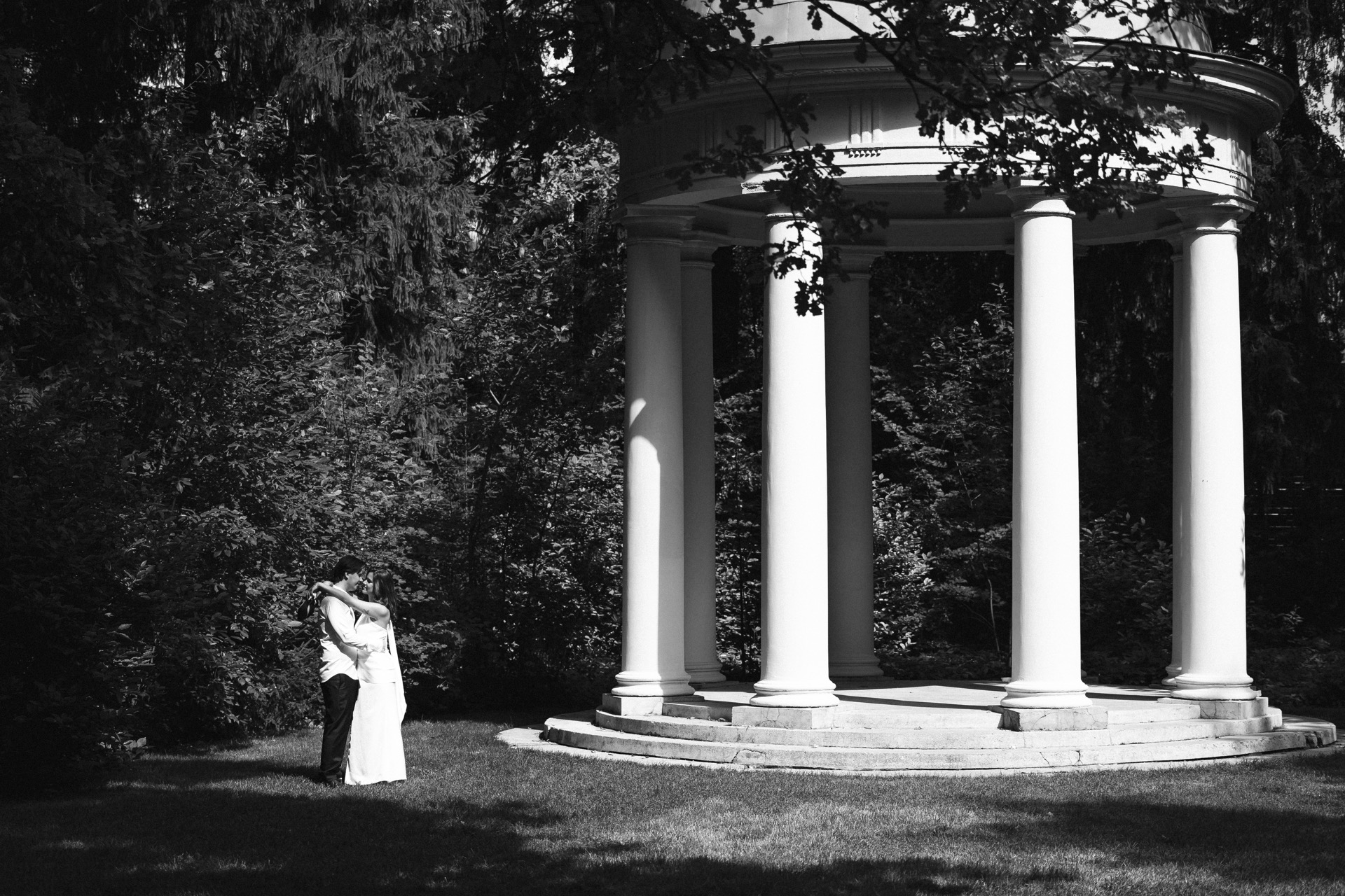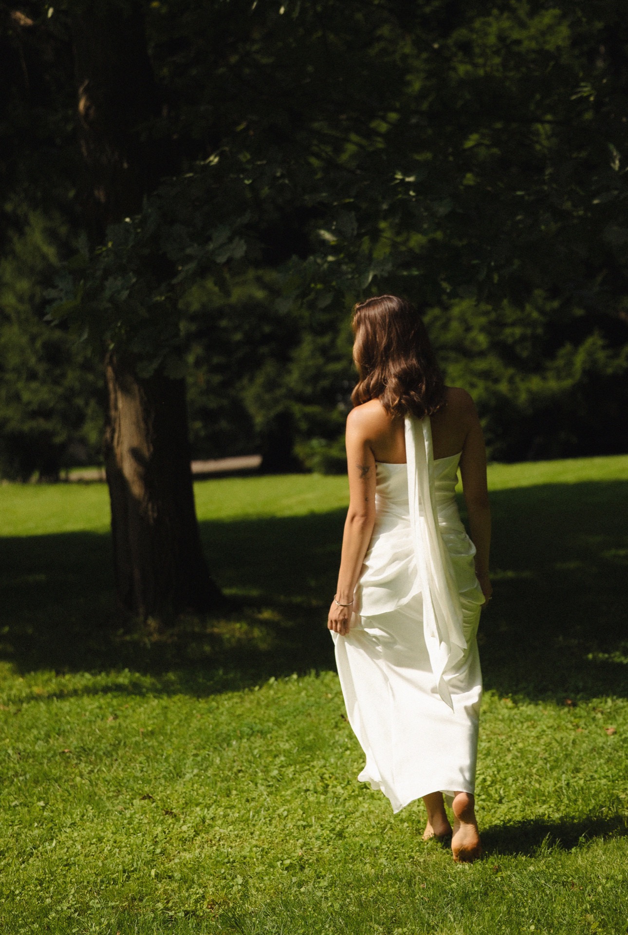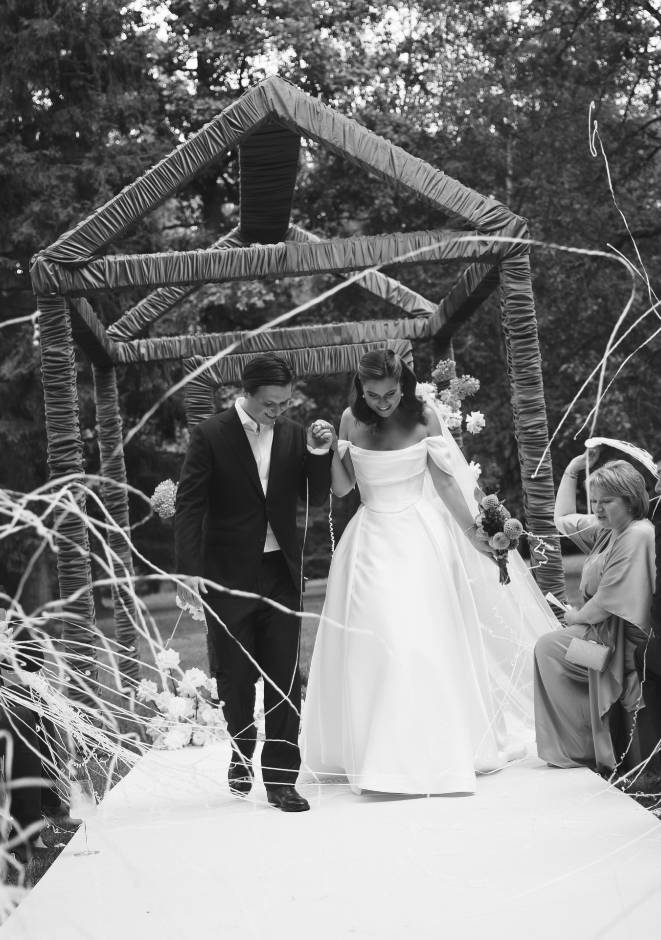 Особое внимание мы уделили деталям, которые раскрывали характер пары: плёночные фотоаппараты, которыми гости пользовались в течение дня; наушники с записями, где жених и невеста рассказывали друг о друге, подарки для гостей — семена базилика и анютиных глазок как символ будущего, заботы и роста; торшеры с фотографиями пары, которые не только украшали пространство, но и создавали ту самую домашнюю, тёплую атмосферу.