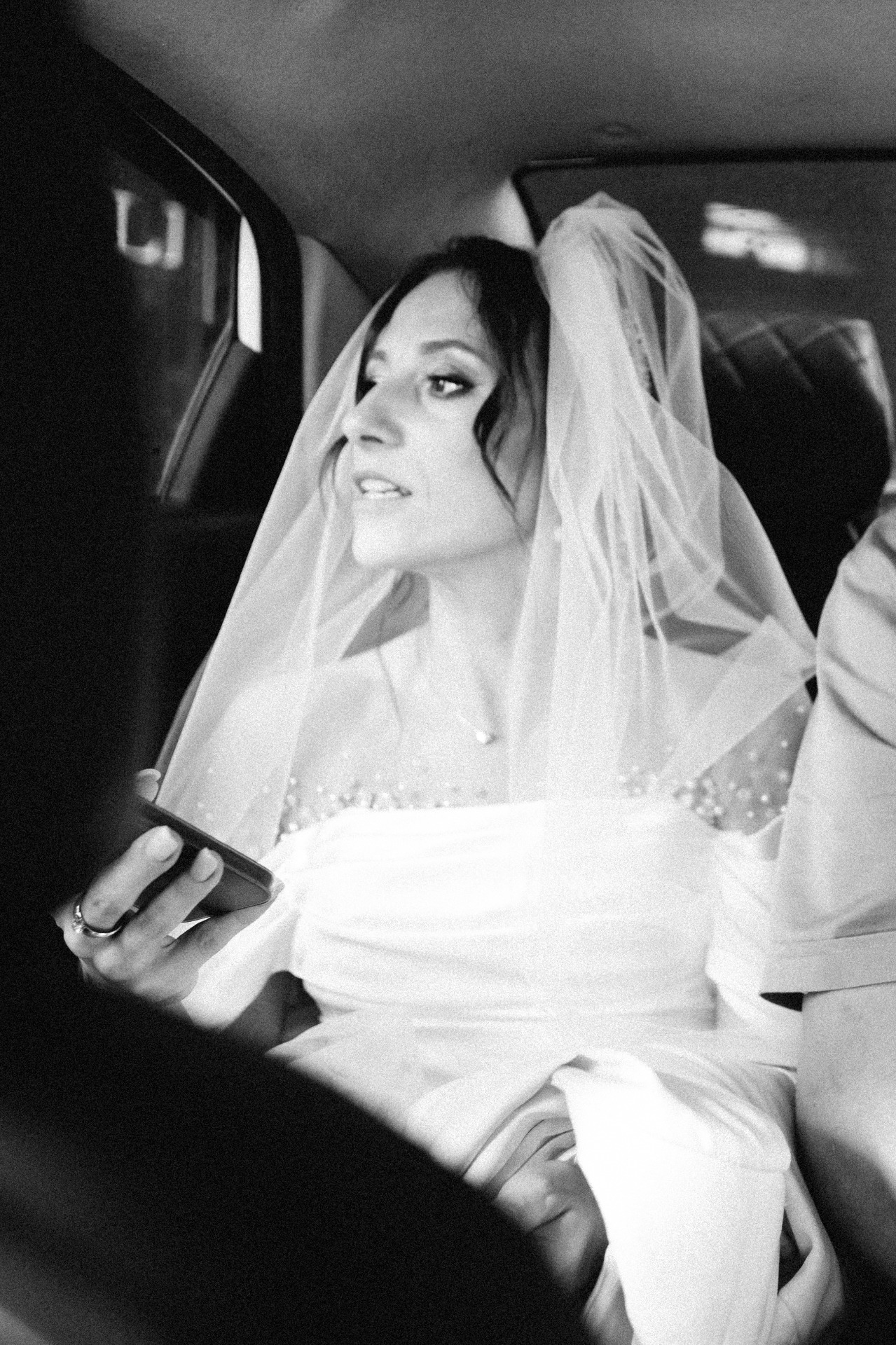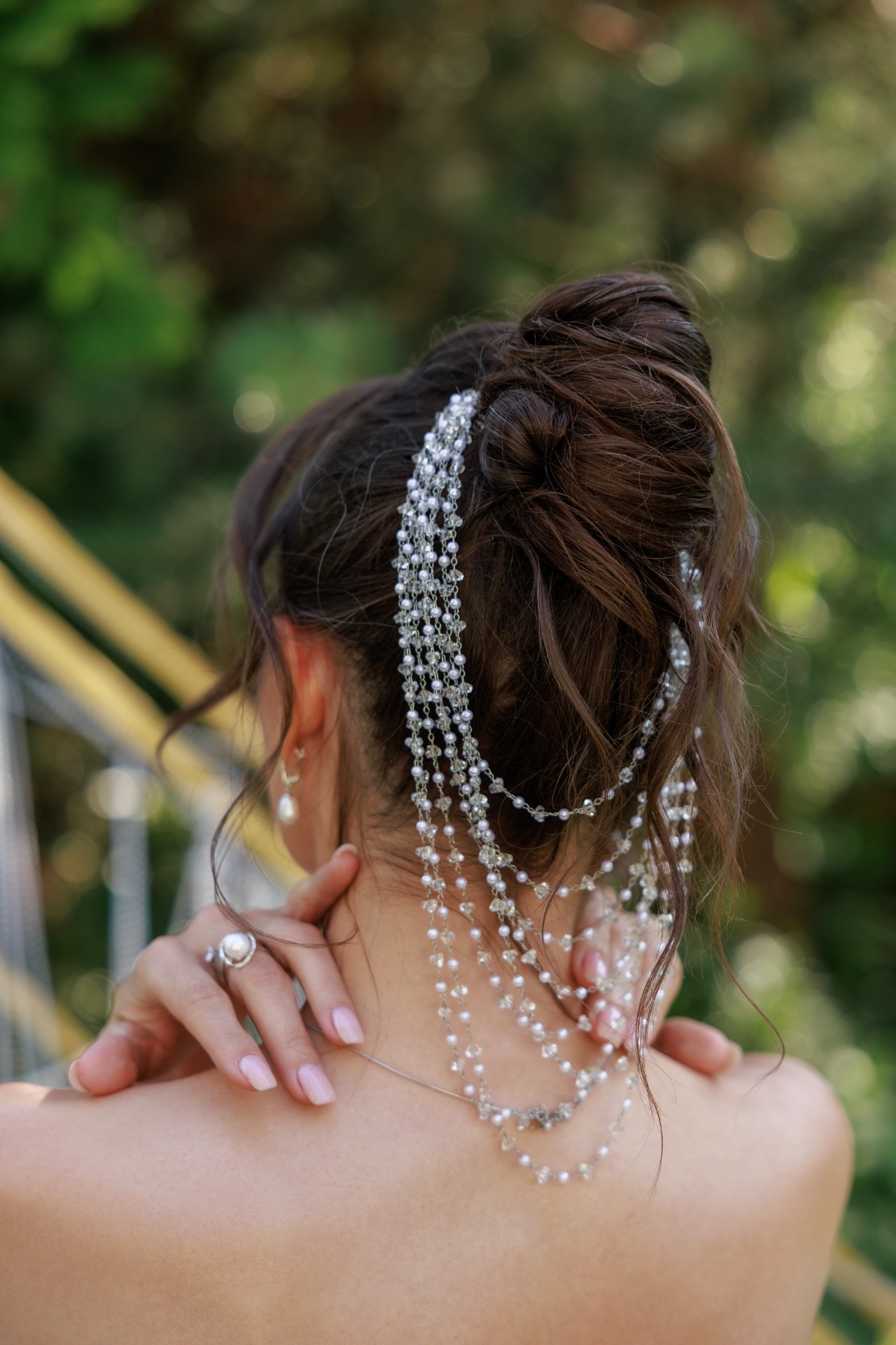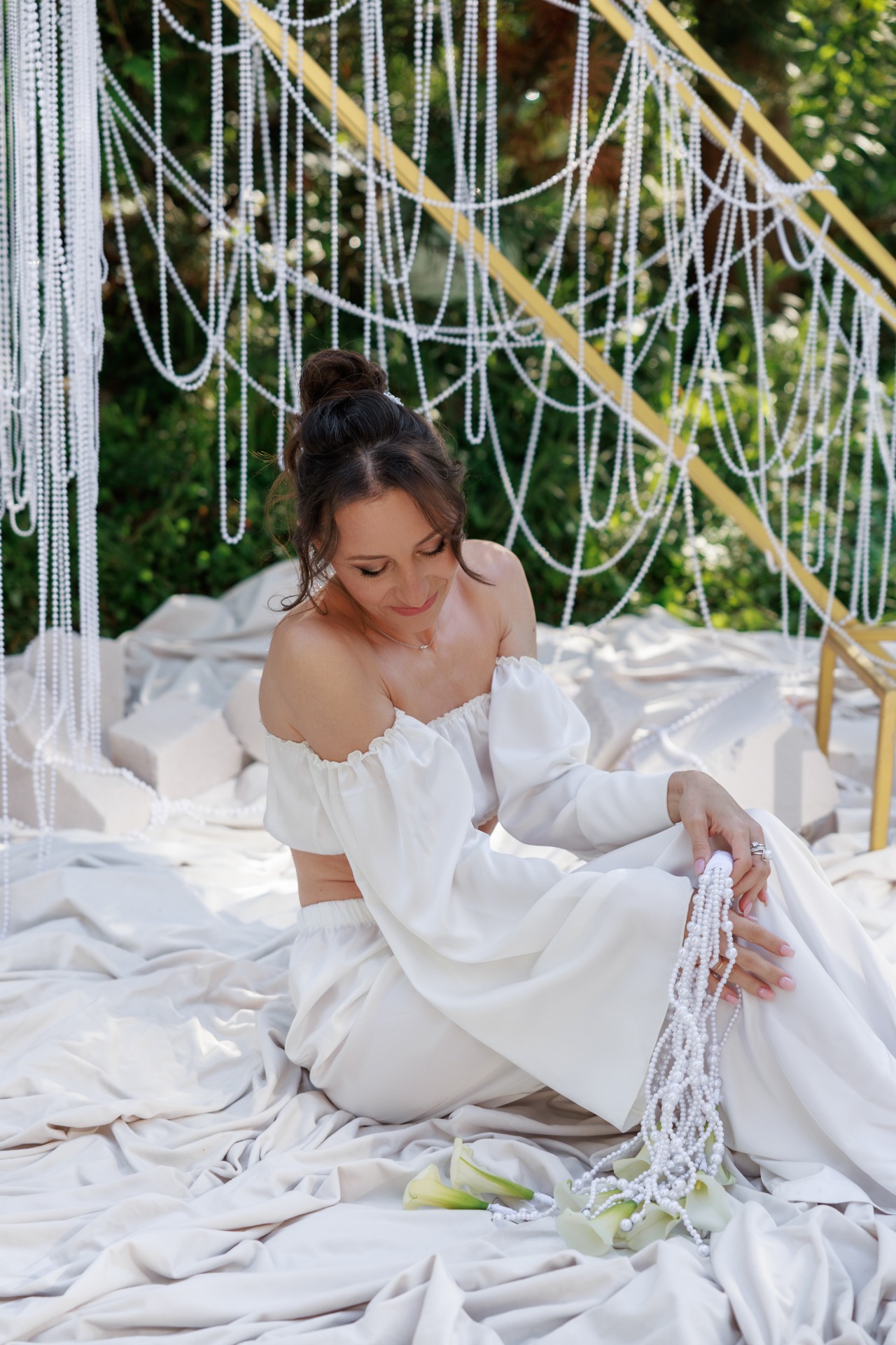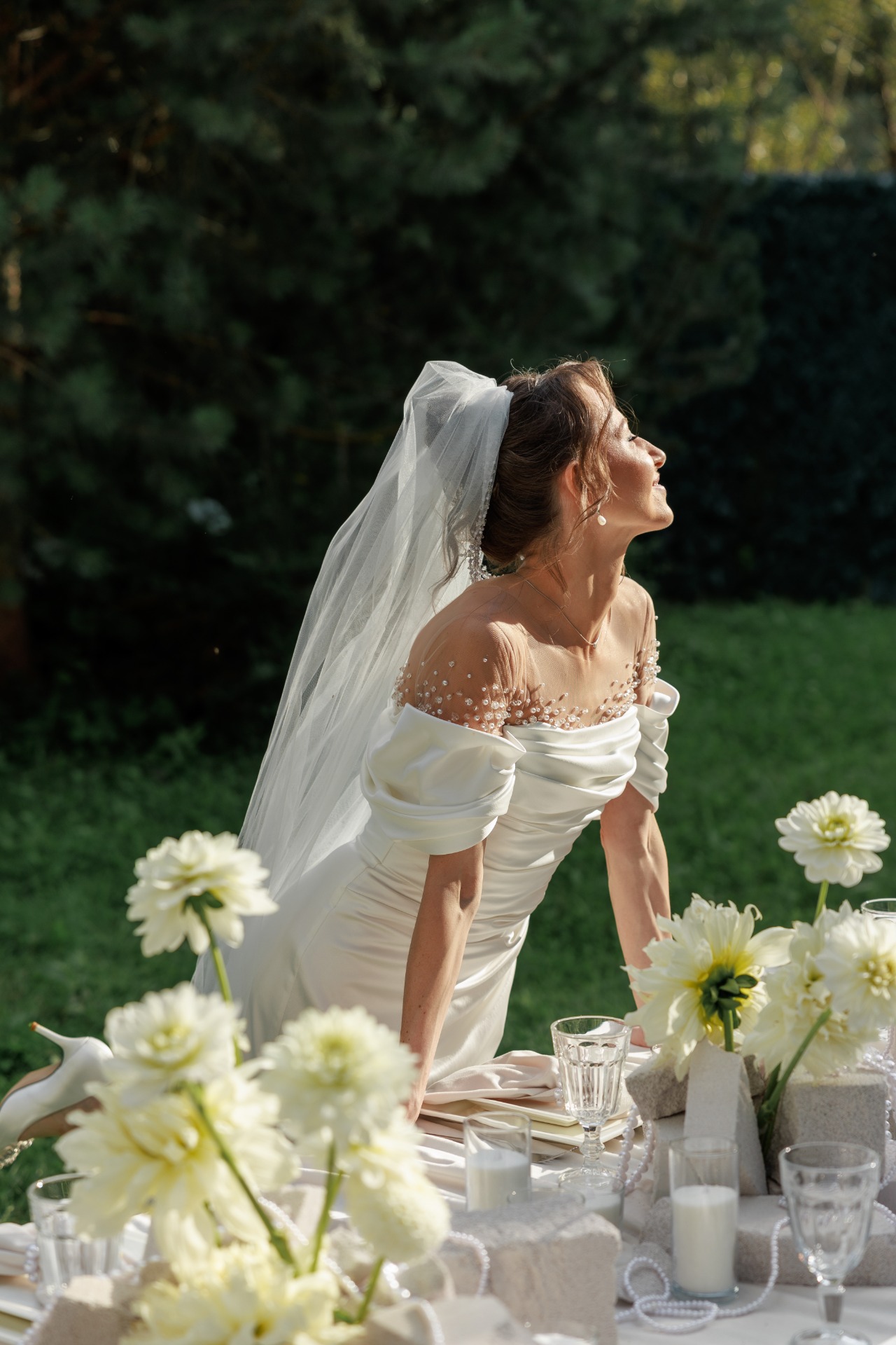 Я была против фаты, но без неё образ казался незавершённым. Поэтому мы выбрали простой вариант средней длины, который крепился поверх высокого пучка, дополняя рок-н-ролльный образ. А снизу под фатой очень красиво смотрелись бусы из стекляруса. Туфли были куплены в том же салоне, так как идеально подошли к тону платья.