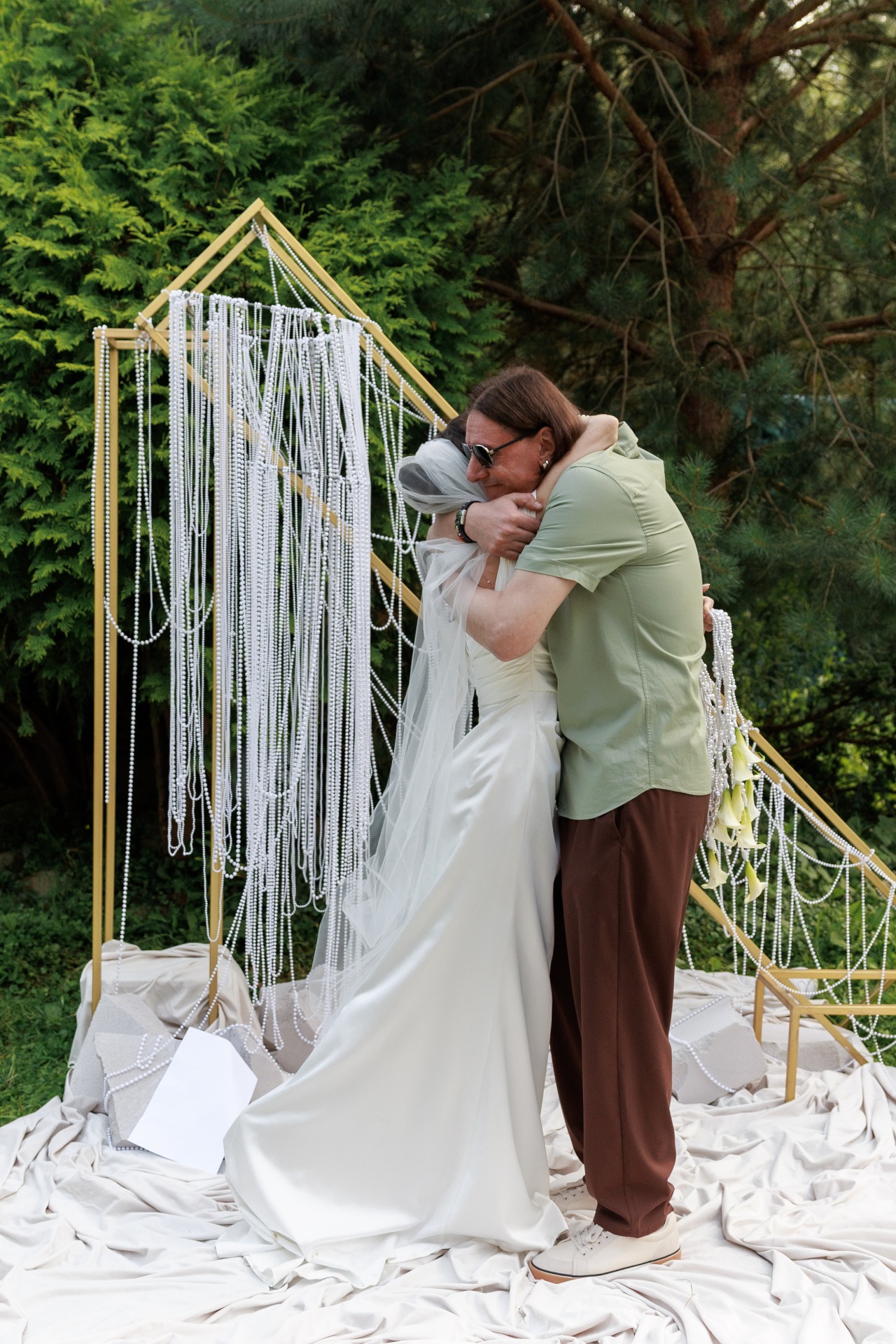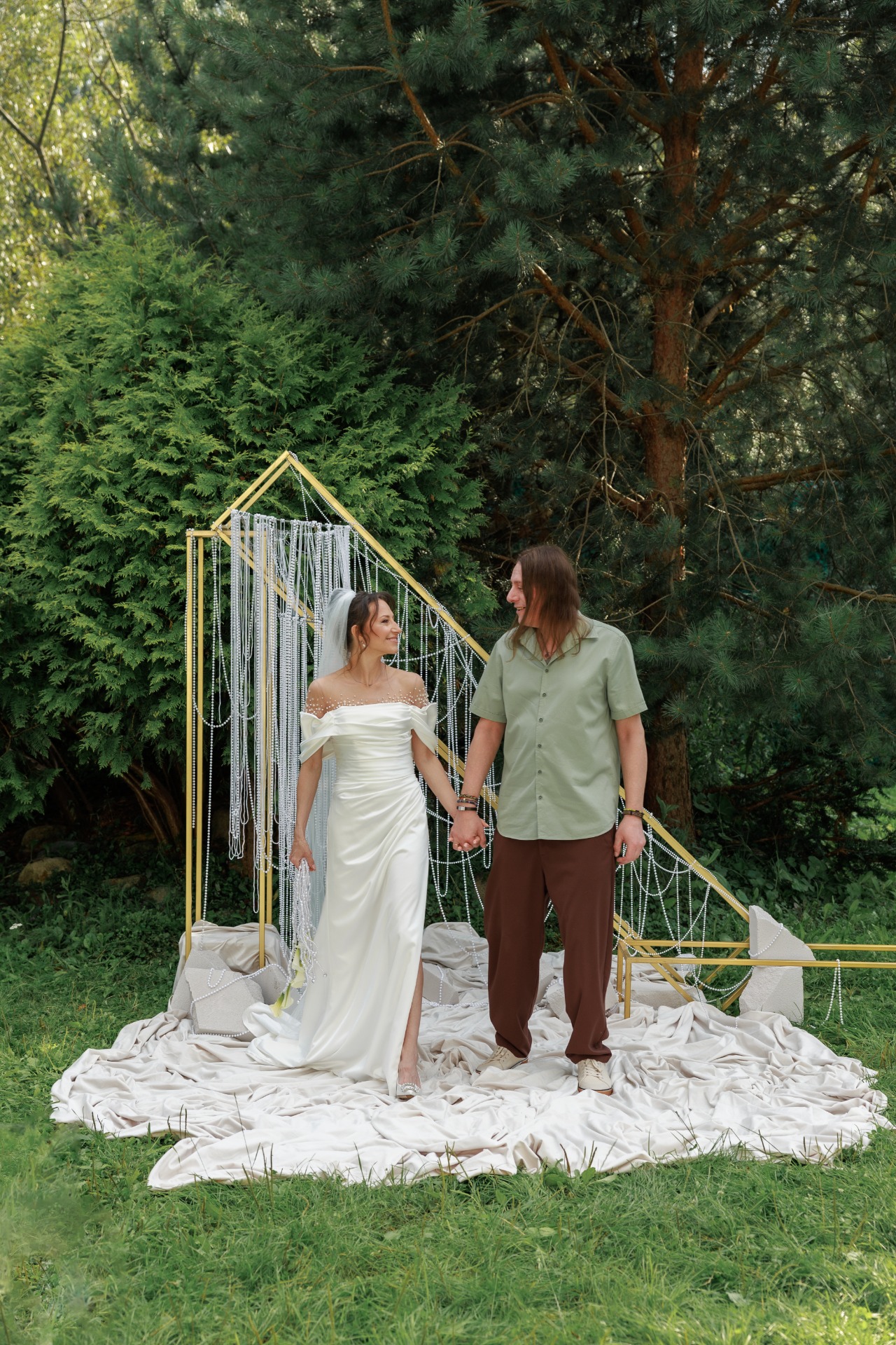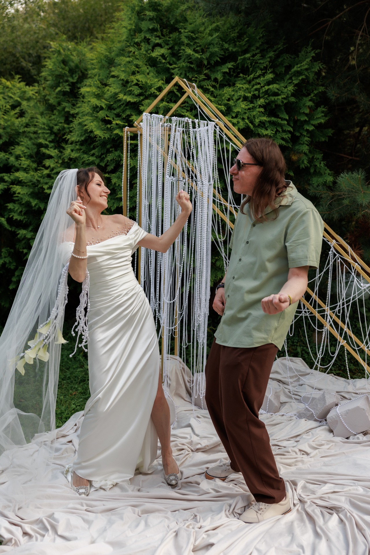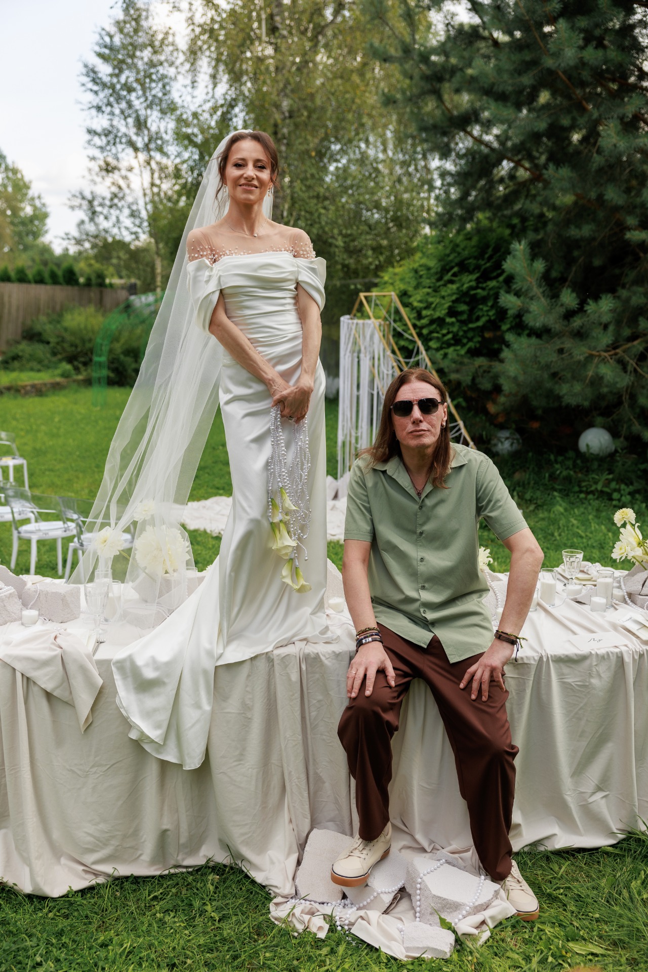 Наряд Артёма был понятен с самого начала: костюмы и галстуки не по душе рок-н-ролльщику. Простые брюки трендового коричневого цвета, оливковая рубашка, светлые кеды, многочисленные цепочки и фенечки, а также подаренные мной в день свадьбы тёмные очки с зелёным отливом создали нужный образ в той же палитре, что и вся свадьба.