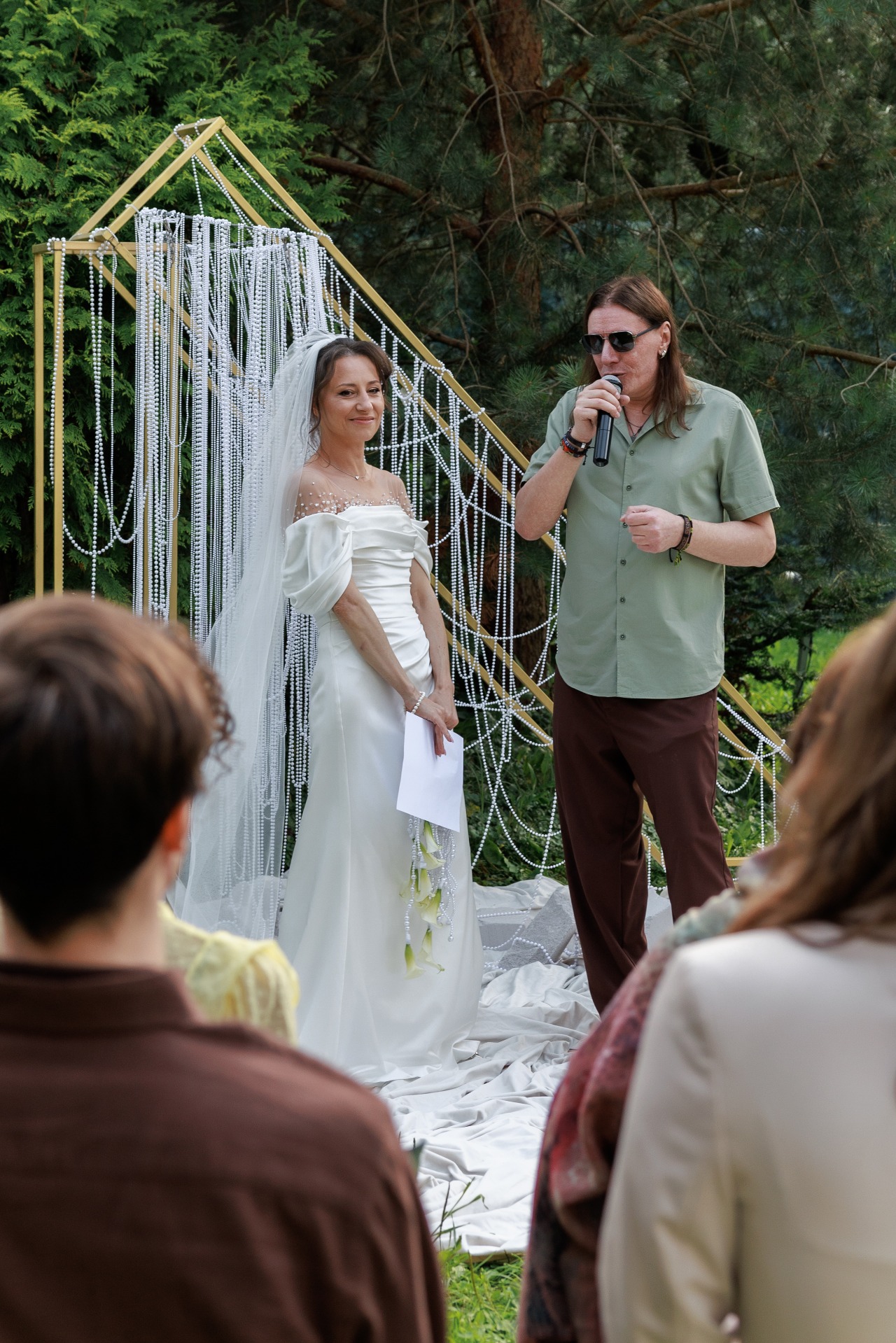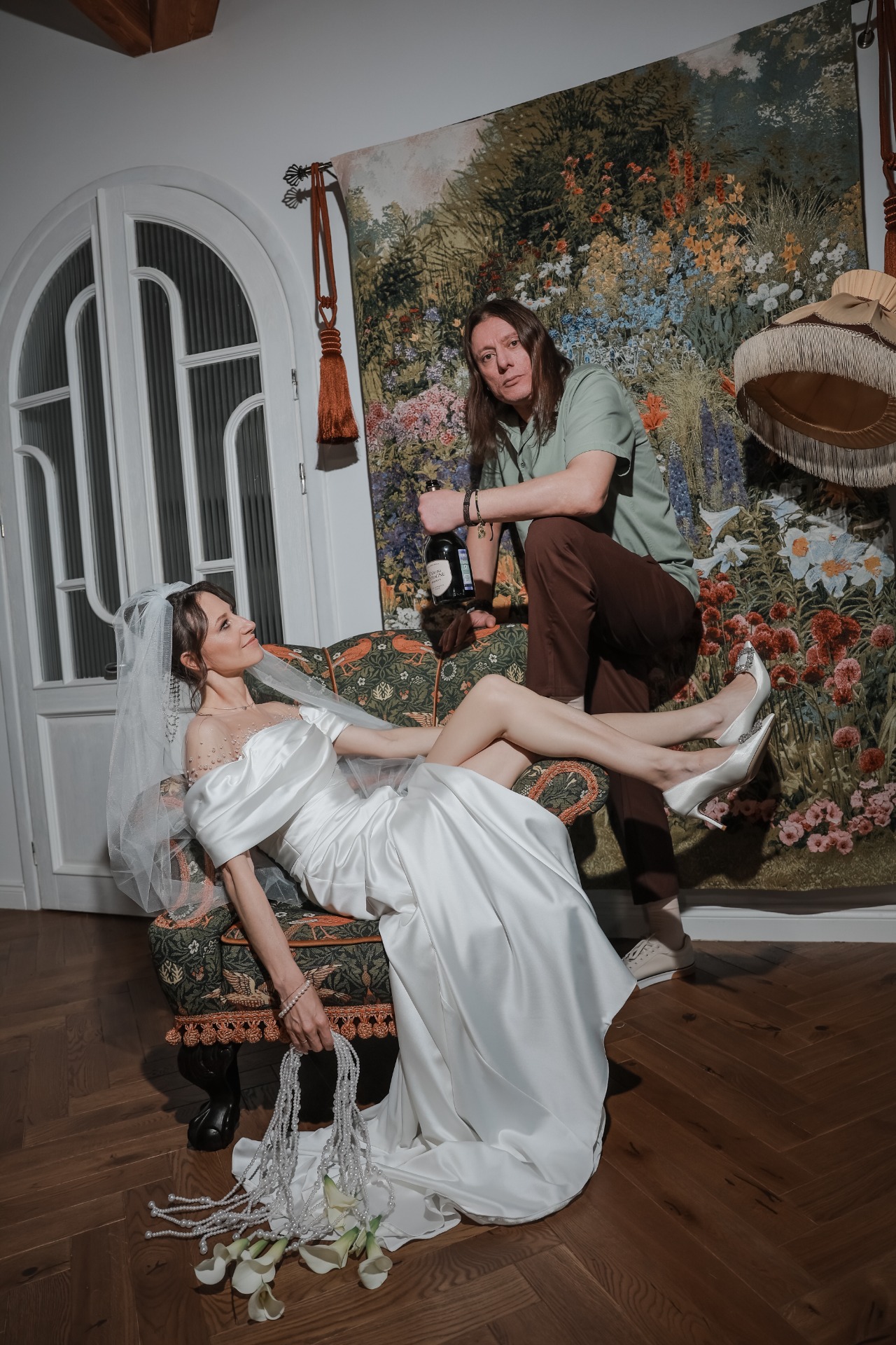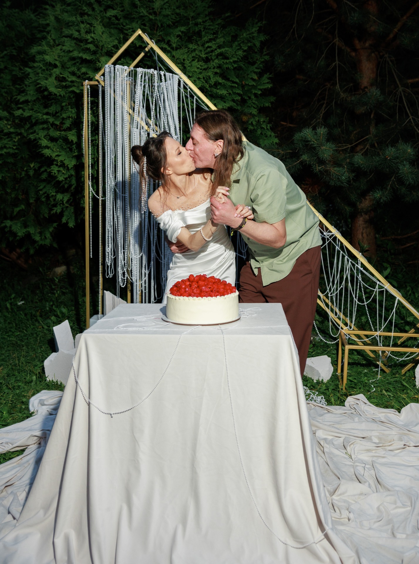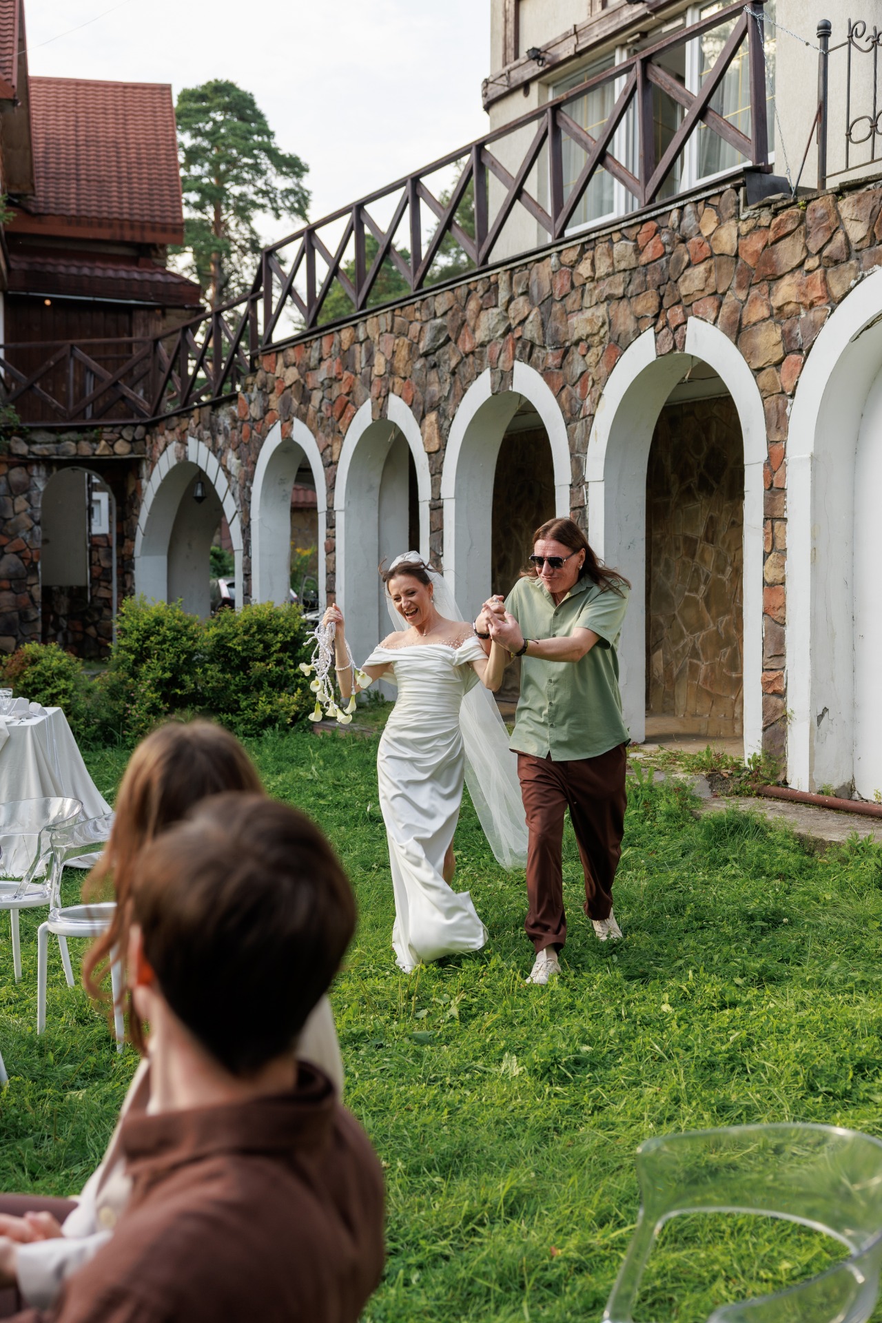 Наряд Артёма был понятен с самого начала: костюмы и галстуки не по душе рок-н-ролльщику. Простые брюки трендового коричневого цвета, оливковая рубашка, светлые кеды, многочисленные цепочки и фенечки, а также подаренные мной в день свадьбы тёмные очки с зелёным отливом создали нужный образ в той же палитре, что и вся свадьба.