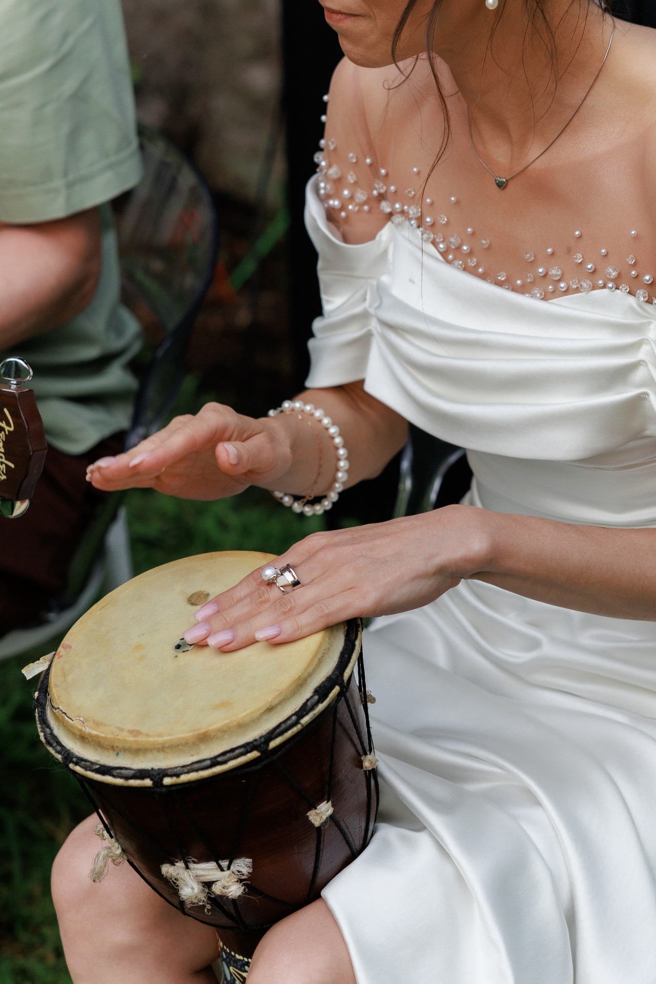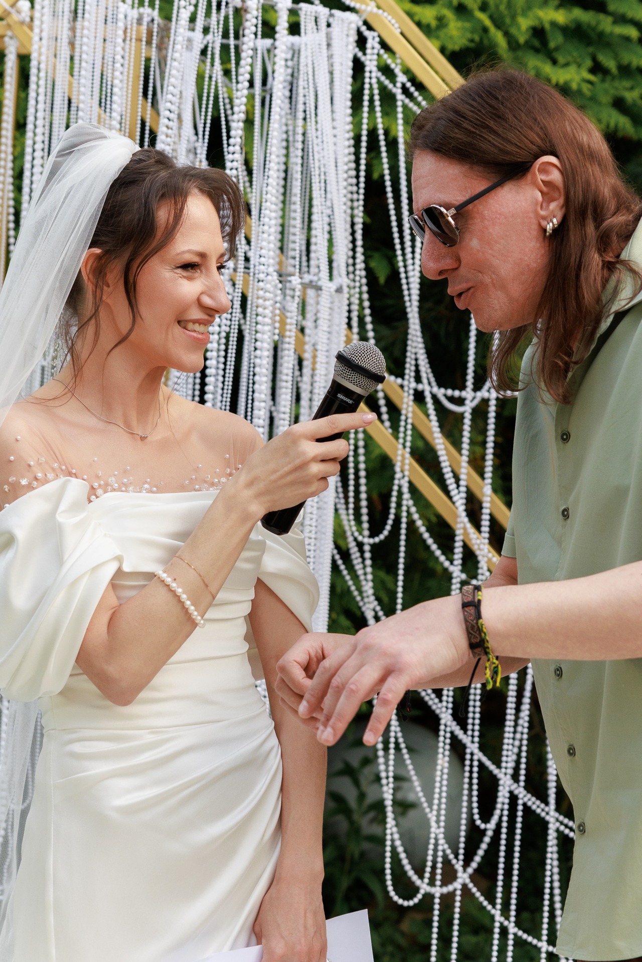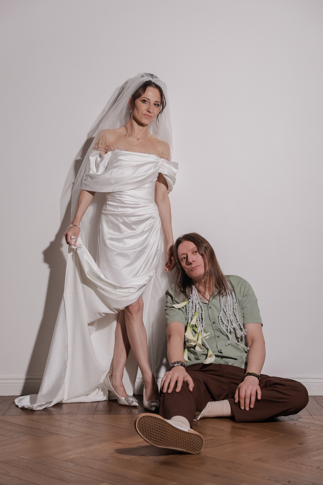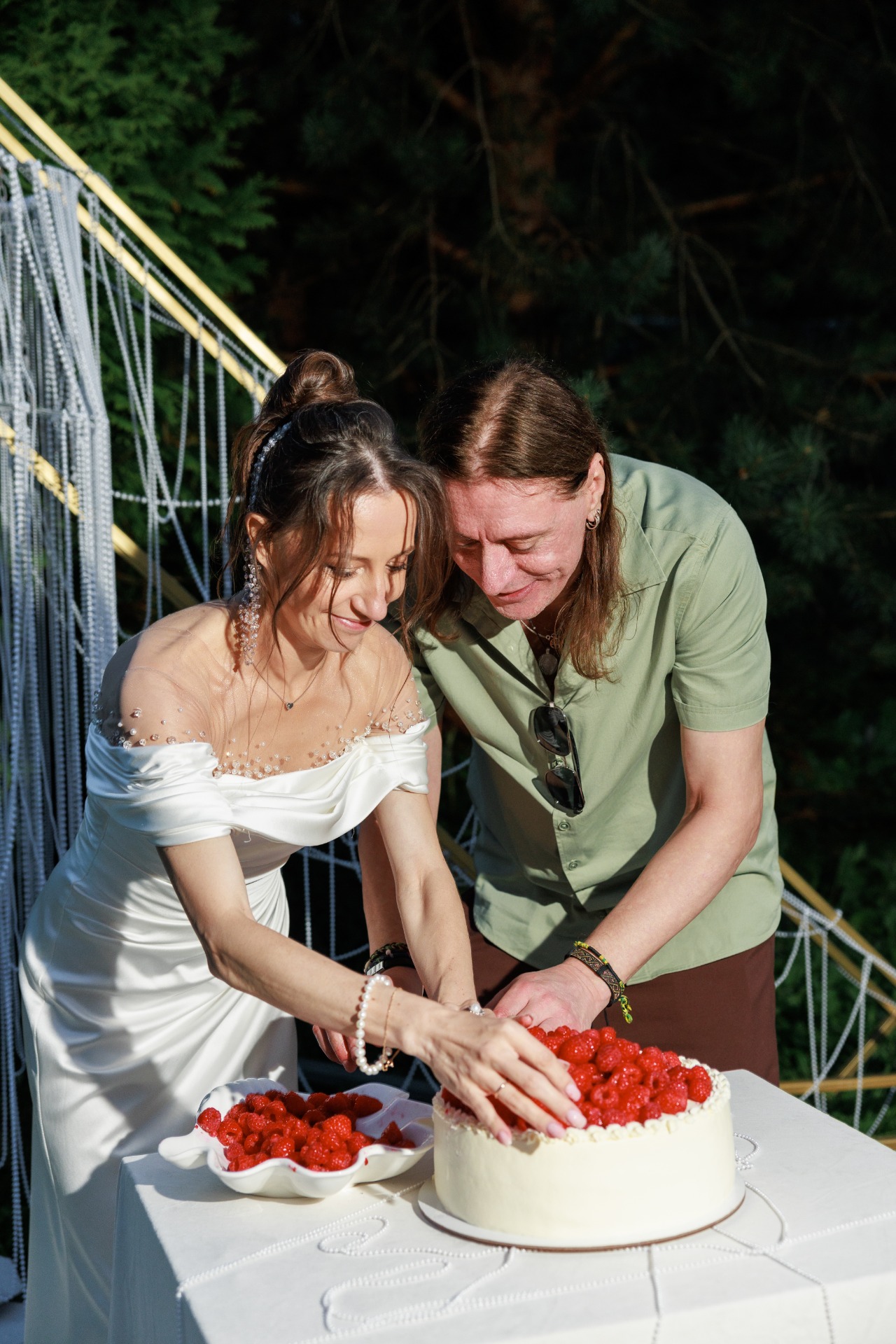 Наряд Артёма был понятен с самого начала: костюмы и галстуки не по душе рок-н-ролльщику. Простые брюки трендового коричневого цвета, оливковая рубашка, светлые кеды, многочисленные цепочки и фенечки, а также подаренные мной в день свадьбы тёмные очки с зелёным отливом создали нужный образ в той же палитре, что и вся свадьба.