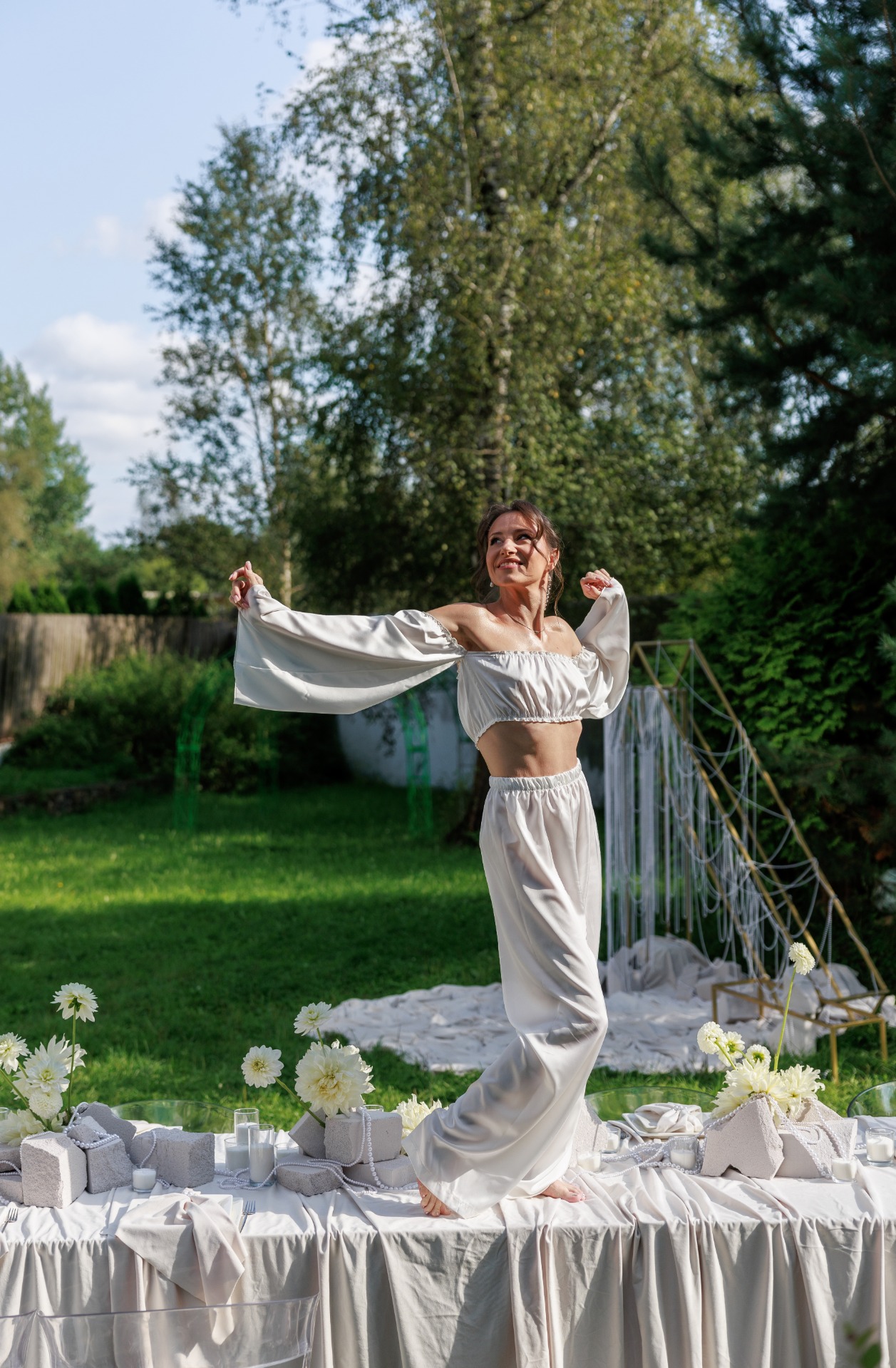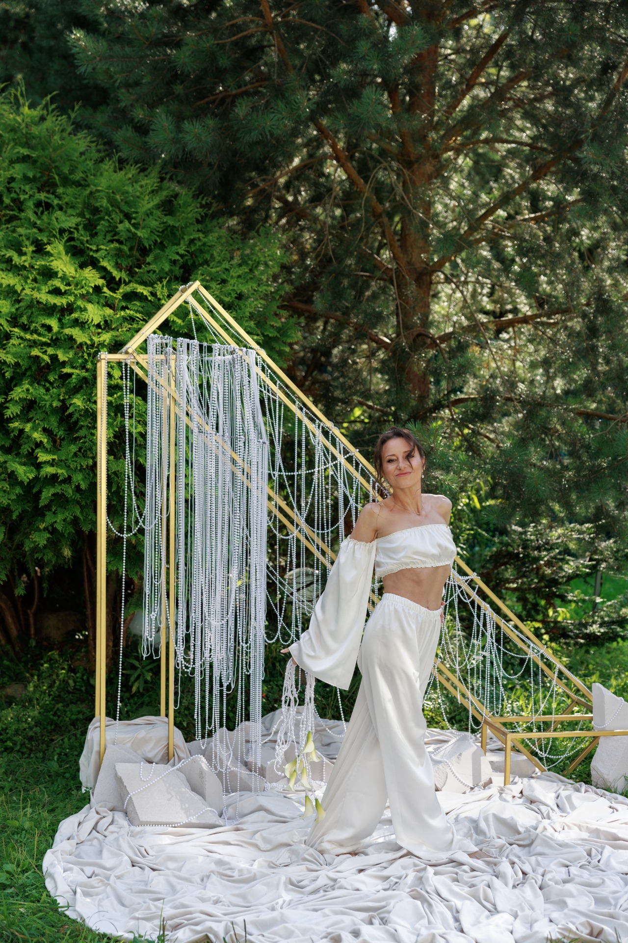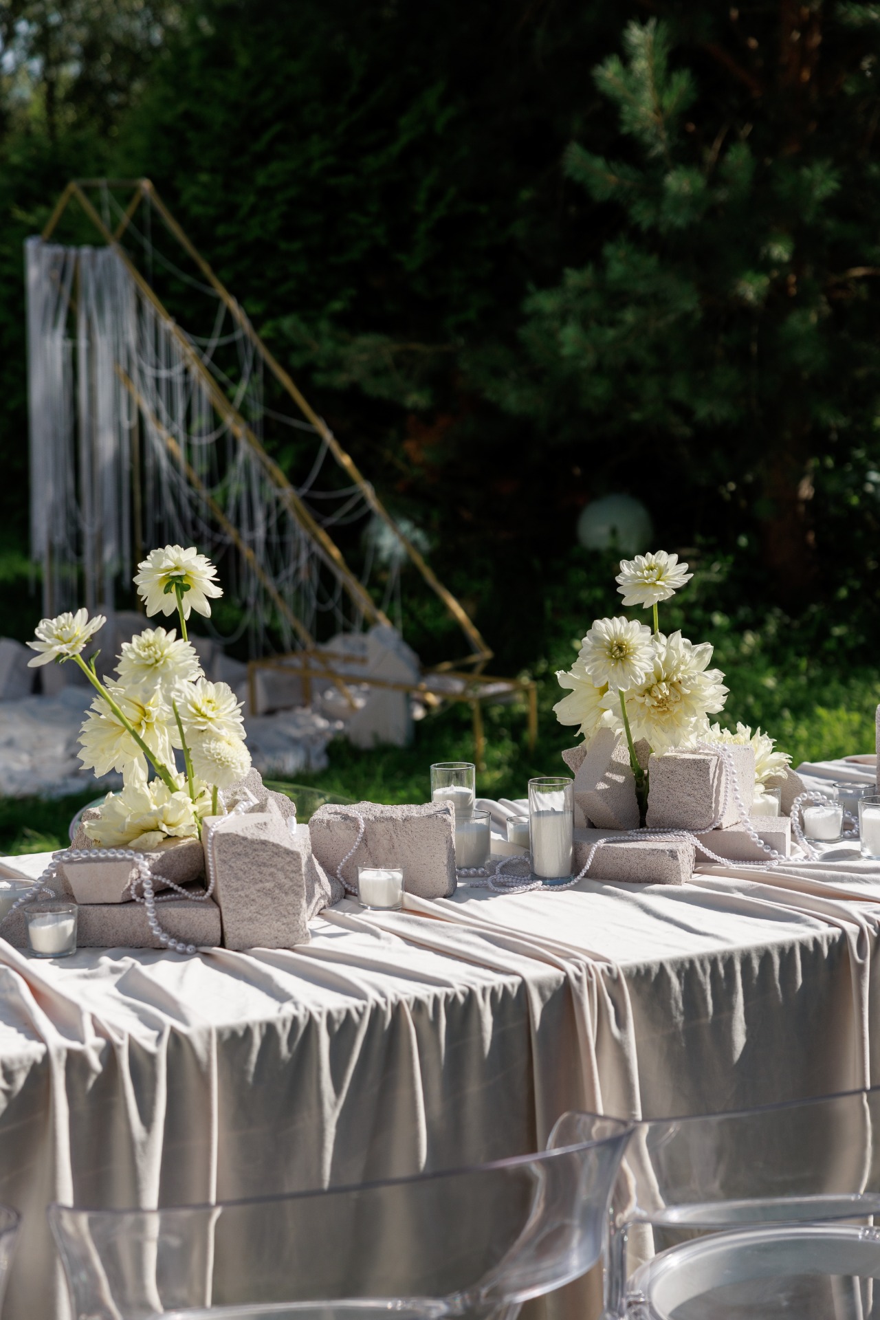 В декоре мы использовали светлый бархат и жемчуг, металл и камень как воплощение идеи объединения женского и мужского начал. Нам не хотелось тёмных тонов, поэтому в палитре праздника оказались только естественные природные оттенки: белый — в декоре, коричневый, оливковый, бежевый, светло-бирюзовый — в дресс-коде.