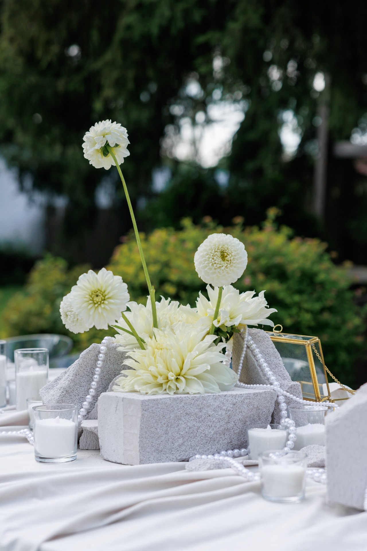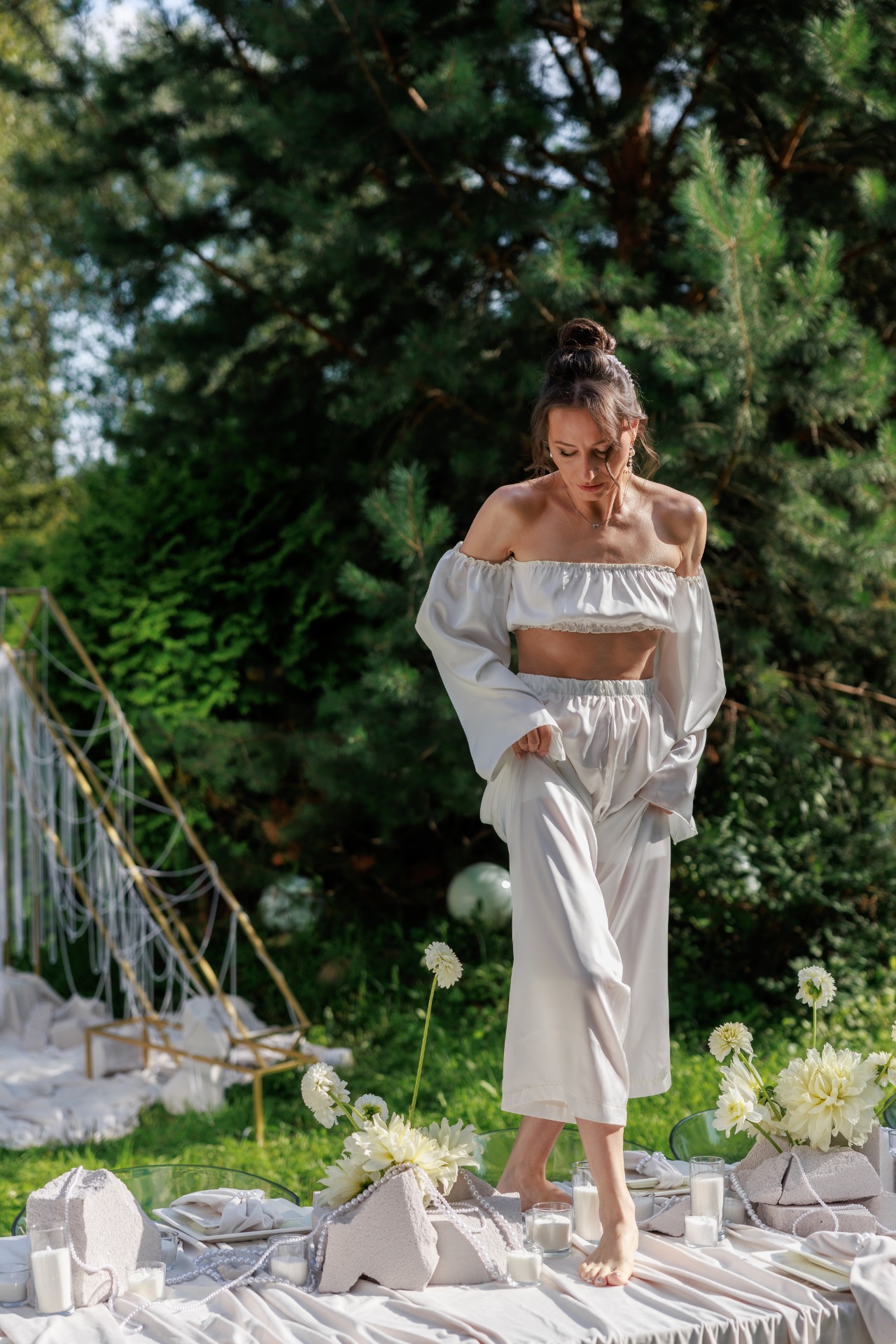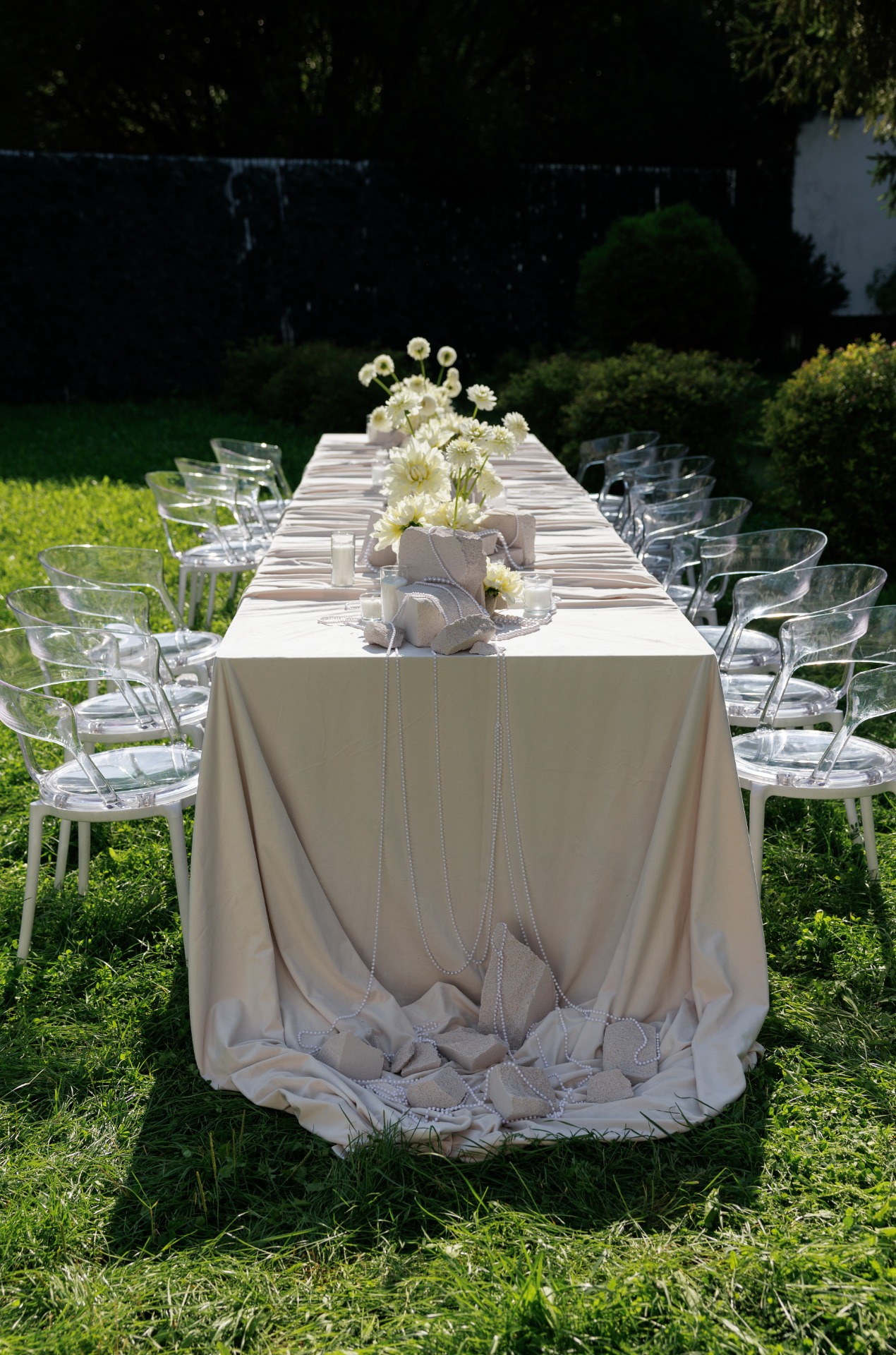 В декоре мы использовали светлый бархат и жемчуг, металл и камень как воплощение идеи объединения женского и мужского начал. Нам не хотелось тёмных тонов, поэтому в палитре праздника оказались только естественные природные оттенки: белый — в декоре, коричневый, оливковый, бежевый, светло-бирюзовый — в дресс-коде.