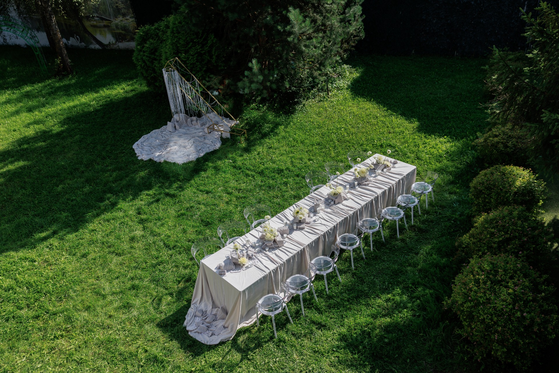 Наш камерный праздник начался рок-н-ролльной церемонией и закончился малиновым тортом. Декоратор Ольга Чернец проникла в суть концепта: торжество в американском стиле на поляне под открытым небом.