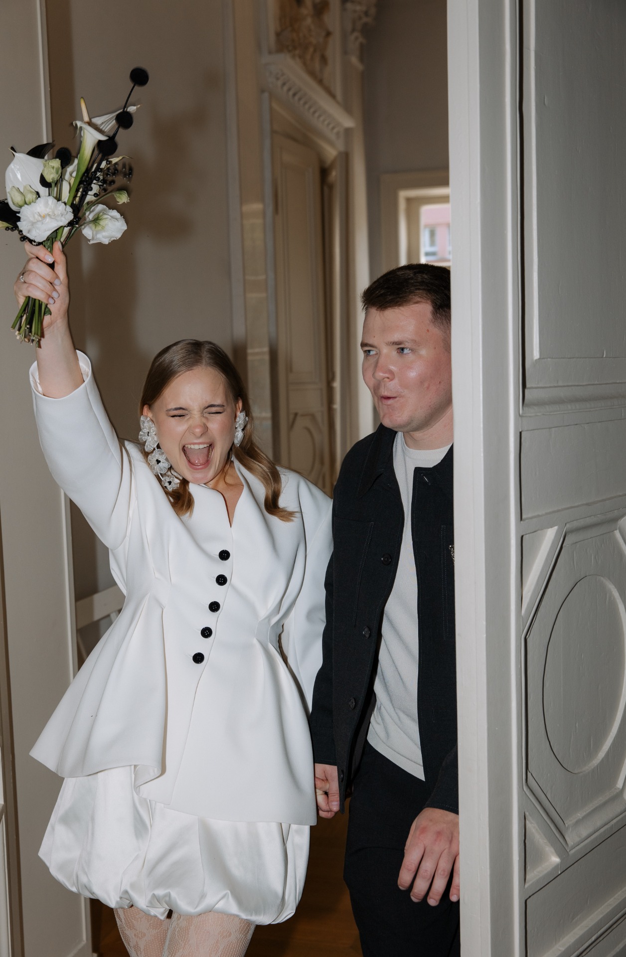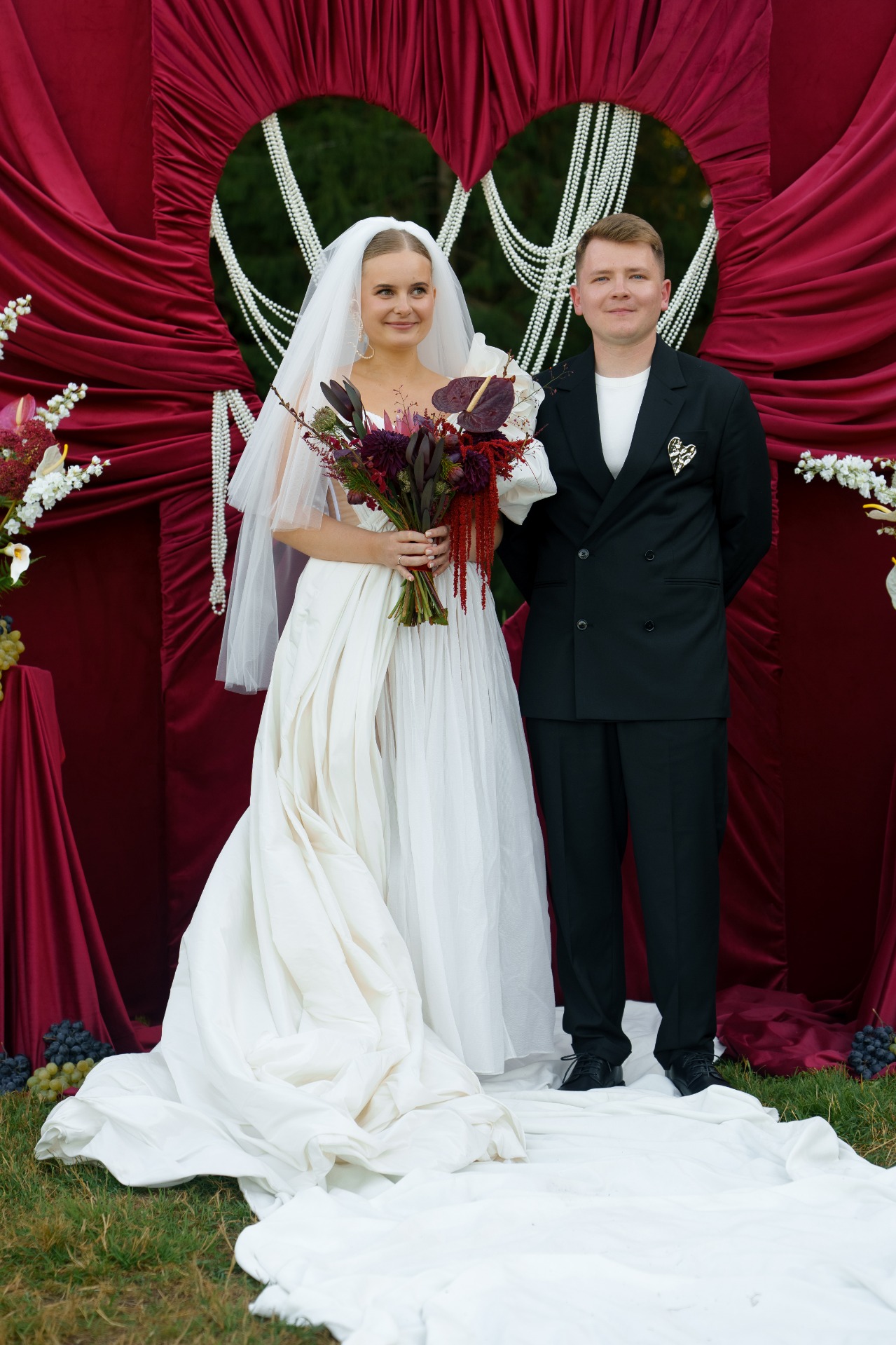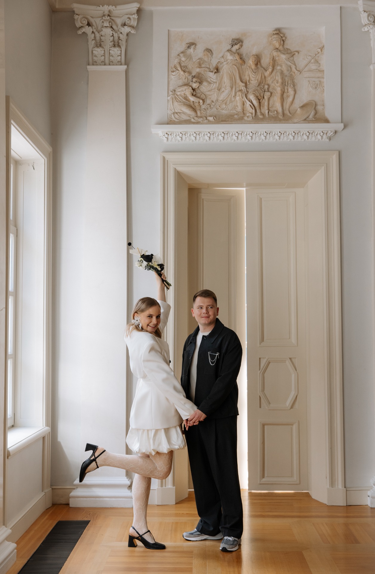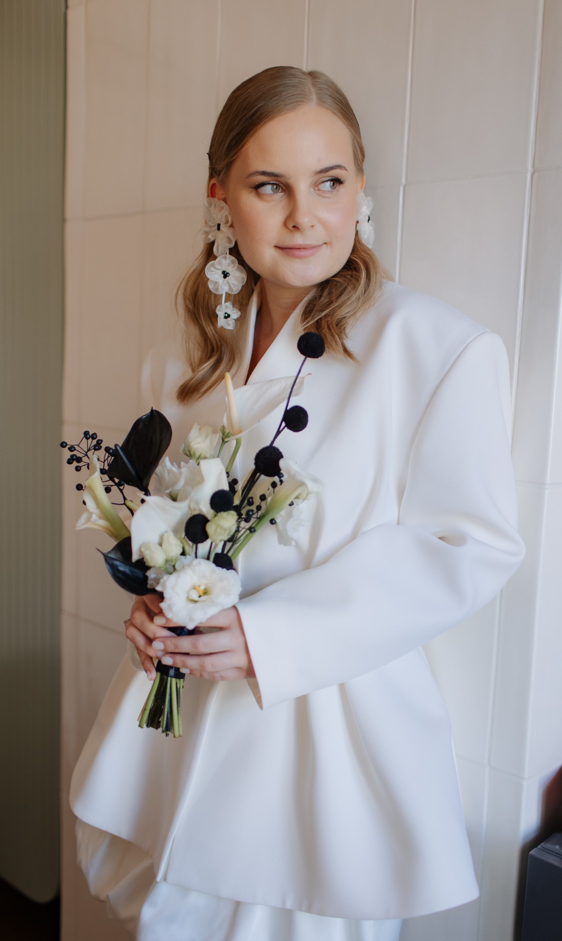 На росписи я хотела выглядеть сдержанно, поэтому выбрала пиджак с защипами от бренда 1811, юбку-баллон, кружевные колготки и акцентные туфли Tendence. А букет с чёрными элементами стал идеальным завершением общей картинки!