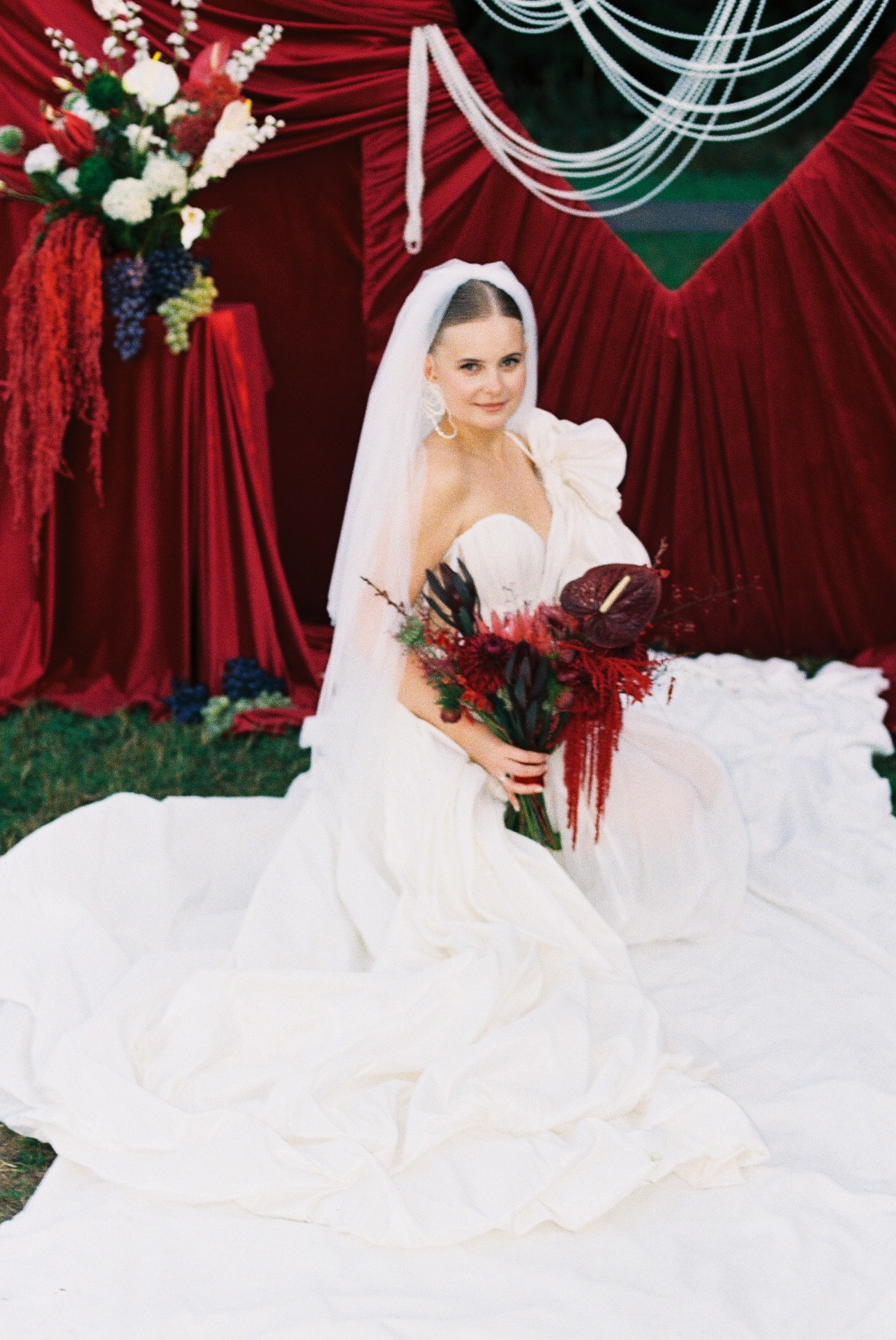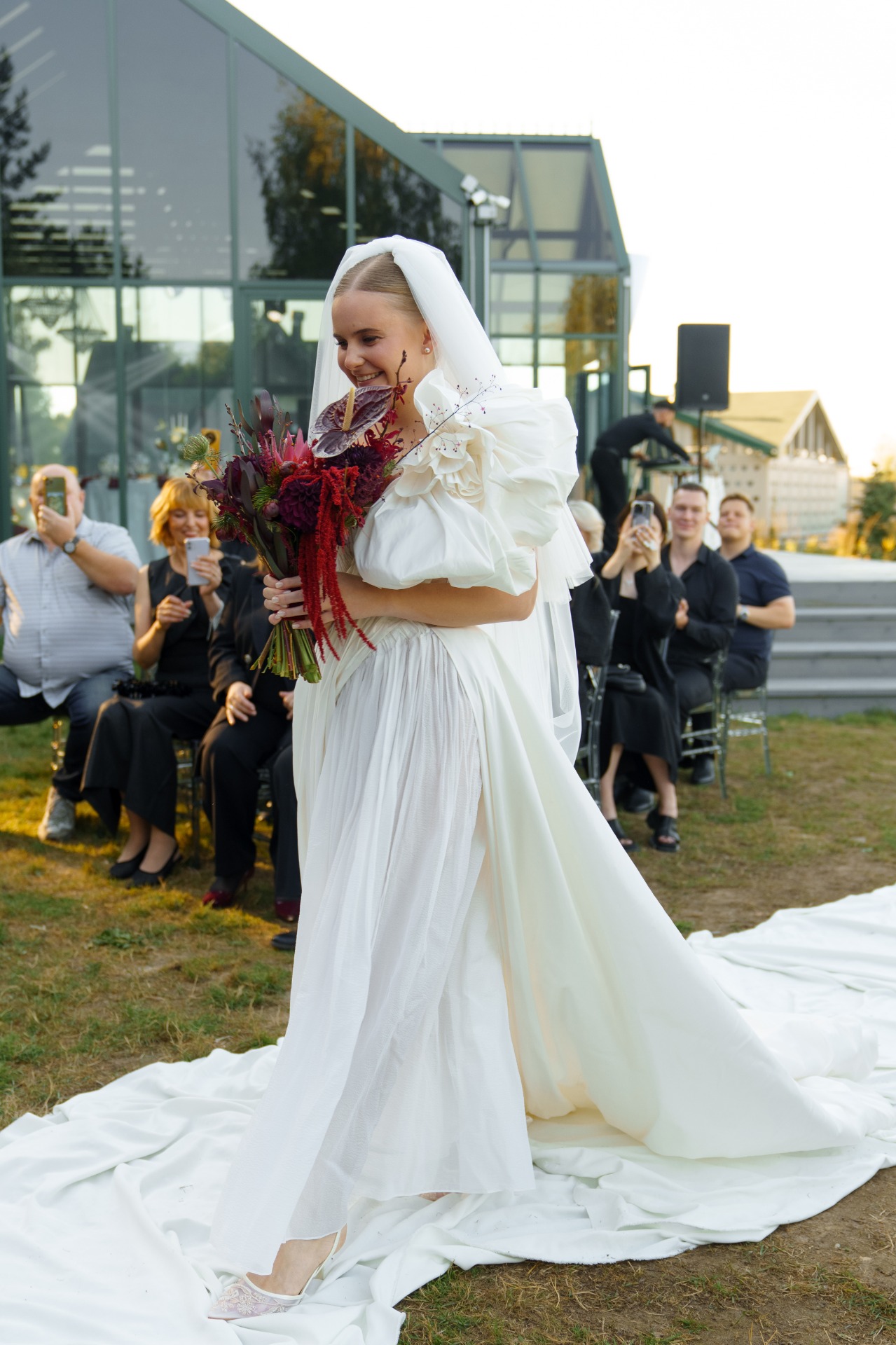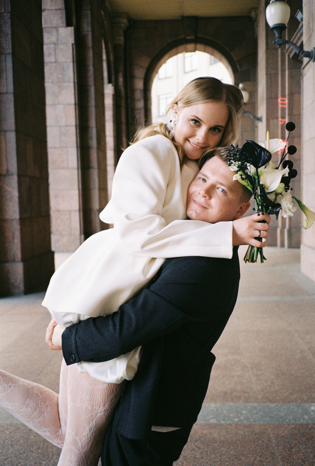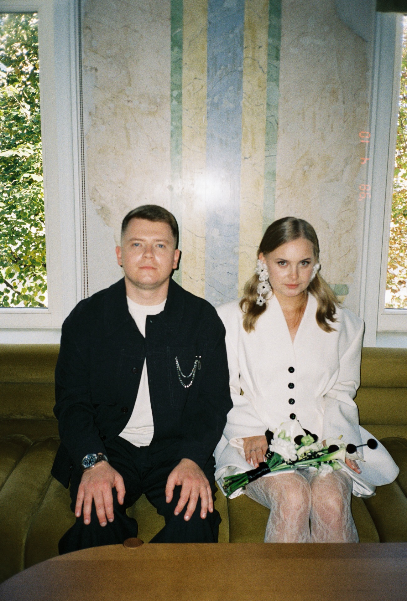 На росписи я хотела выглядеть сдержанно, поэтому выбрала пиджак с защипами от бренда 1811, юбку-баллон, кружевные колготки и акцентные туфли Tendence. А букет с чёрными элементами стал идеальным завершением общей картинки!