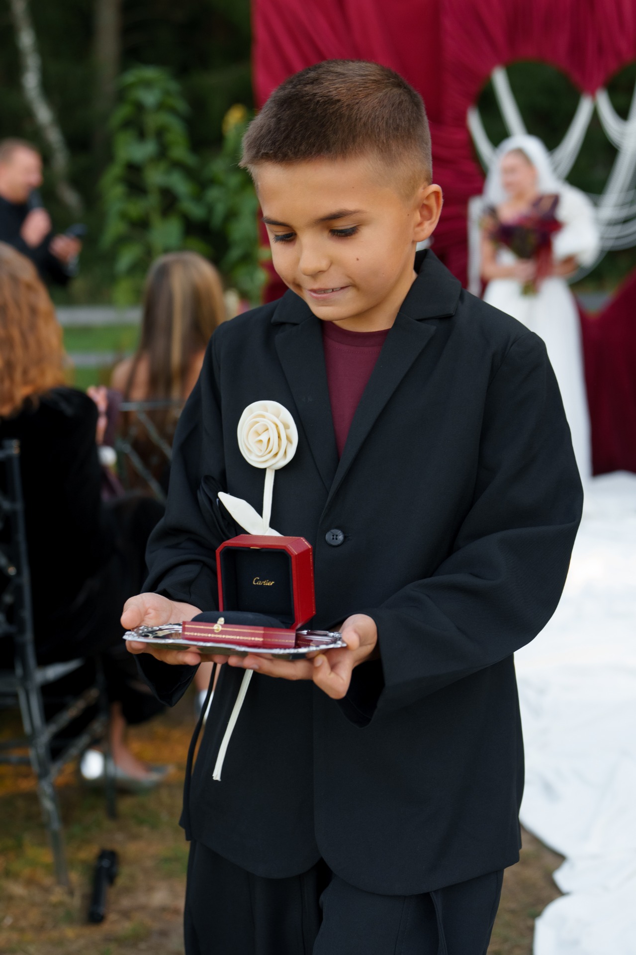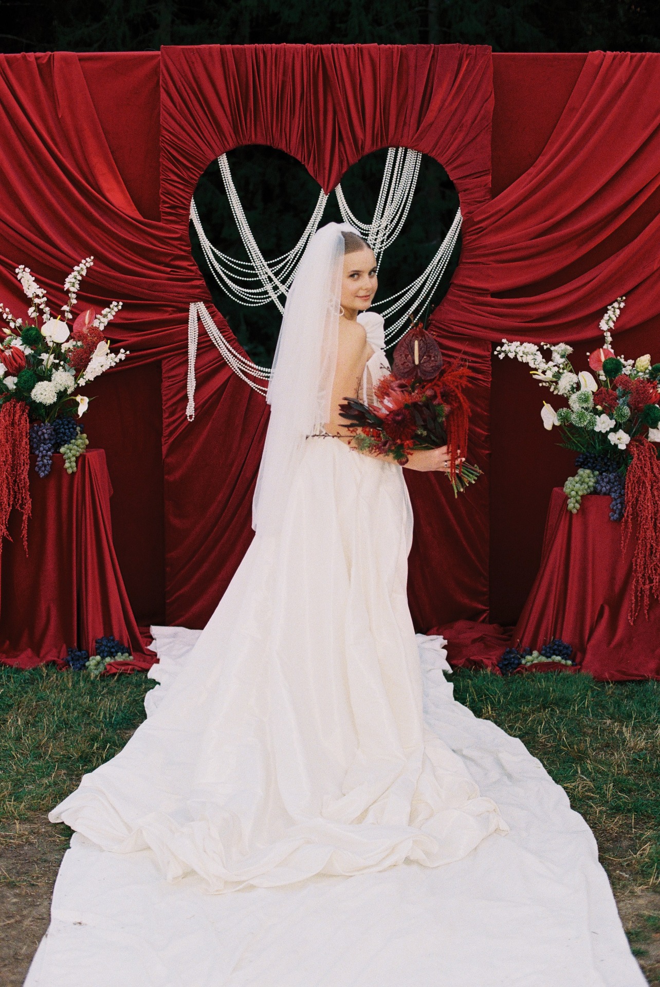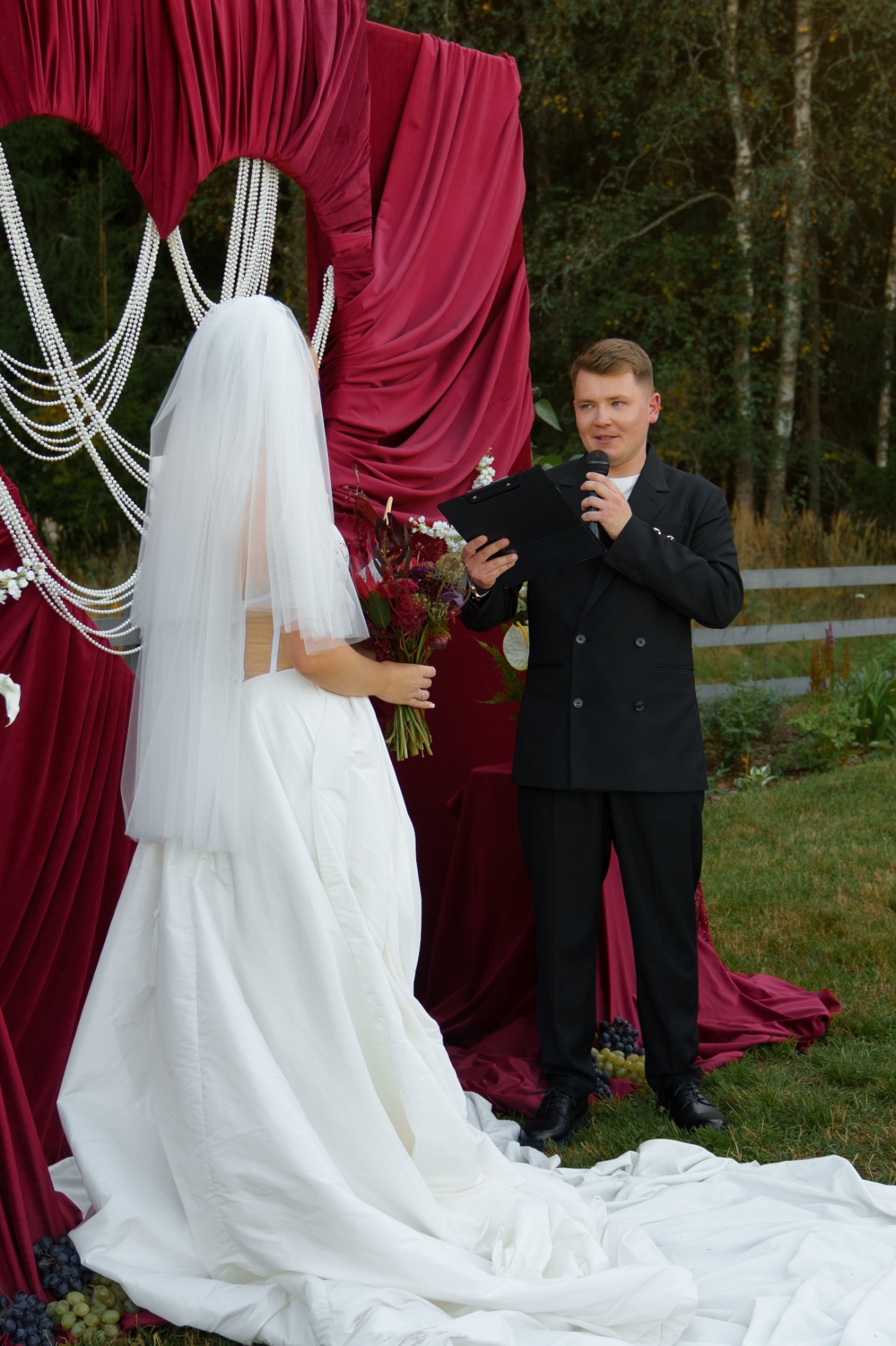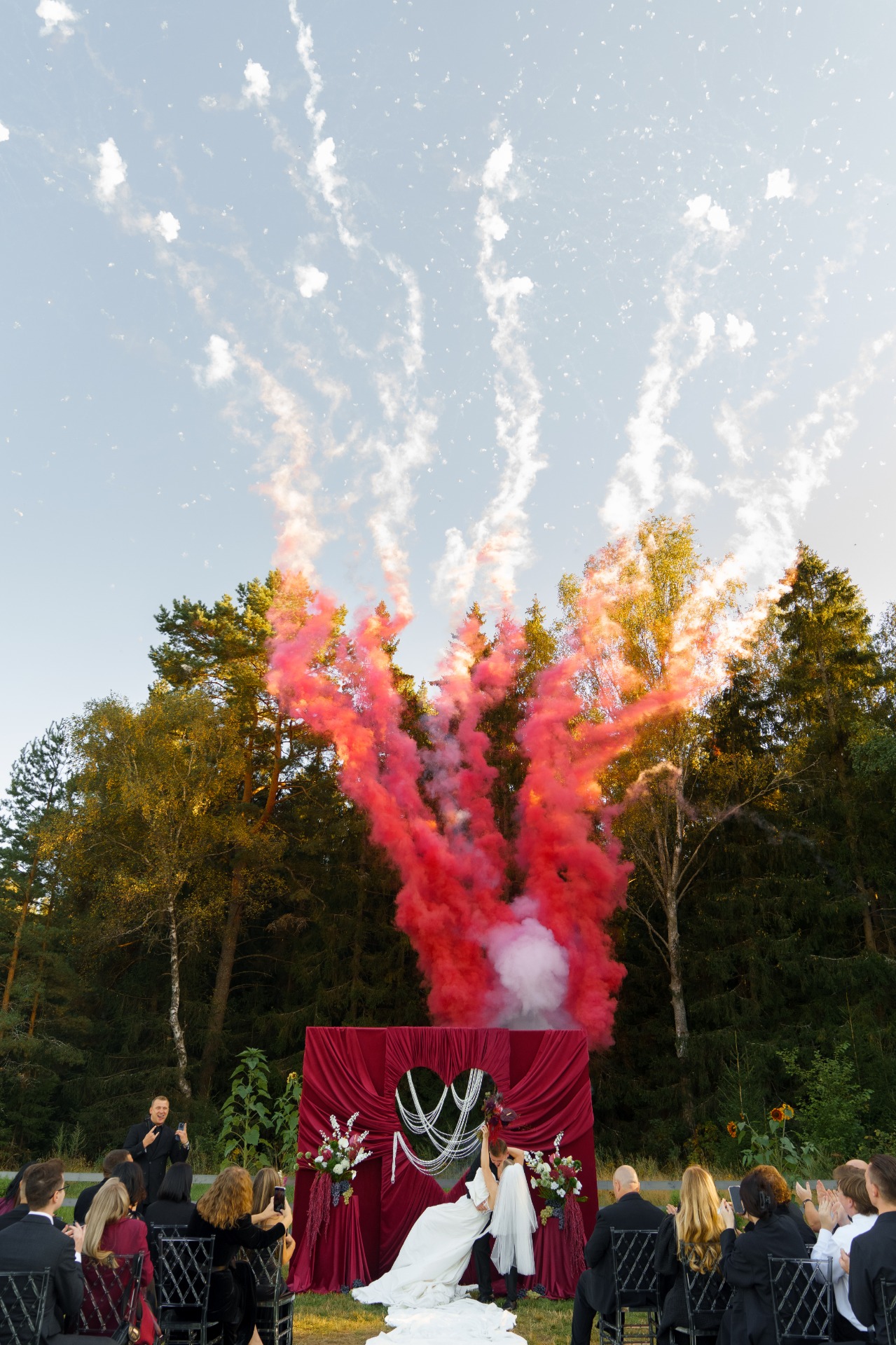Дресс-код total black был выбран для элегантности и удобства гостей. С цветовой гаммой я определилась, в очередной раз залипая на Pinterest. Мы остановились на цвете под названием «cherry-coded», который очень подходил под нашу задумку: осень и загородная площадка в зелени смотрелись с ним очень эффектно!