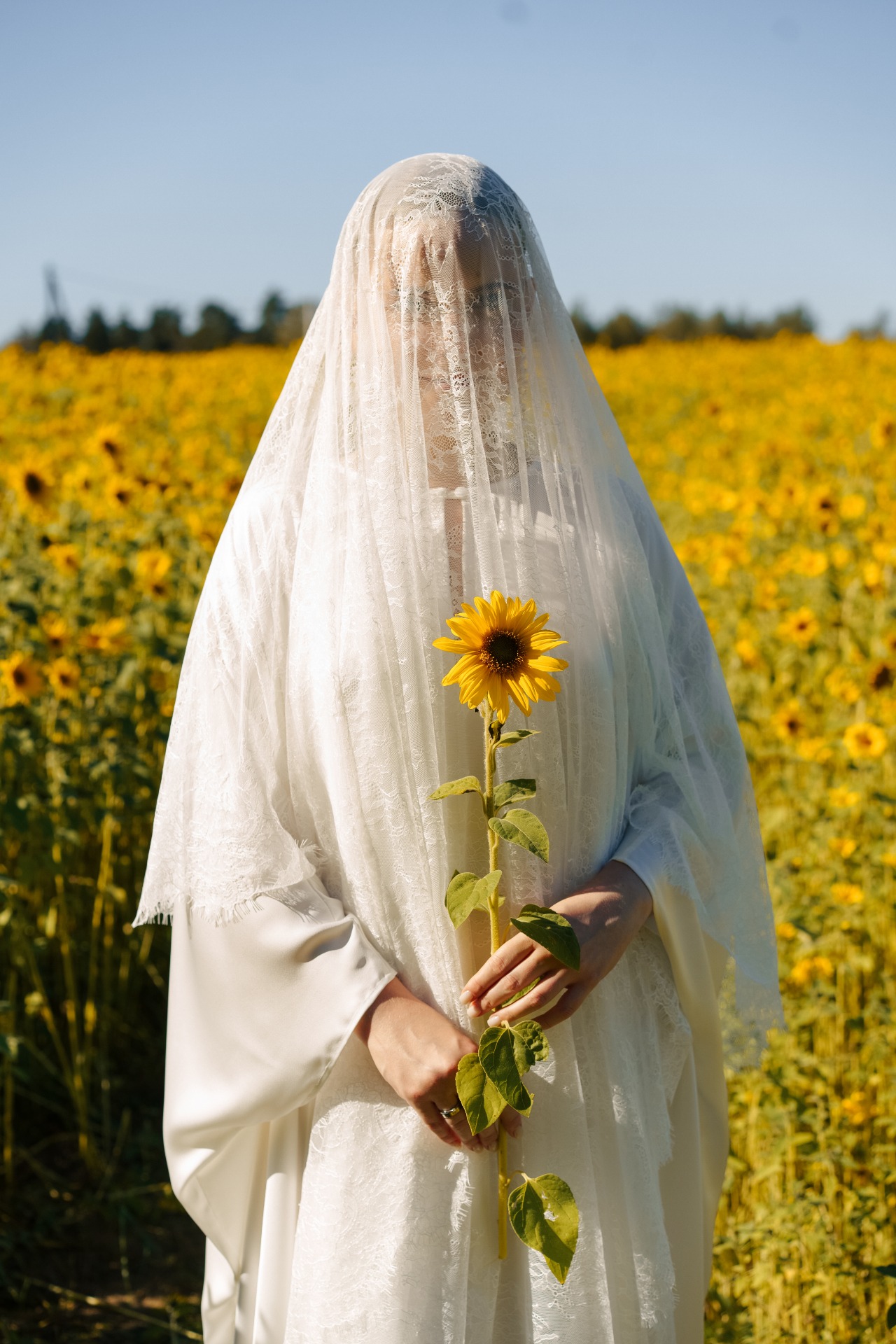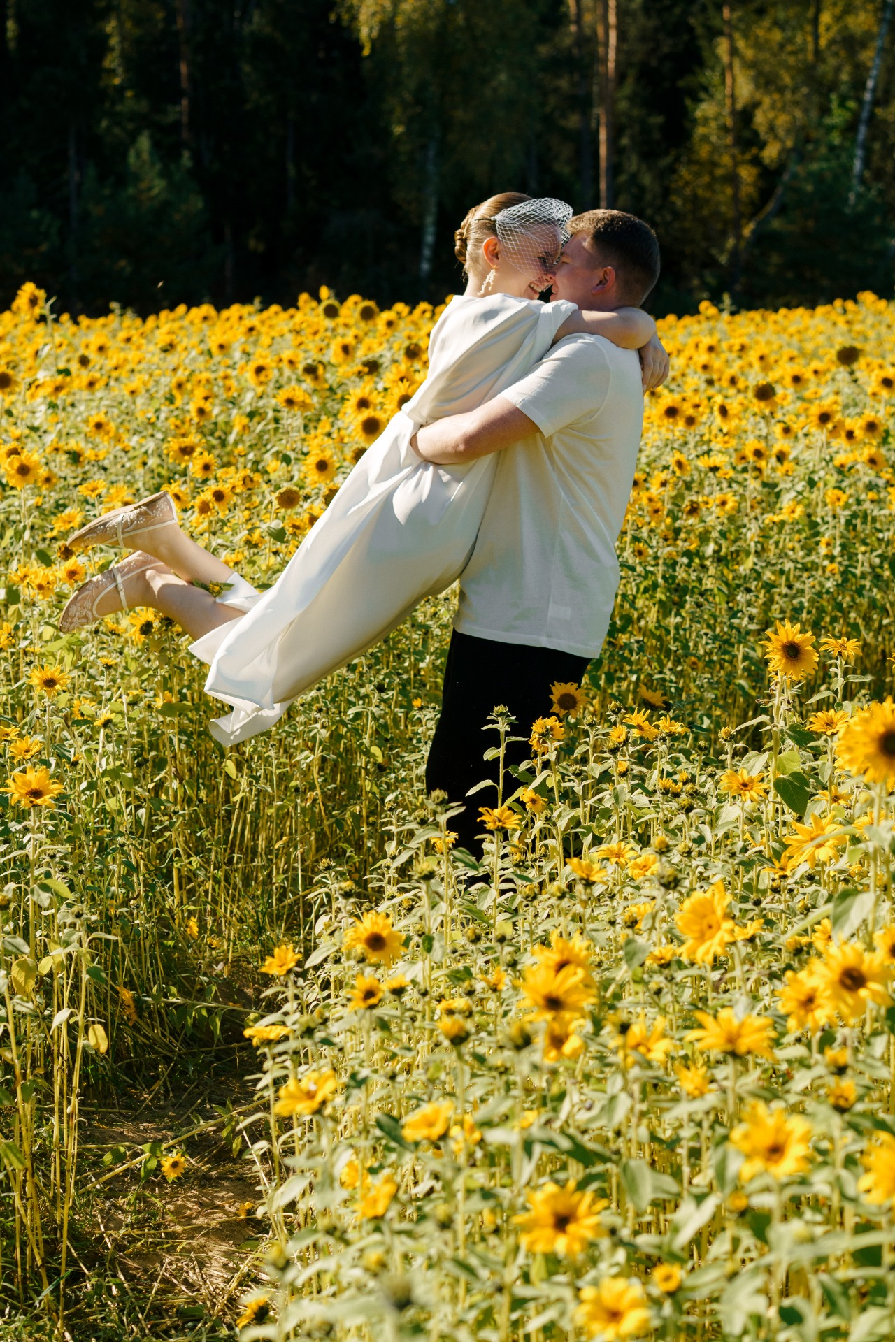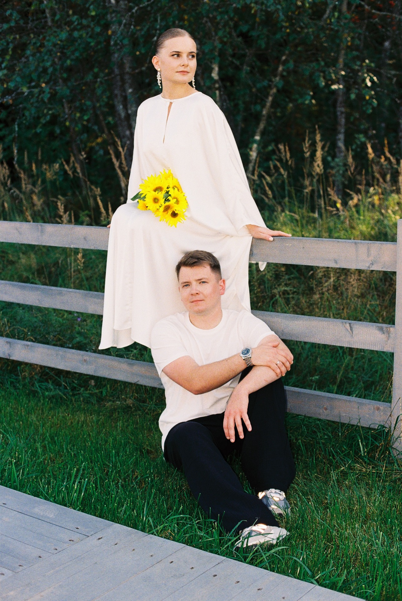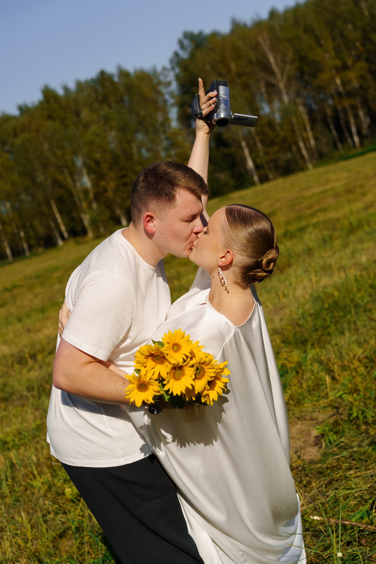 Моим первым нарядом в день торжества стало струящееся шёлковое платье (handmade от мамы), кружевные балетки и вуаль. В этом образе я встречала гостей на велкоме. Илья был в муслиновых брюках и футболке.
