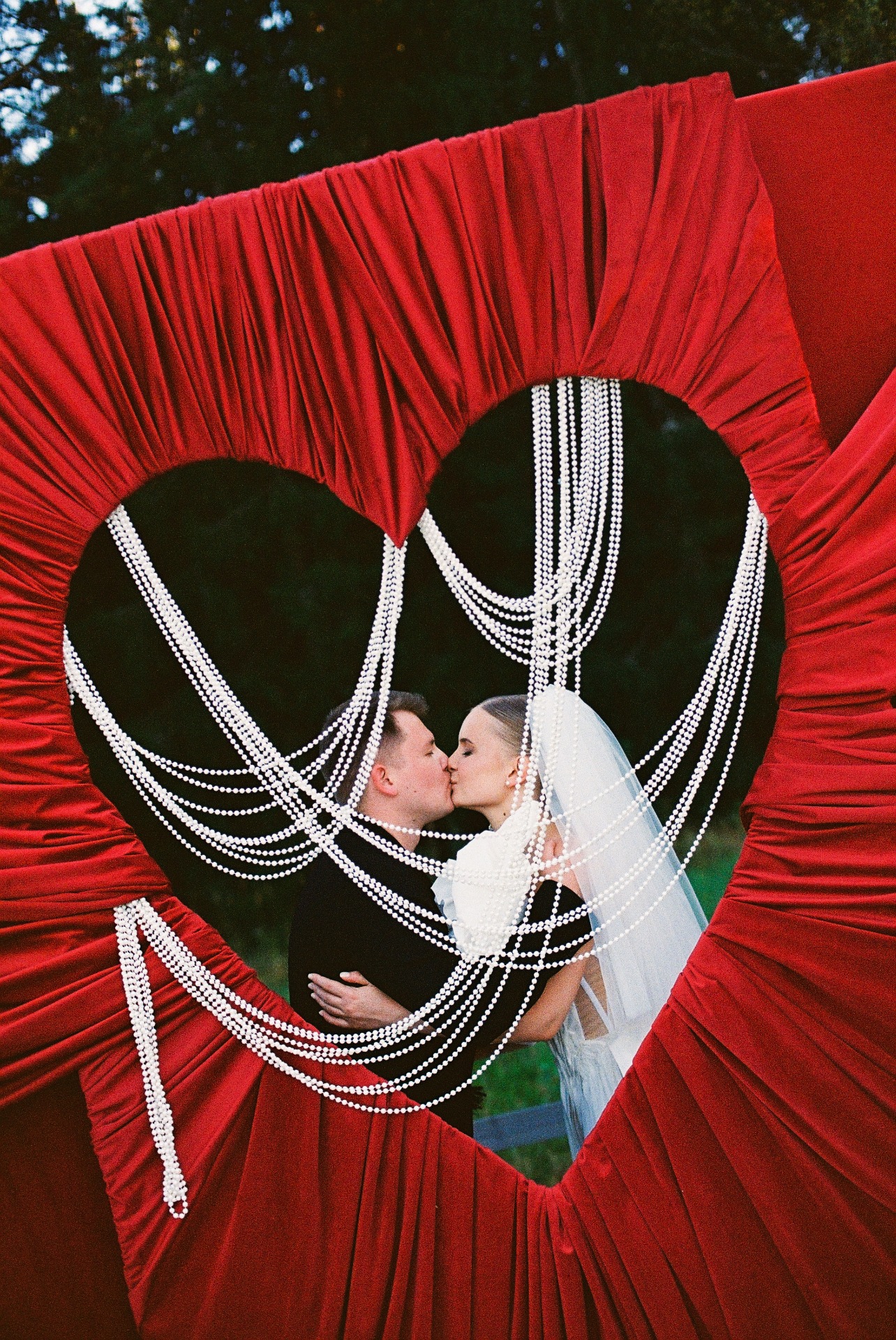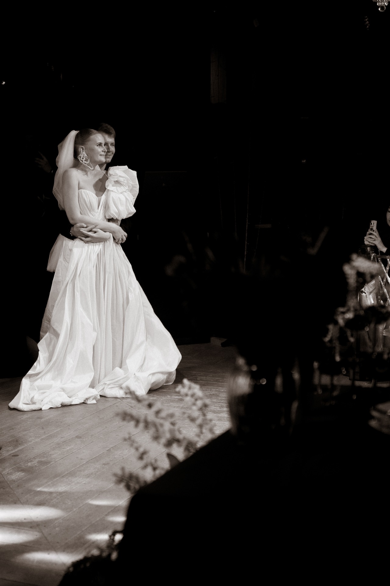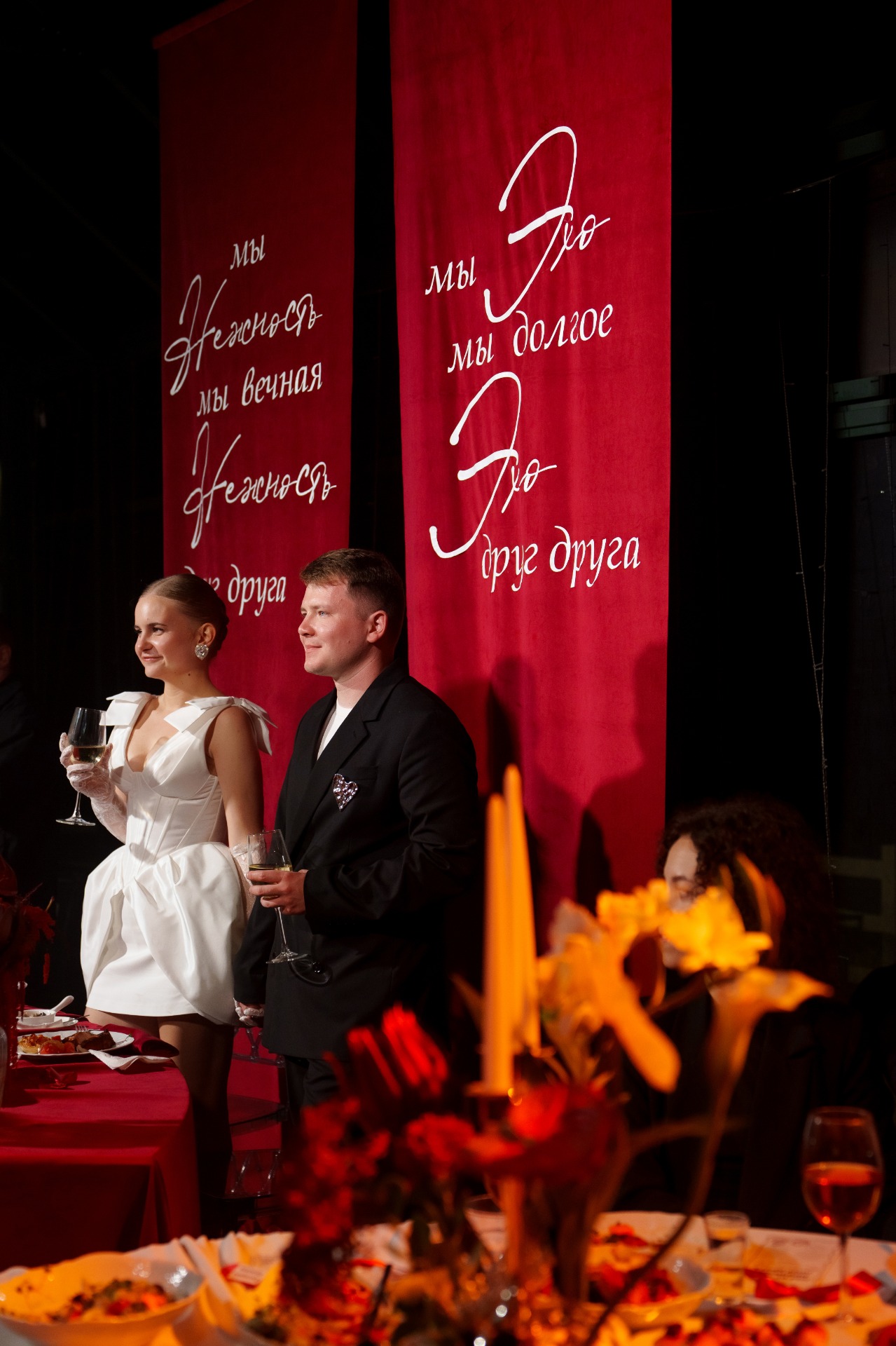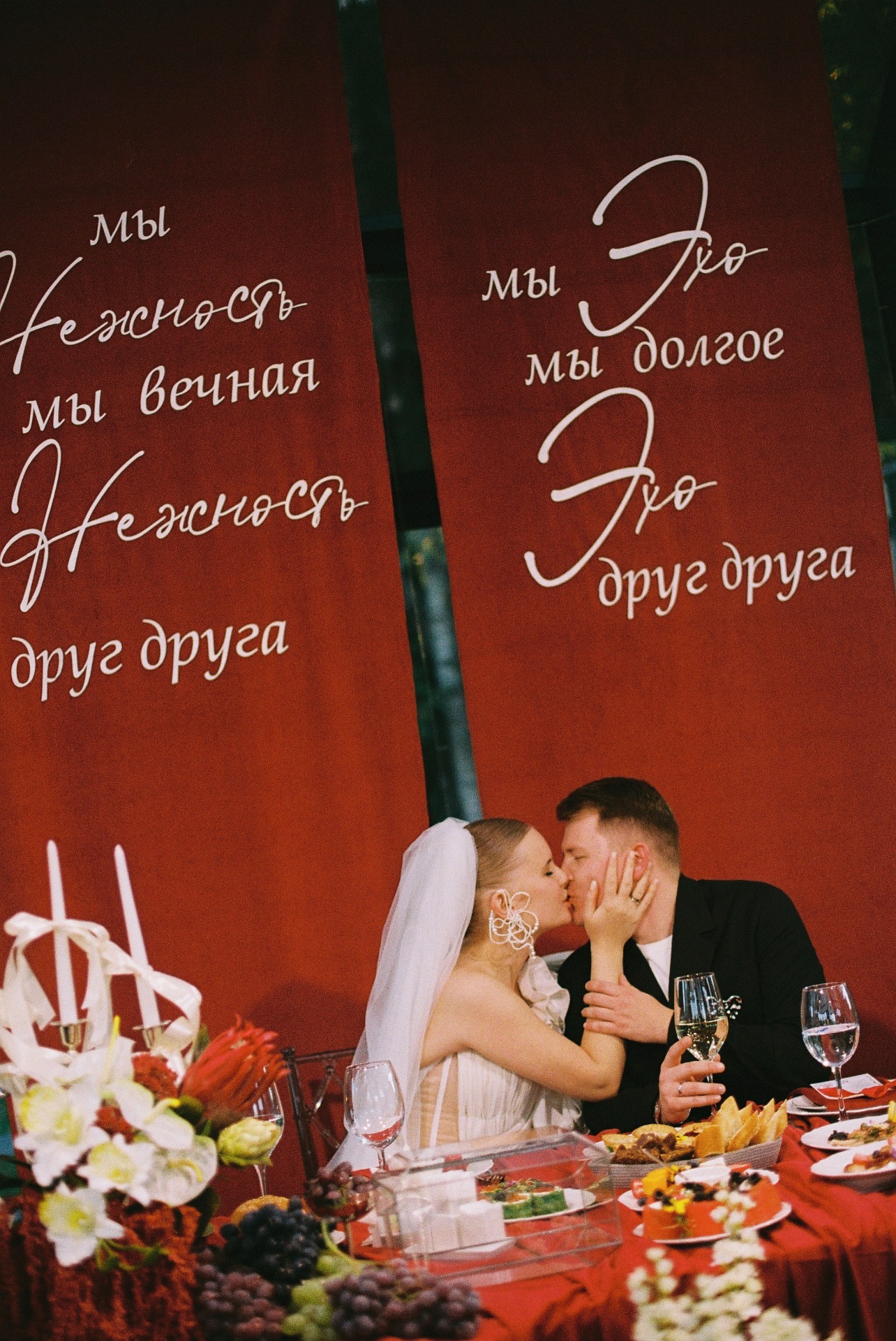 Концепция дня родилась из песни Анны Герман «Эхо любви», которую я когда-то давно загадала на свою свадьбу. У меня всегда появляются мурашки при её прослушивании. Я предложила эту идею Илье, и он поддержал. Под неё мы исполнили первый танец, ведь она буквально написана про нас! Она натолкнула нас с декораторами на идею арки в виде сердца с трендовым жемчугом и строчками из песни в зоне президиума.