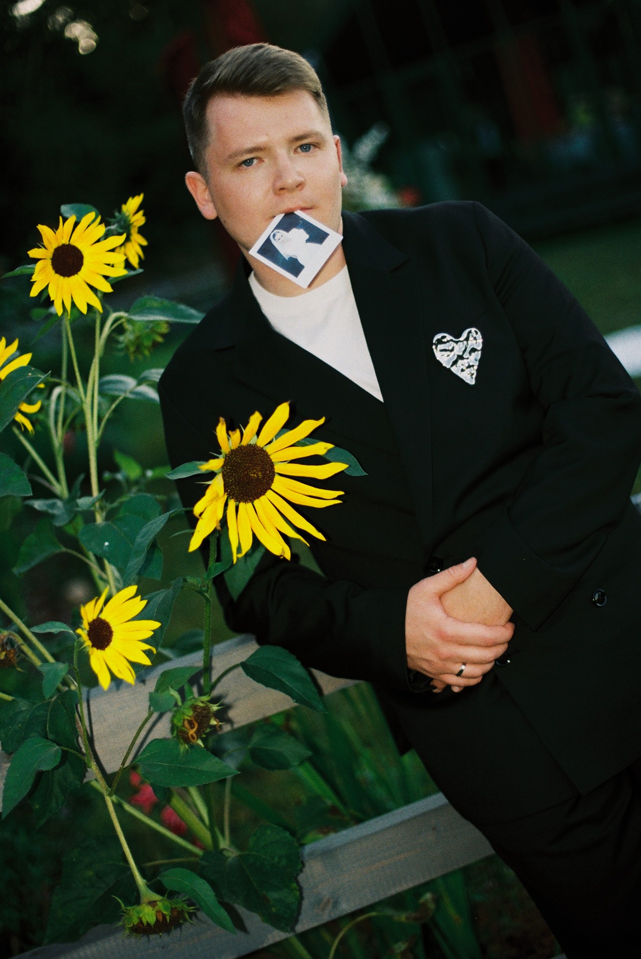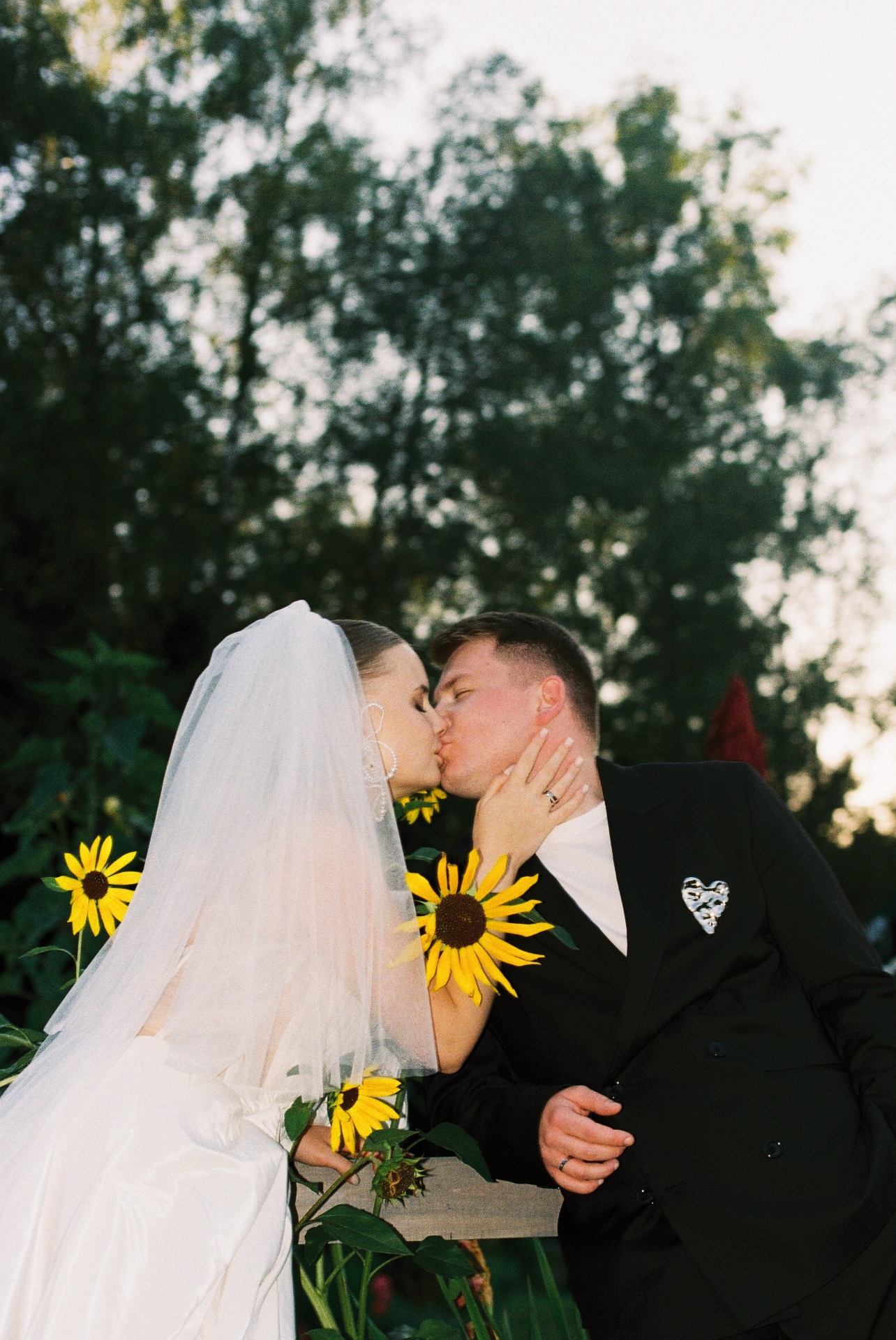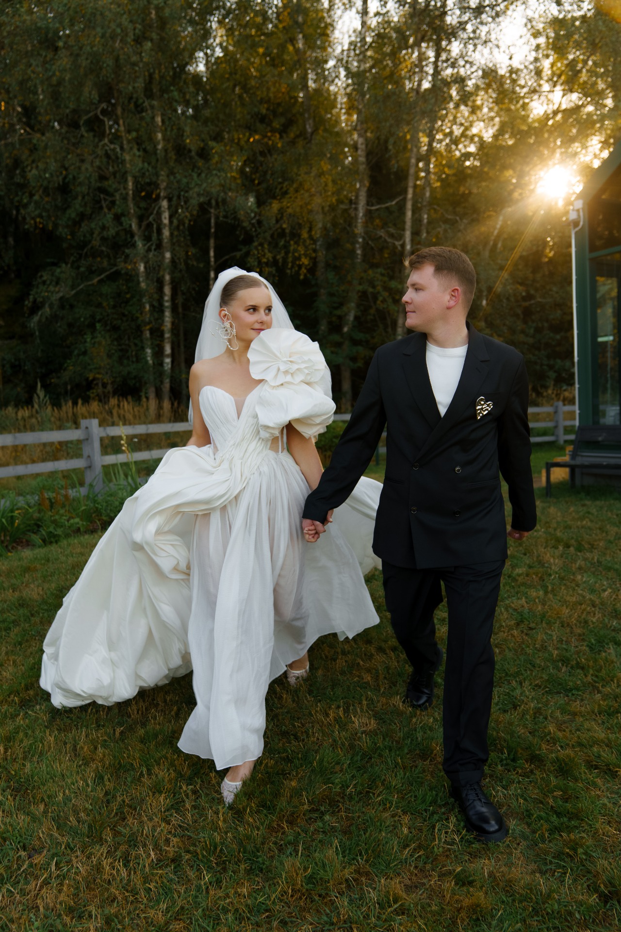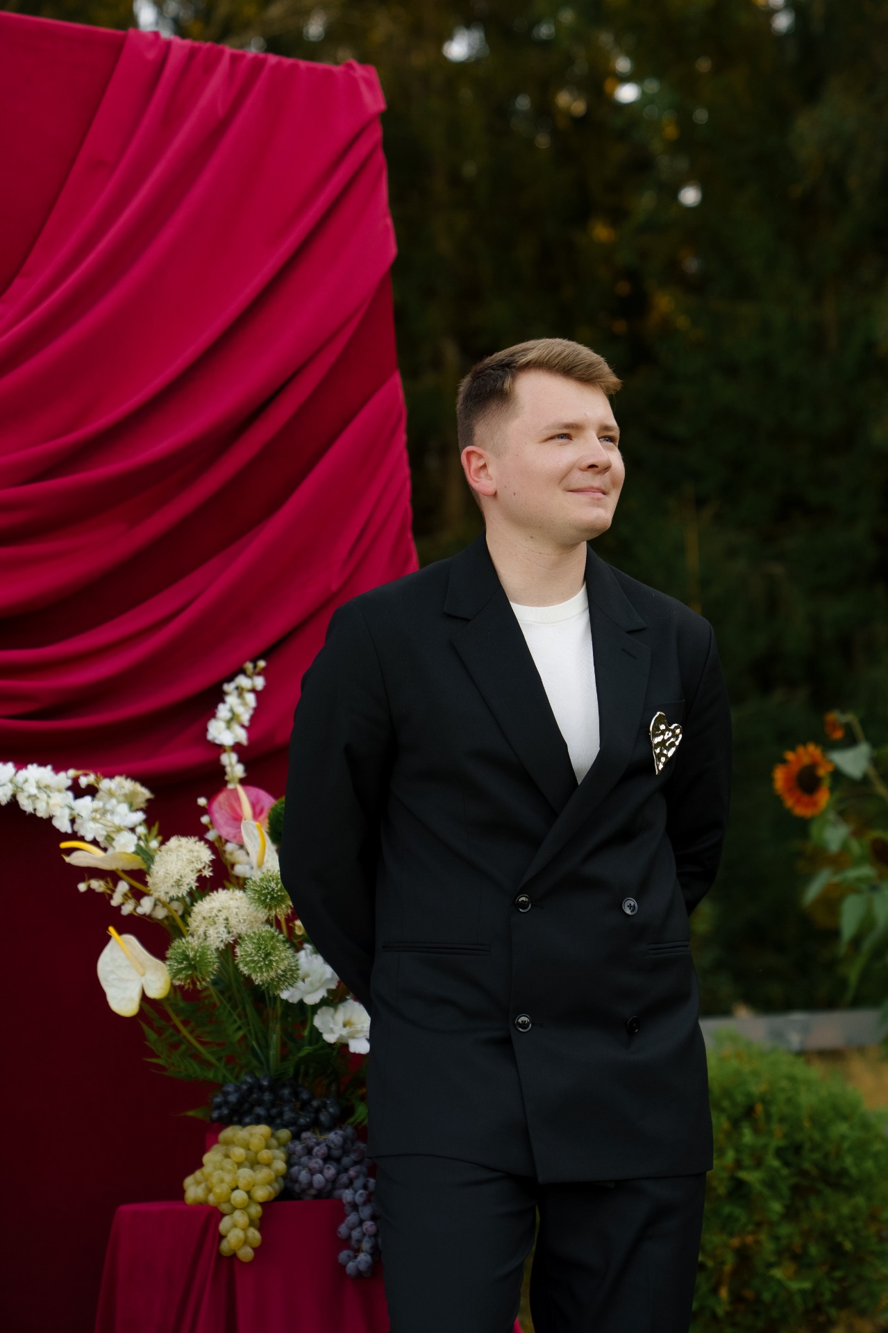Образы мы собирали сами. Илья определился быстро: на роспись он был в сером костюме расслабленного стиля и в любимой модели кроссовок New Balance, а на торжество остановил свой выбор на классическом чёрном костюме. Вместо бутоньерок в обоих образах у него были броши. Я смотрела на него и думала: ну какой красавчик мой муж!