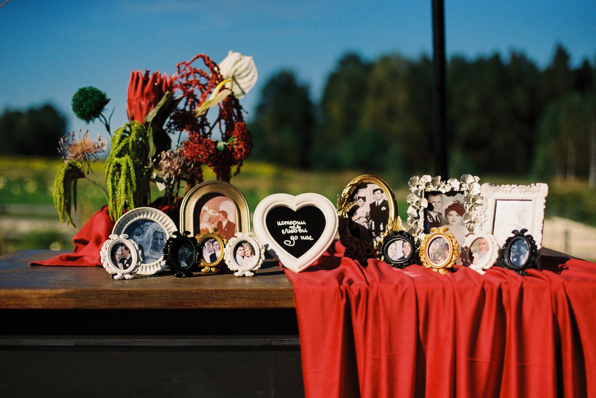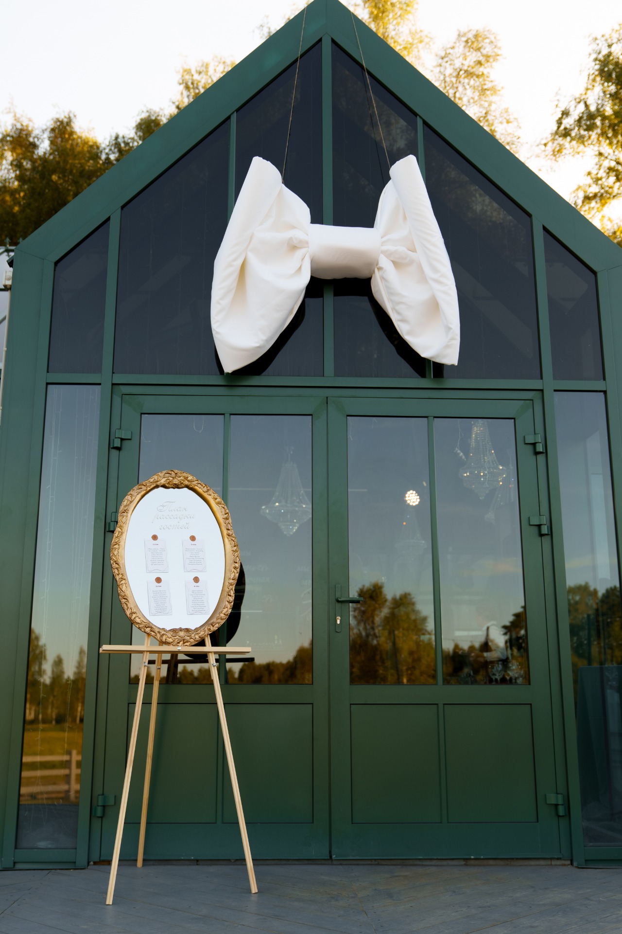 В декоре мы использовали виноград, металлические креманки, банты, свечи, протеи, антуриумы и винтажные вещицы, которые я отыскала на «Авито»: советское зеркало с литой рамой для рассадки гостей, а также мельхиоровую свадебную лопатку, на которой я сделала гравировку наших имён и даты торжества.