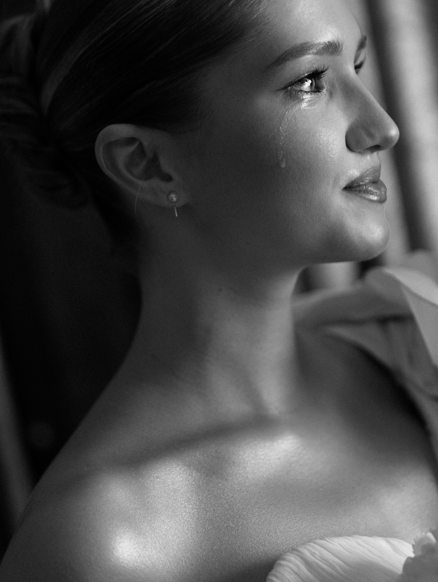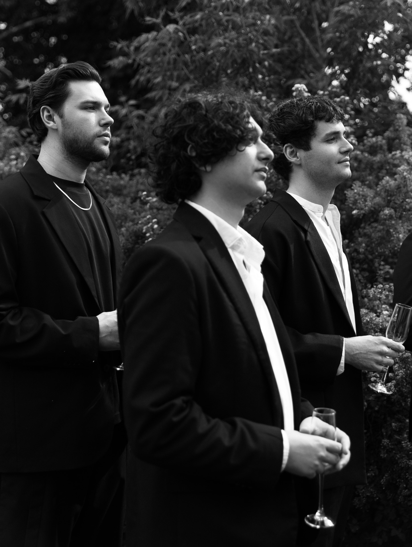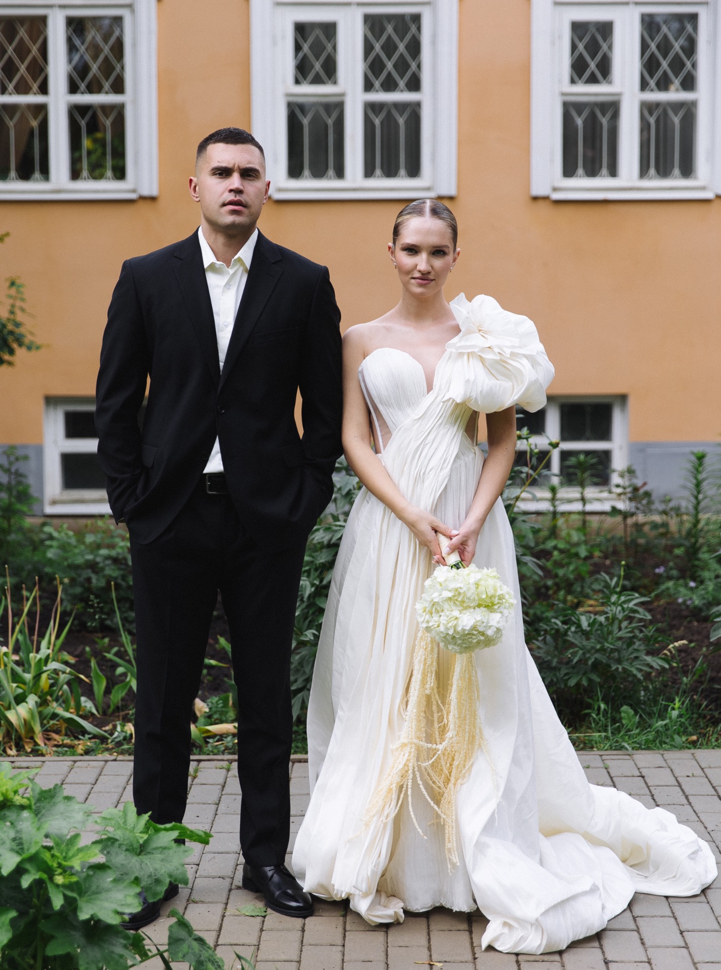 Жених выбрал безупречную классику: чёрный костюм, лаконичные туфли и рубашку благородного оттенка ivory. Строго, стильно и вне времени.