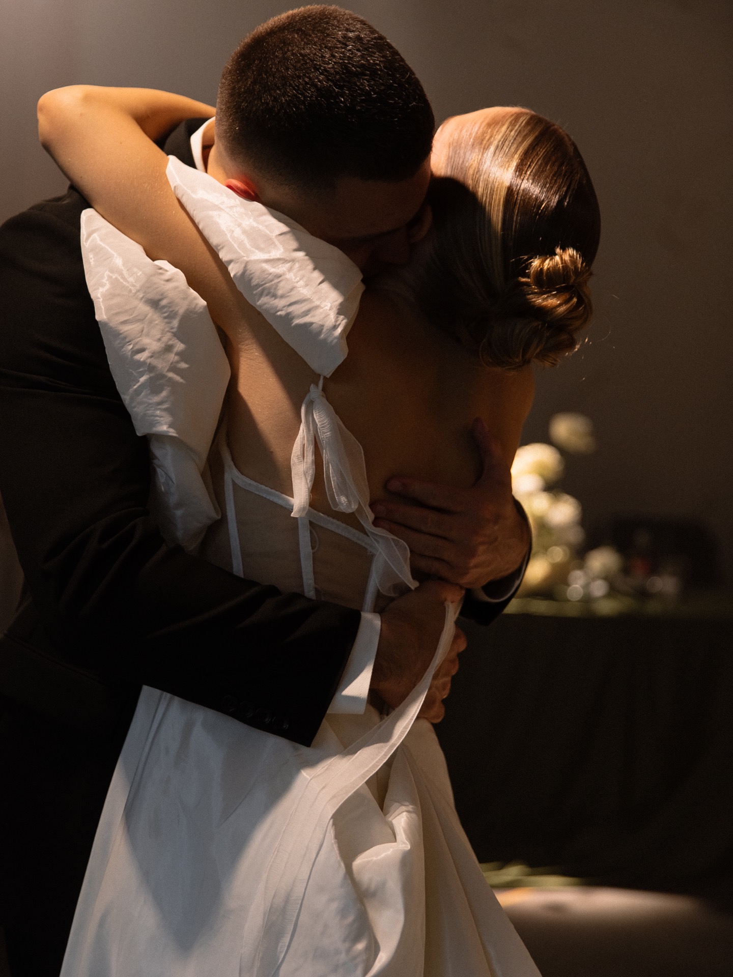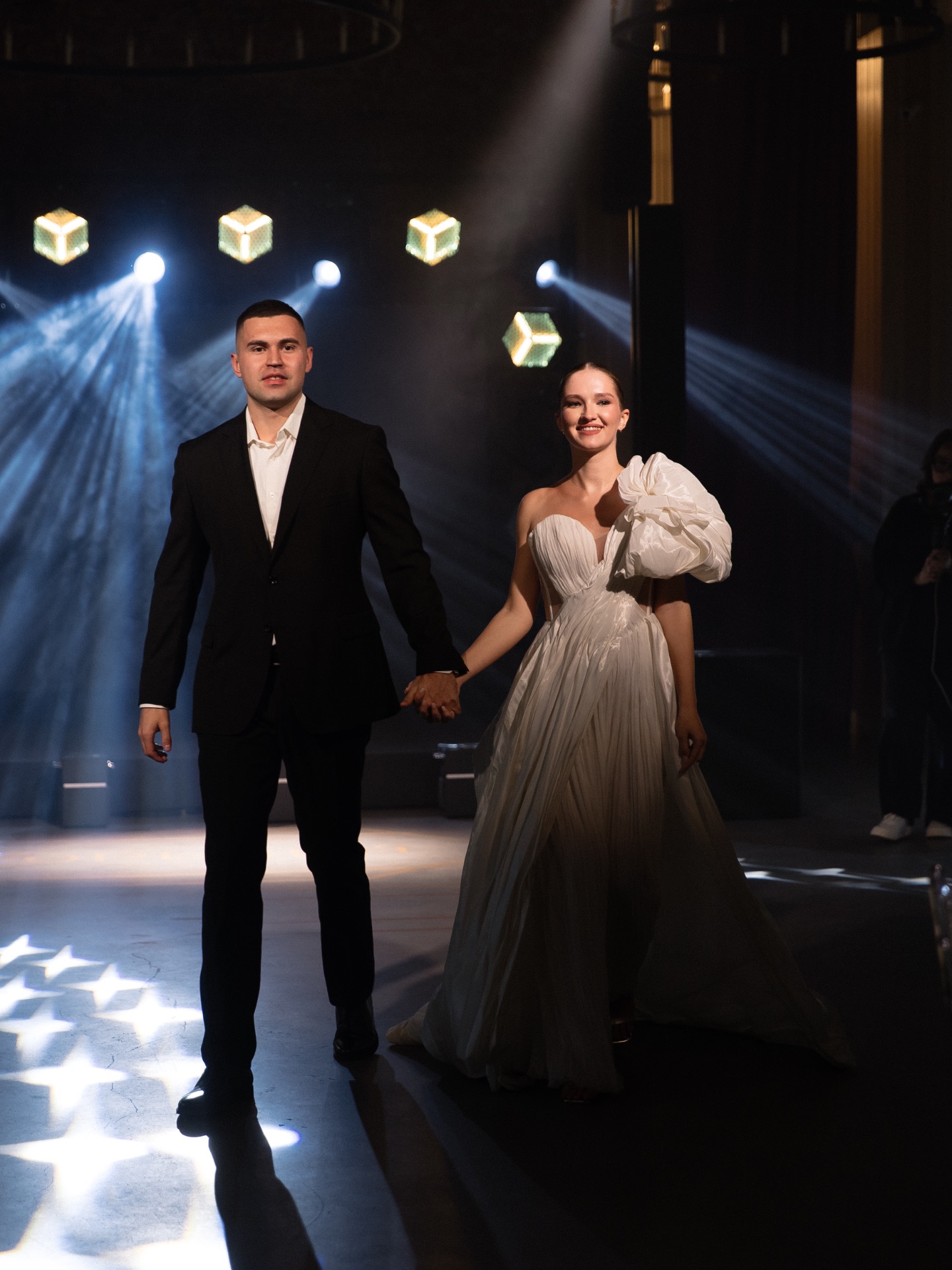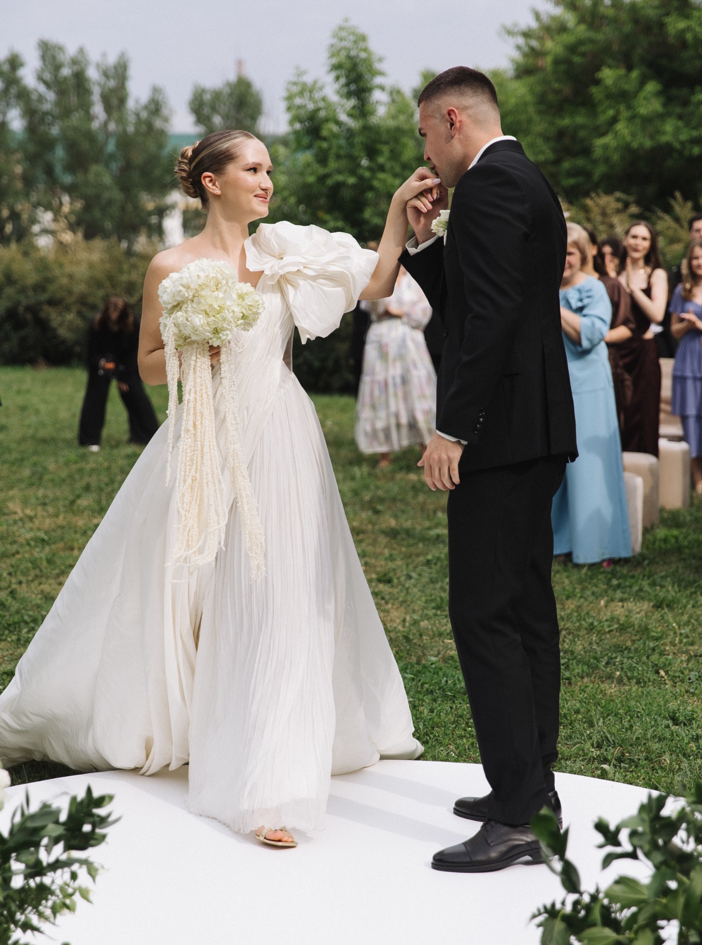 Я примерила немало нарядов, прежде чем найти «то самое», и это было попадание в самое сердце. Платье в перламутровом оттенке с асимметричным верхом и акцентом в виде крупного цветка выглядело, как арт-объект. Пышная юбка из натурального шёлка с металлизированной нитью переливалась в движении. Золотые босоножки стали изящным штрихом в образе. А гладкий пучок подчёркивал утончённость и позволял платью быть в центре внимания.