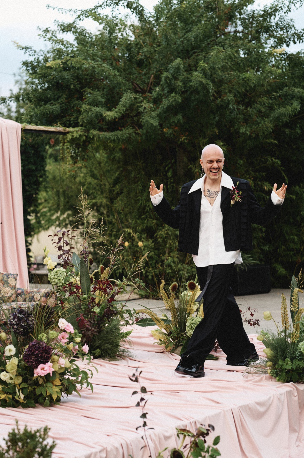 Первый образ был с грузинским подтекстом. Второй наряд мне шила дизайнерка Регина — очаровательная и невероятно талантливая девушка, которая сразу уловила идею и воплотила всё в лучшем виде. Этот образ получился более классическим и стал данью настоящему свадебному платью. А третий образ был про меня: яркий, свободный и очень удобный.
