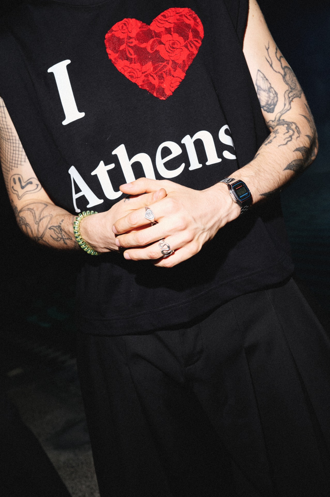Основной костюм Искандера мы полностью собрали в «Чёрным черно», оттуда же были и его чёрные шорты для вечера. Майку мы закастомили с помощью чудесной Лизы — она же создала мои первый и третий образы. Надпись «I love Athens» стала отсылкой ко мне, конечно же, к нашему будущему домику и новому любимому городу Искандера.
