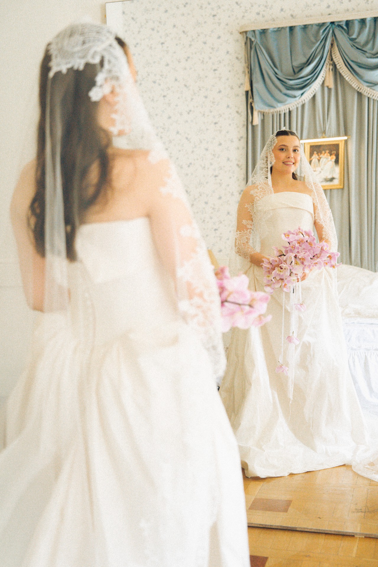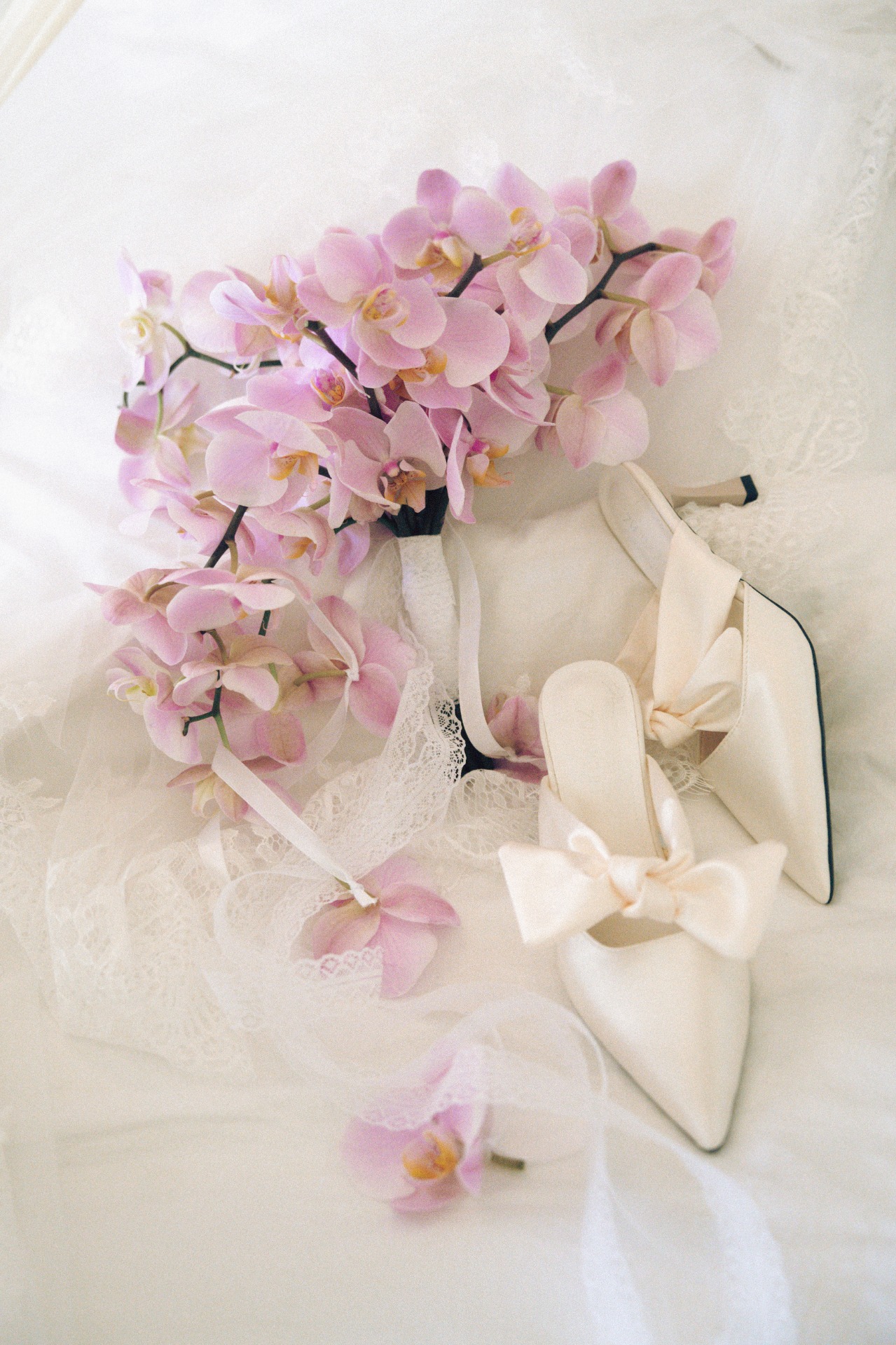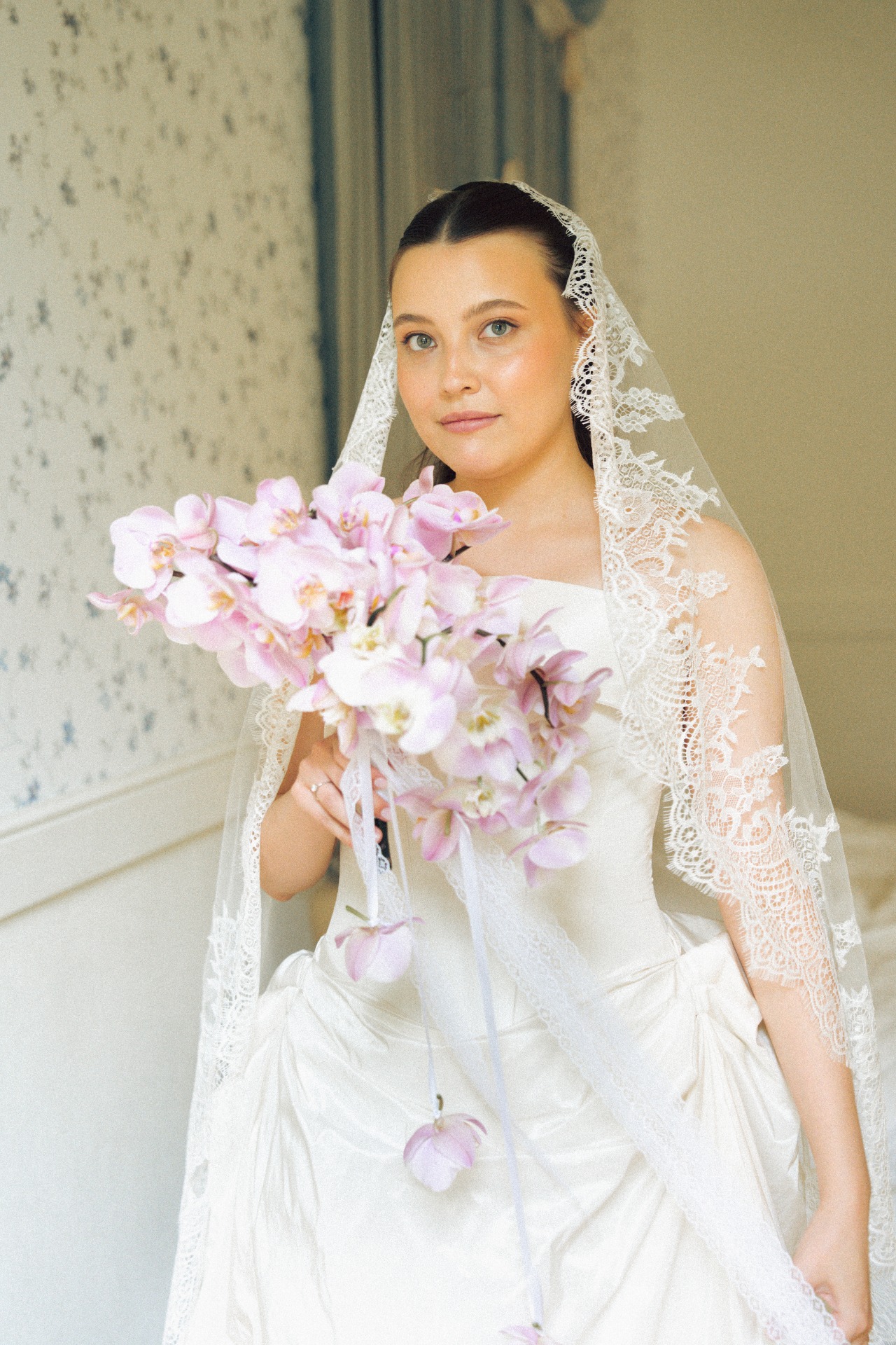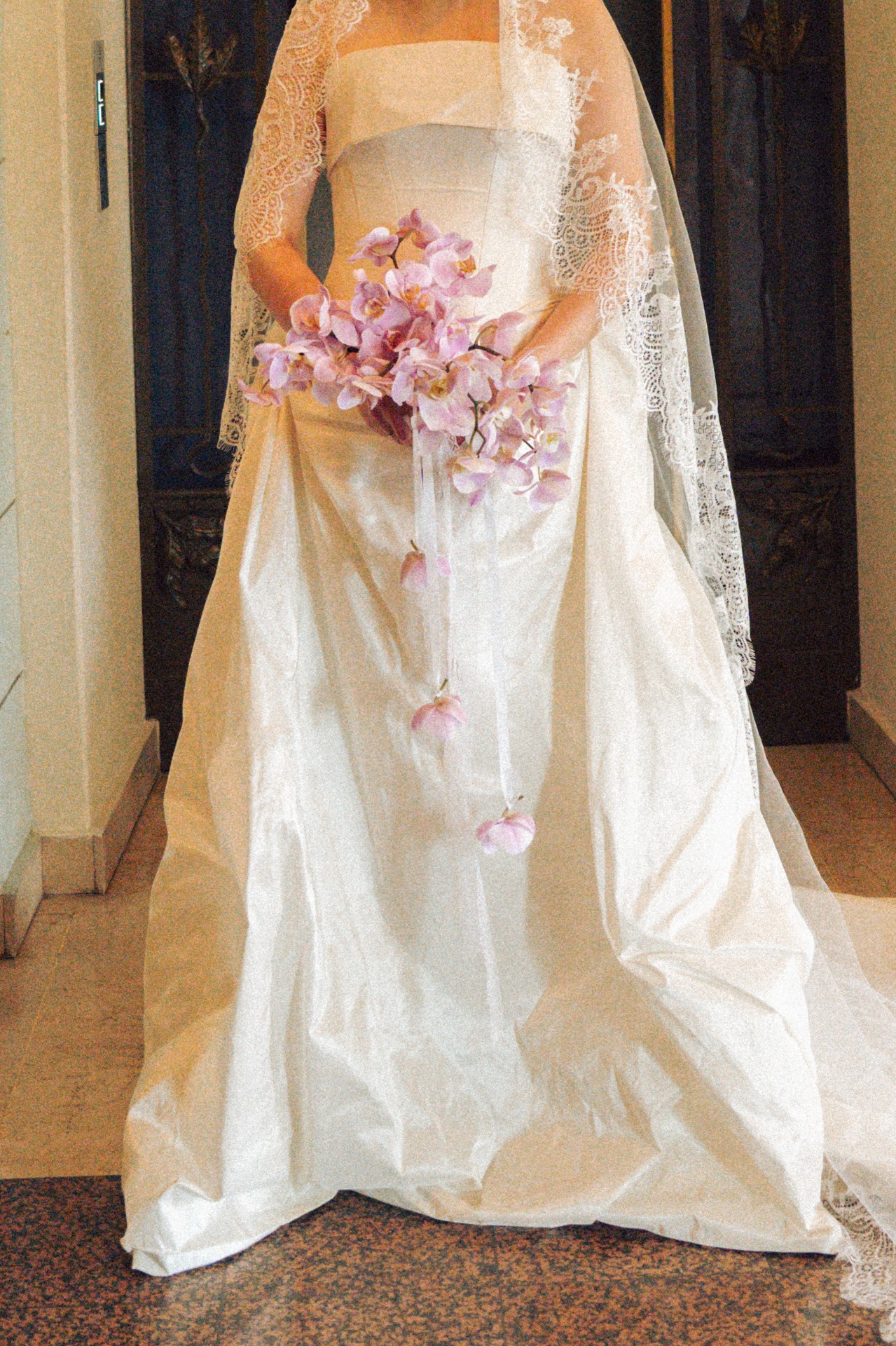 Образ я дополнила туфельками с бантами и фатой-испанкой с кружевом. Дополнительных украшений я не хотела — наряд вышел очень самодостаточным.