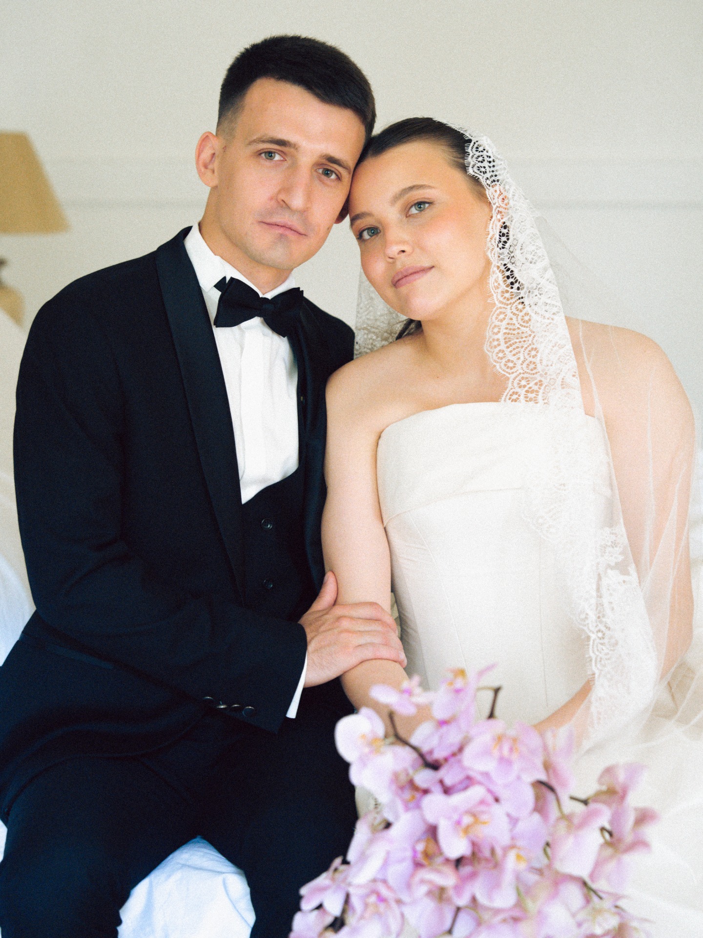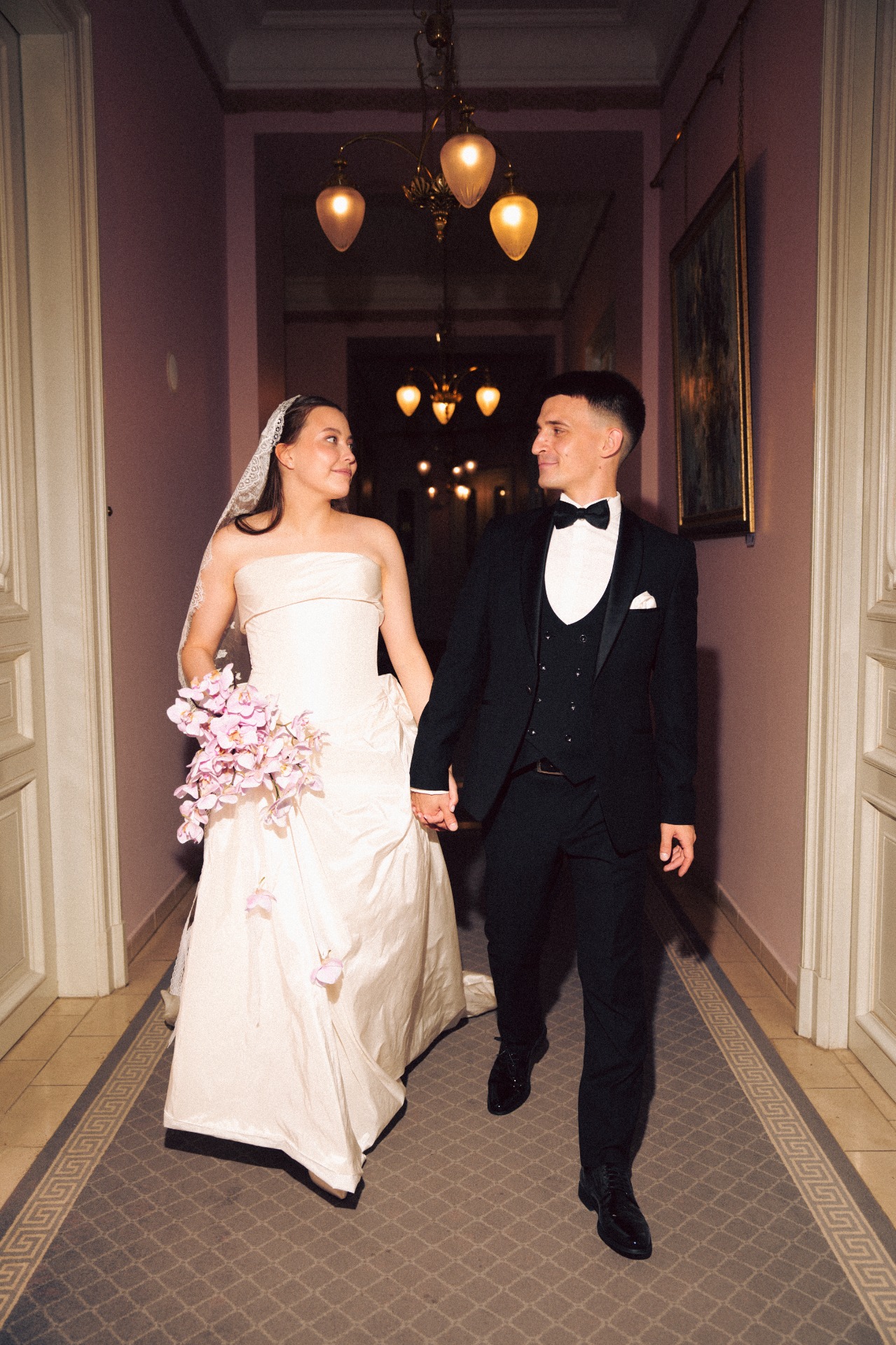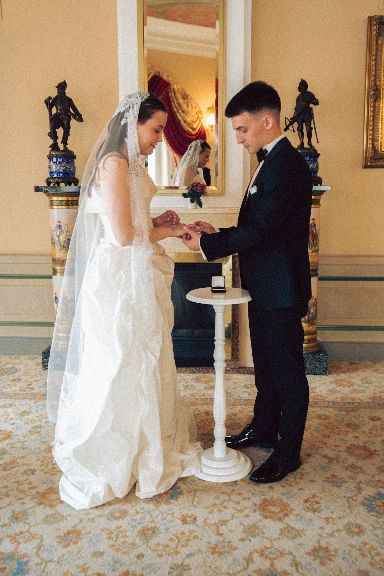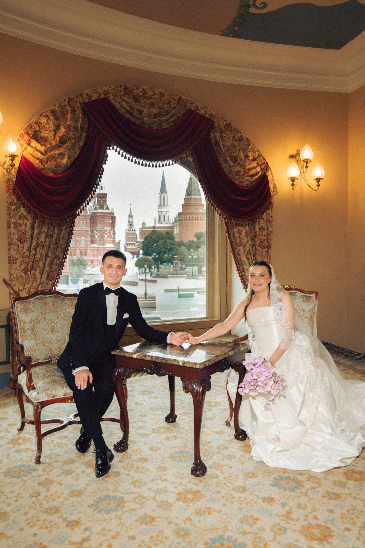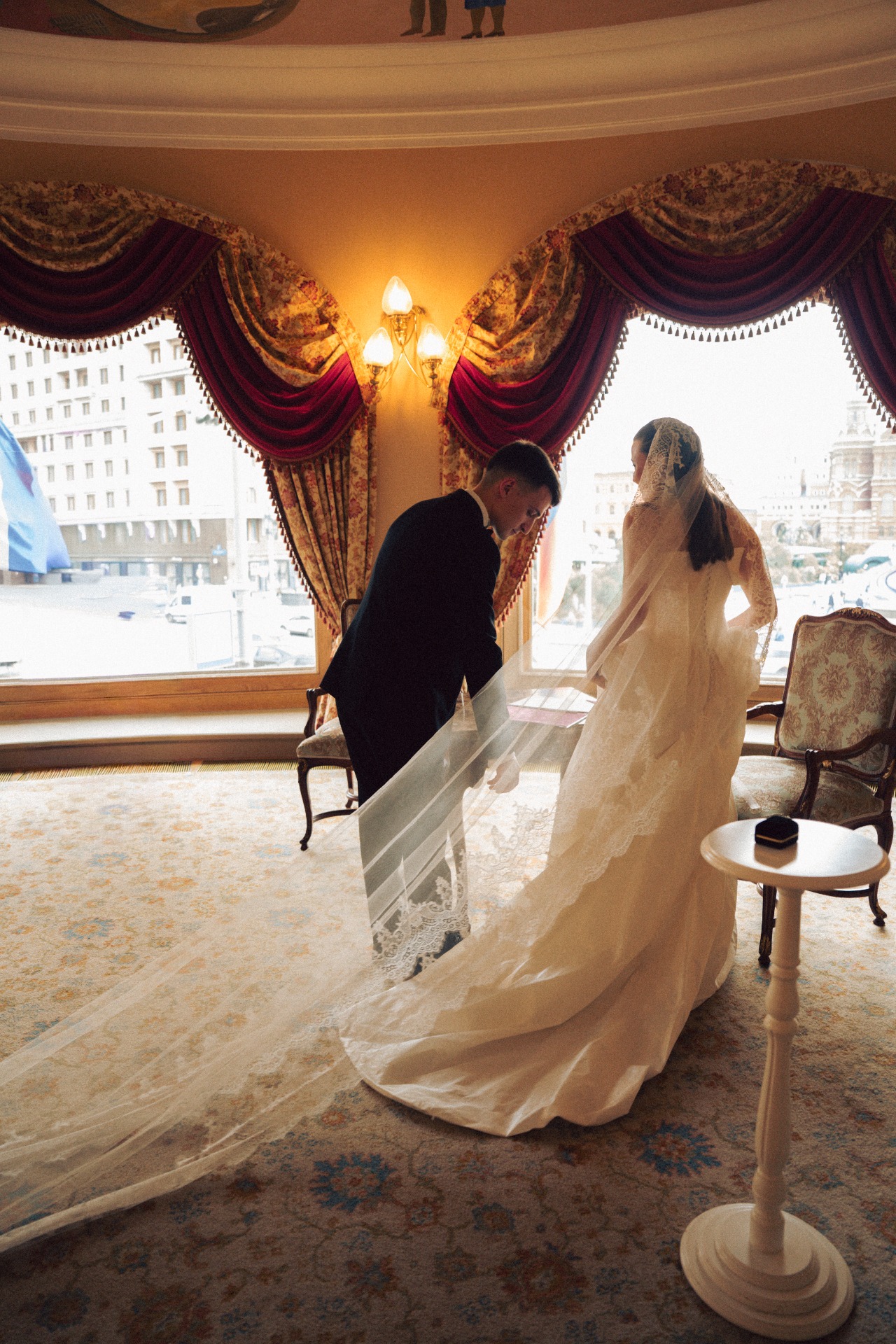 Наша церемония заключения брака прошла в гостинице «Националь» с видом на Кремль и Манежную площадь, в окружении семьи. До церемонии мы провели небольшую съёмку на лестнице и в коридорах гостиницы, встречали гостей и очень волновались. Потом были трепетные «да», слёзы и поздравления от родных.
