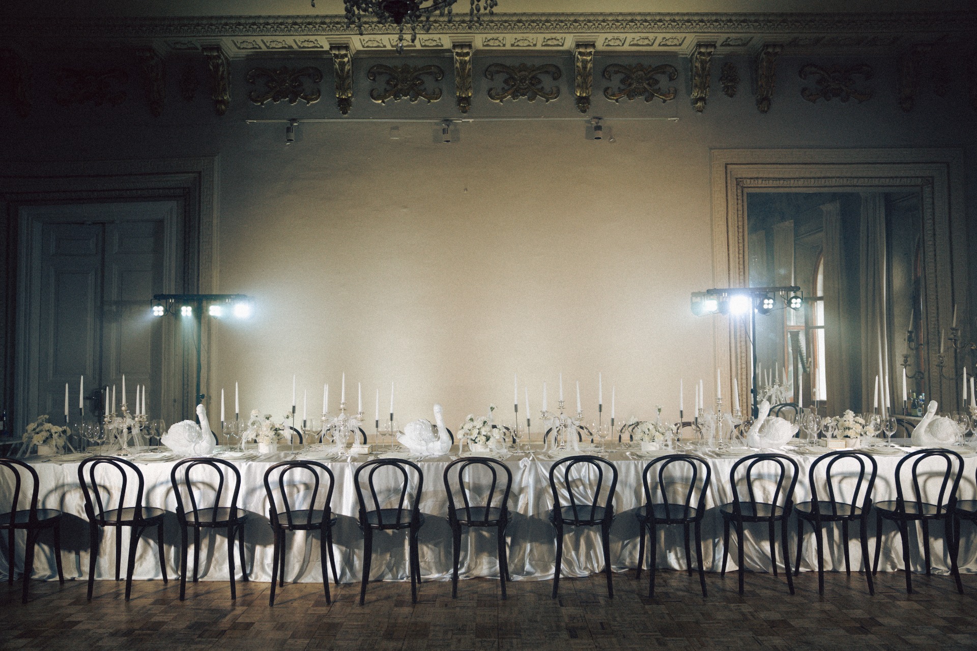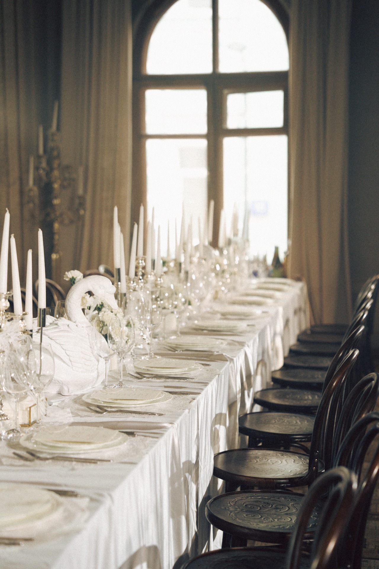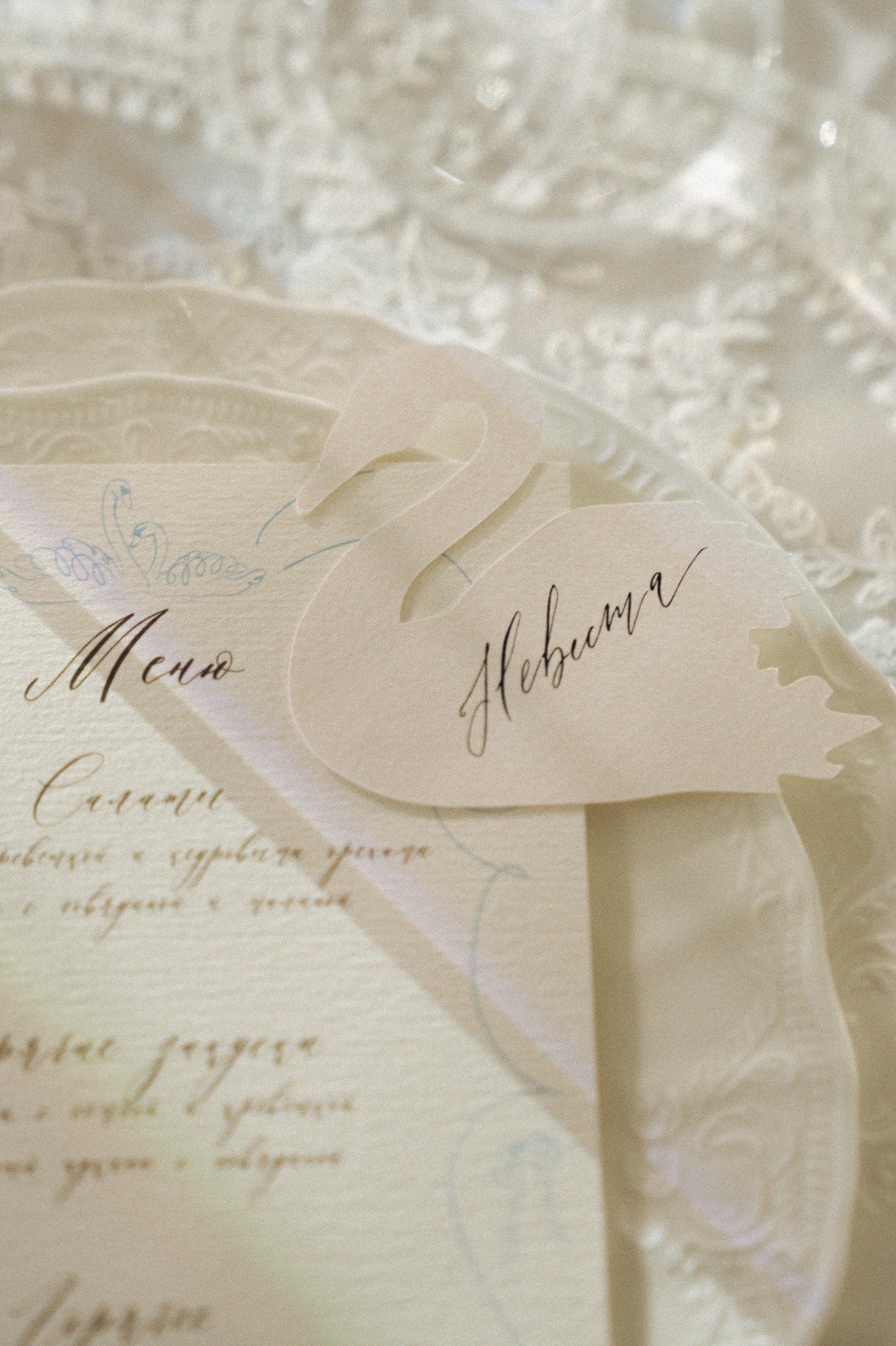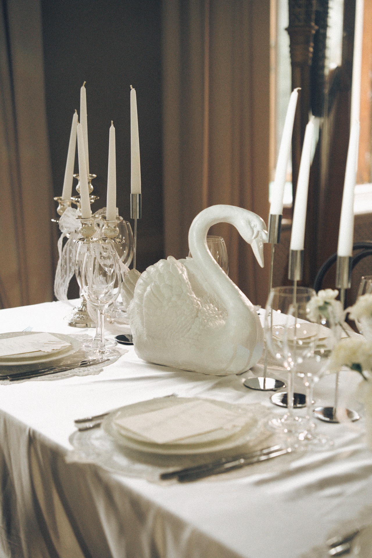 Мы с Артёмом изначально планировали свадьбу камерной, в кругу самых близких и друзей, но нам хотелось торжественной атмосферы. Поэтому мы всегда смотрели на референсы, где есть свечи, лепнина, люстры, и обязательная роспись в день самой свадьбы. И, конечно, нам хотелось добавить какую-то свою изюминку. Ею стали лебеди. А остальной декор сложился сам собой: свечи в канделябрах, кружевные ленты и салфетки, карточки рассадки и меню, оборки на скатерти.