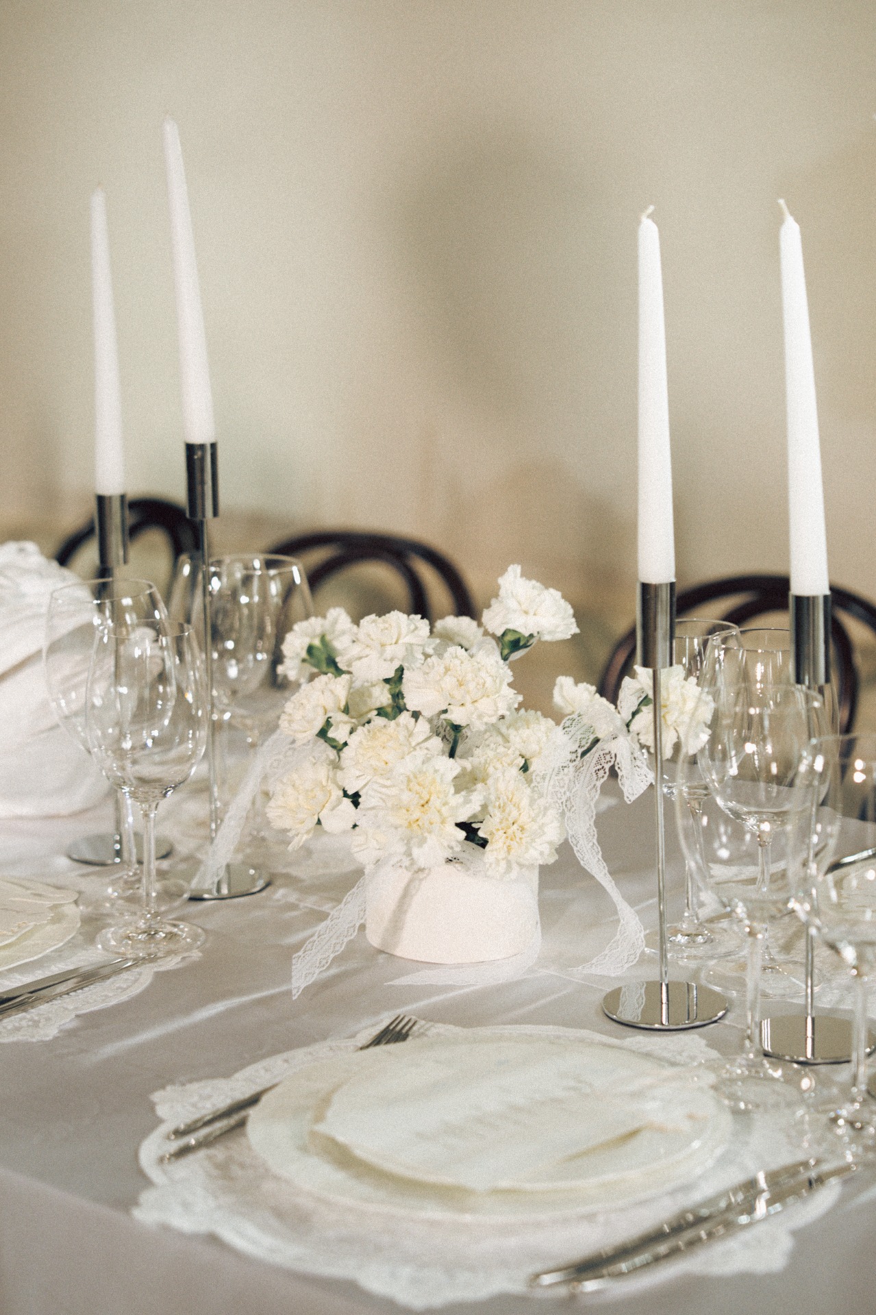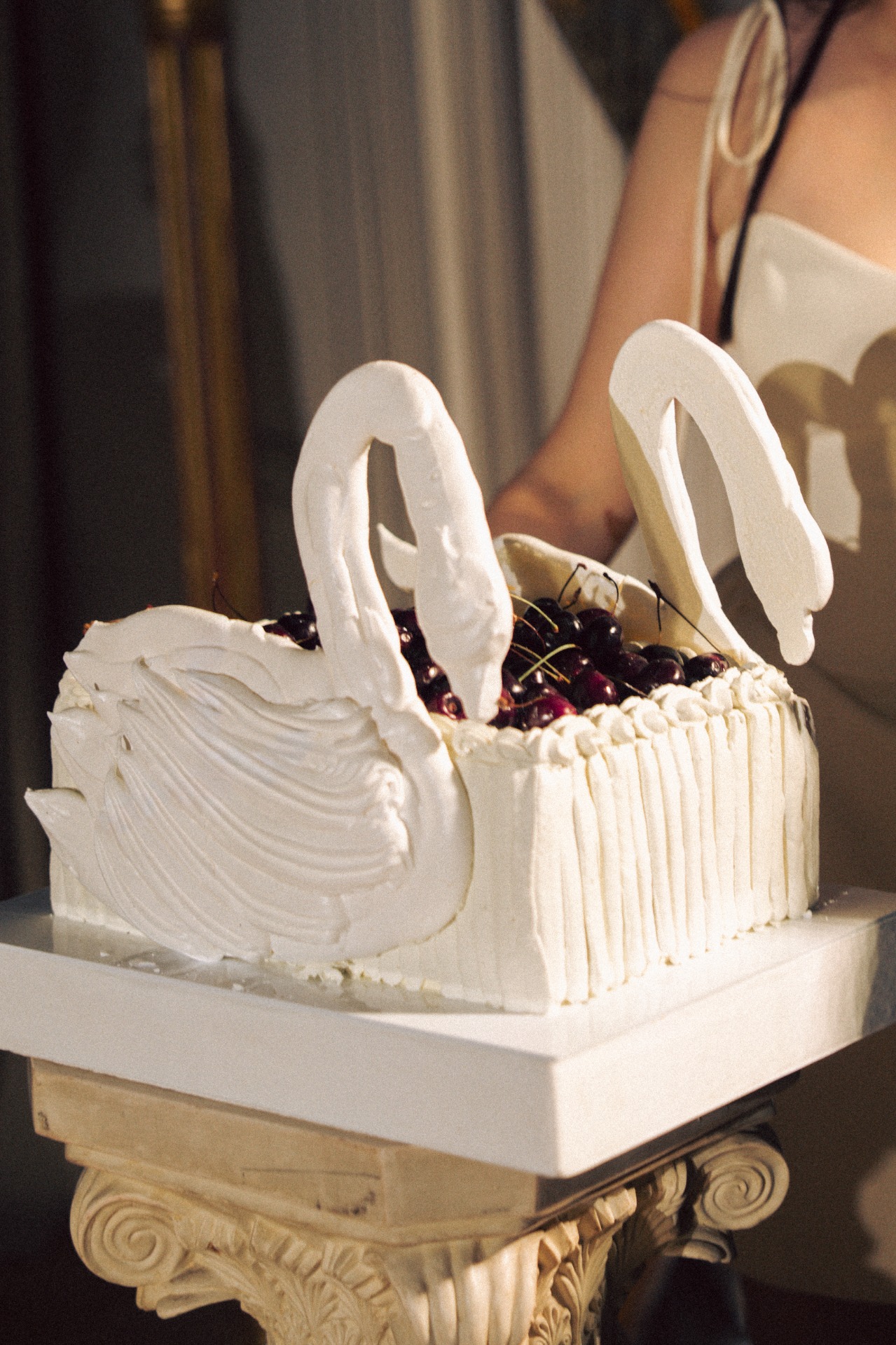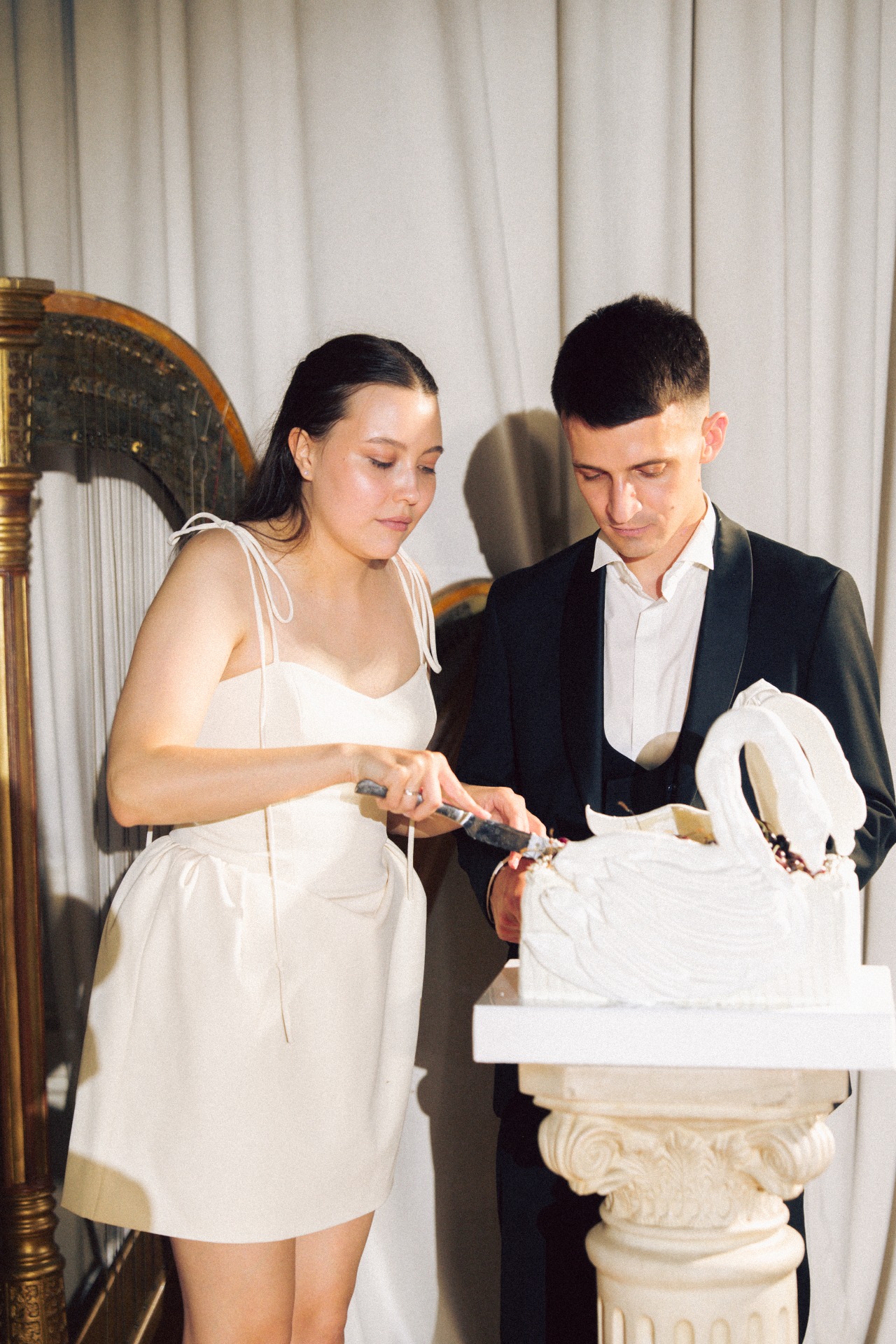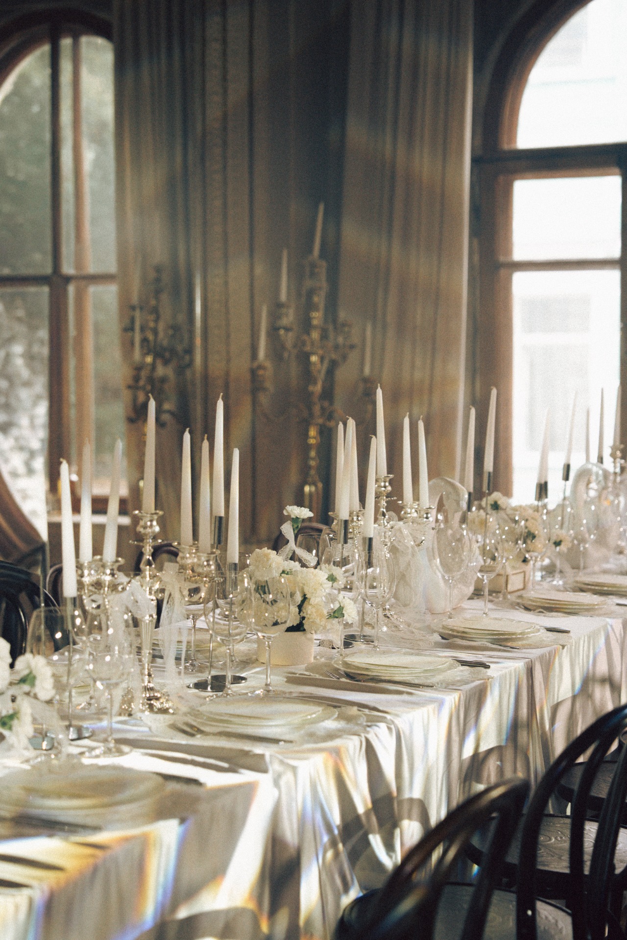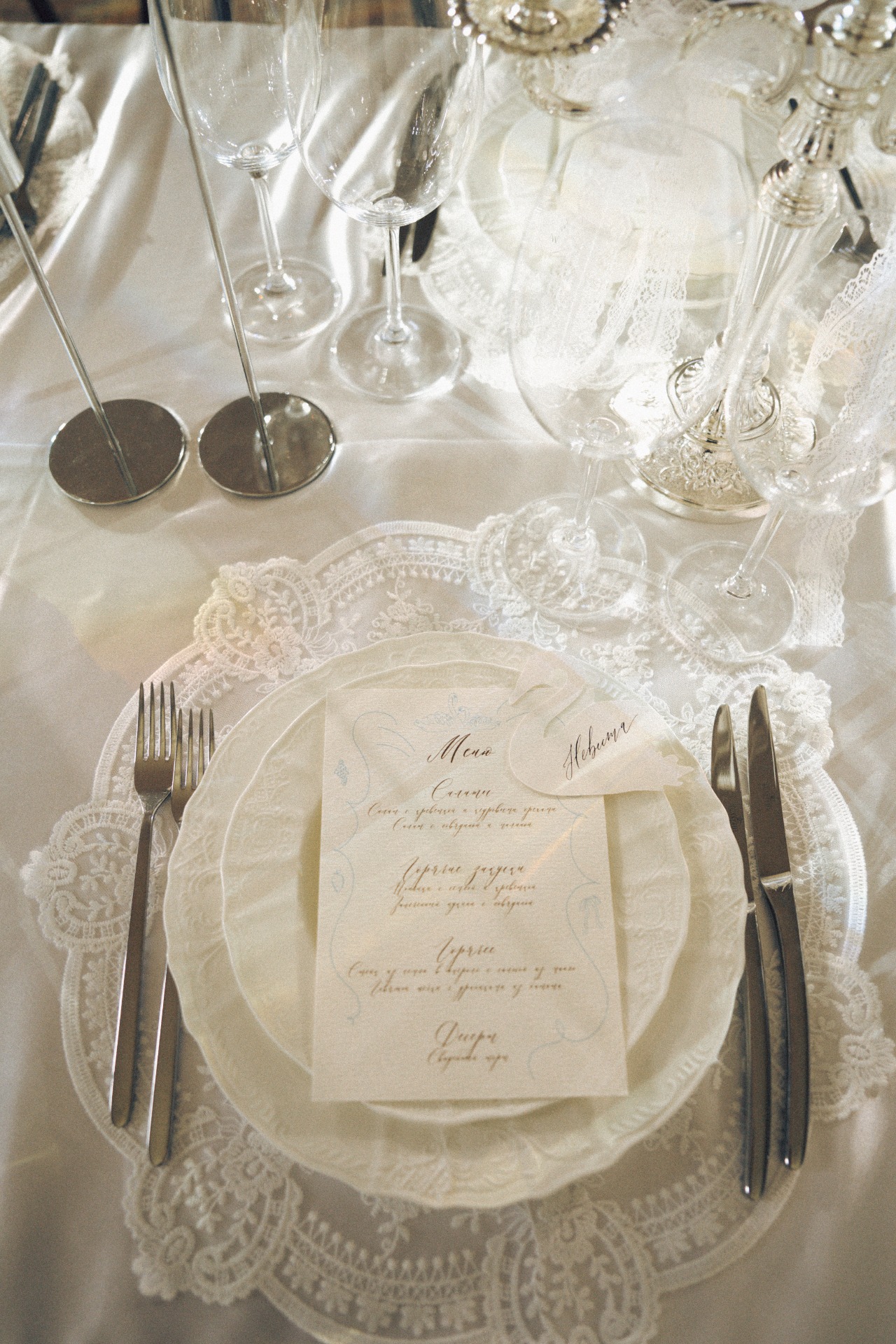 Мы с Артёмом изначально планировали свадьбу камерной, в кругу самых близких и друзей, но нам хотелось торжественной атмосферы. Поэтому мы всегда смотрели на референсы, где есть свечи, лепнина, люстры, и обязательная роспись в день самой свадьбы. И, конечно, нам хотелось добавить какую-то свою изюминку. Ею стали лебеди. А остальной декор сложился сам собой: свечи в канделябрах, кружевные ленты и салфетки, карточки рассадки и меню, оборки на скатерти.