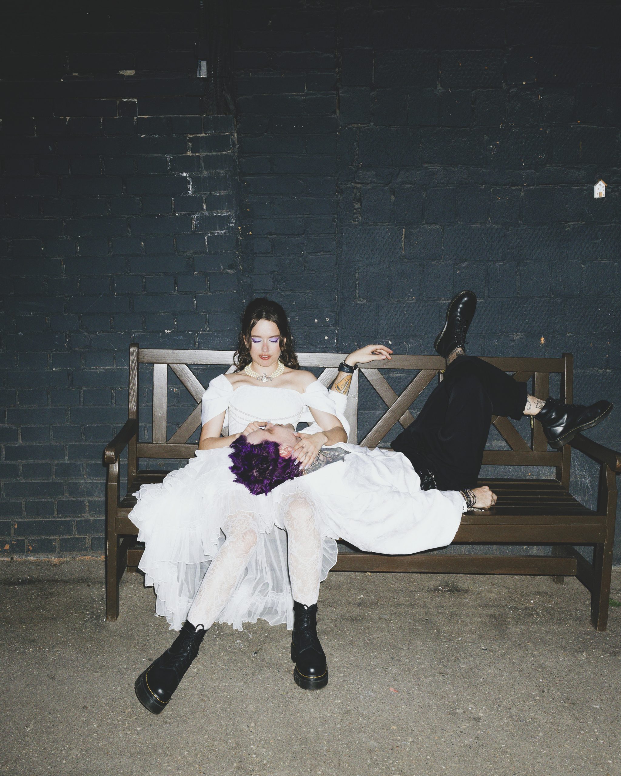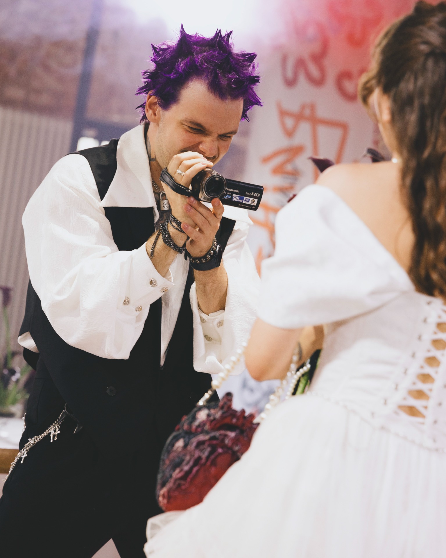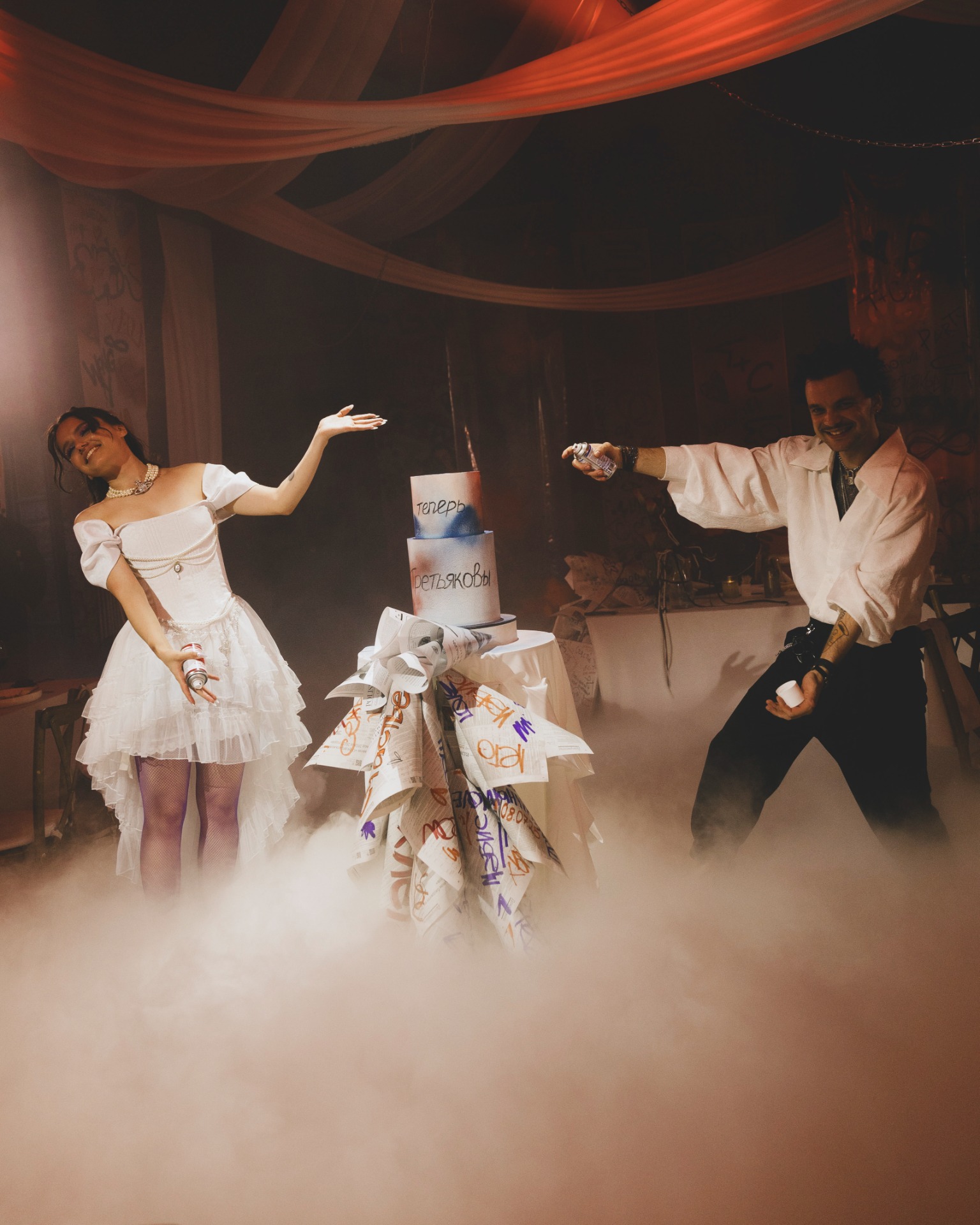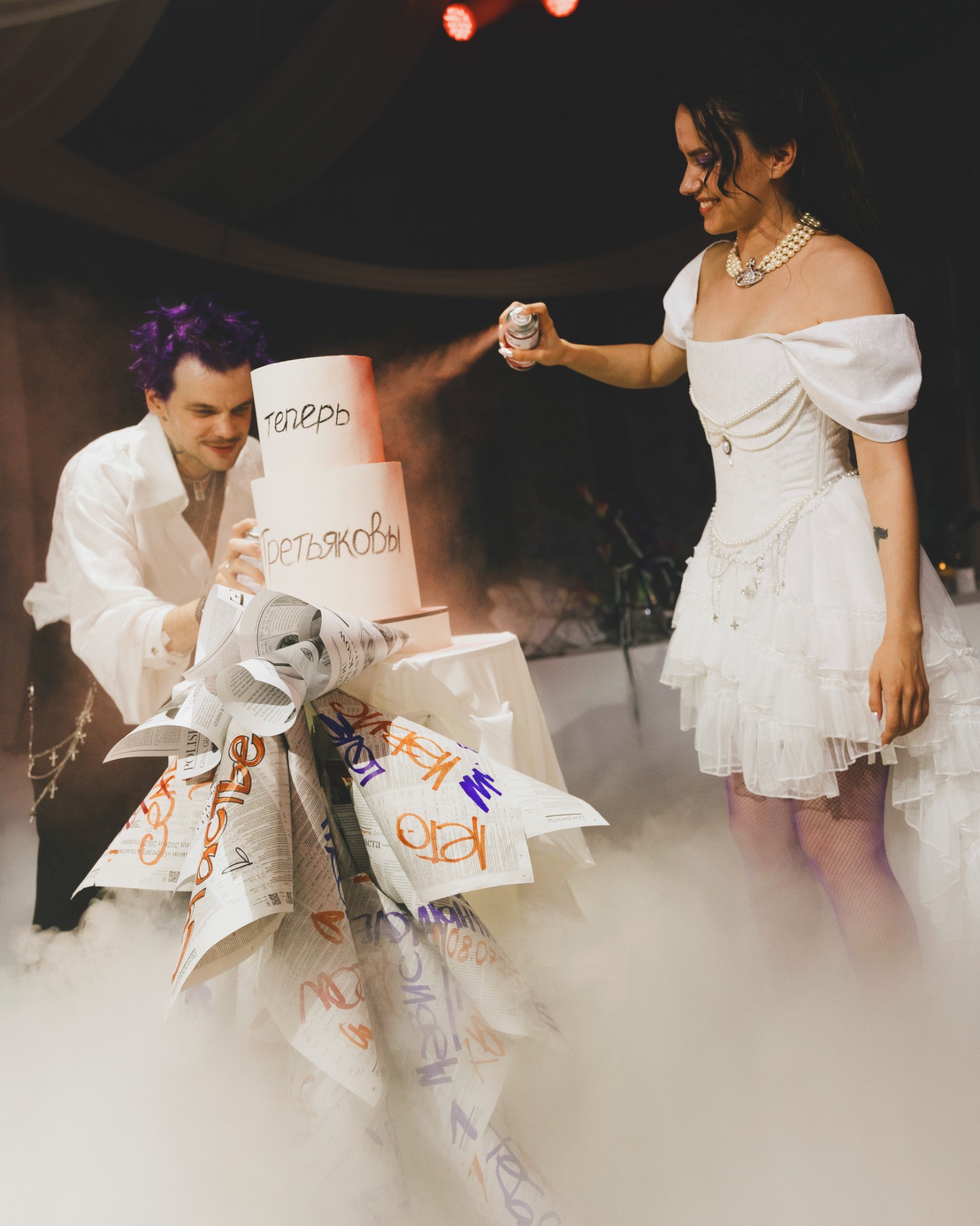 Декоратор Таша сразу уловила наш вайб, а организаторы предложили покрасить торт пищевыми аэрозольными красками — это было невероятно круто! Мы выбрали панк, потому что оба очень любим музыку и стиль Великобритании 70–80-х: Vivienne Westwood, Sex Pistols, Madness, Joy Division и других.