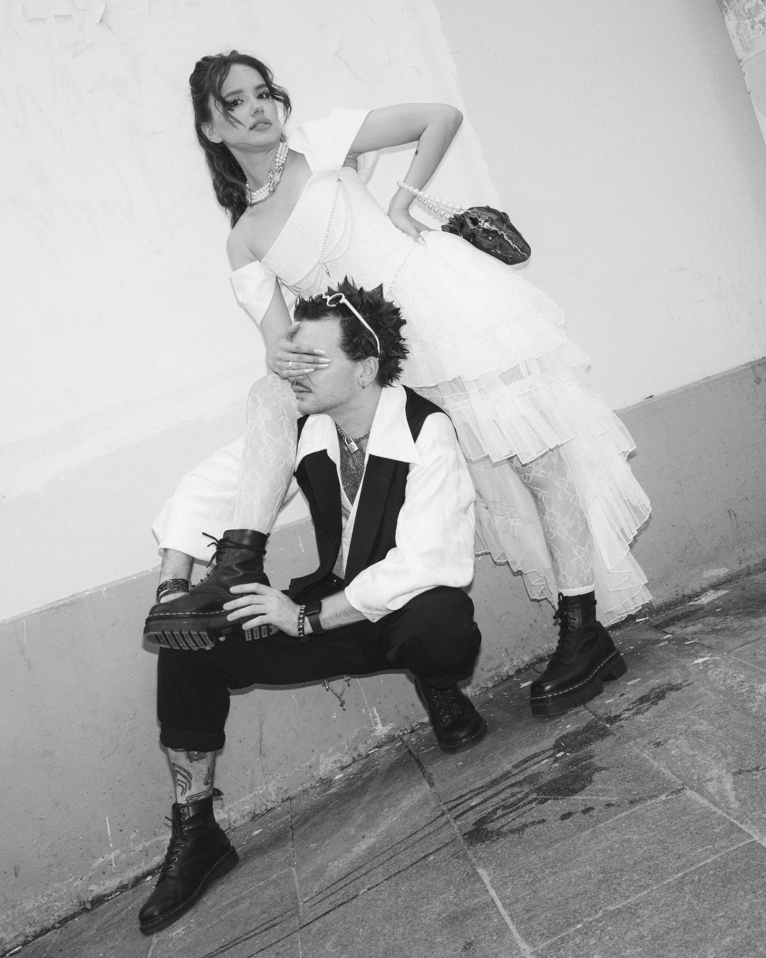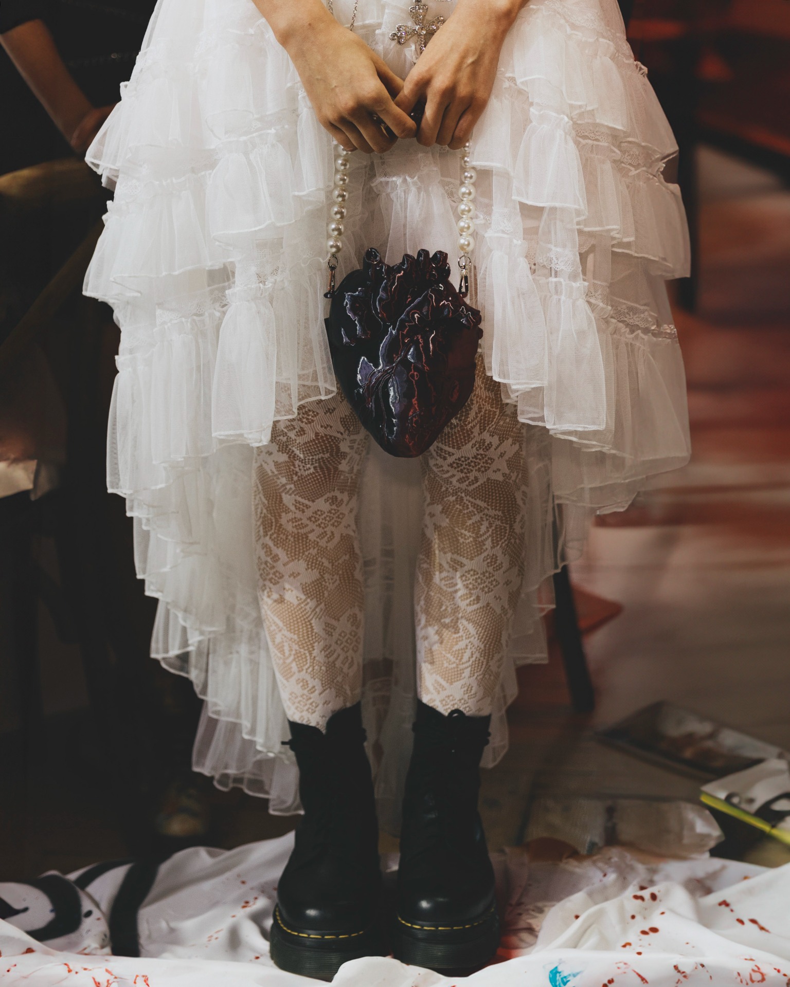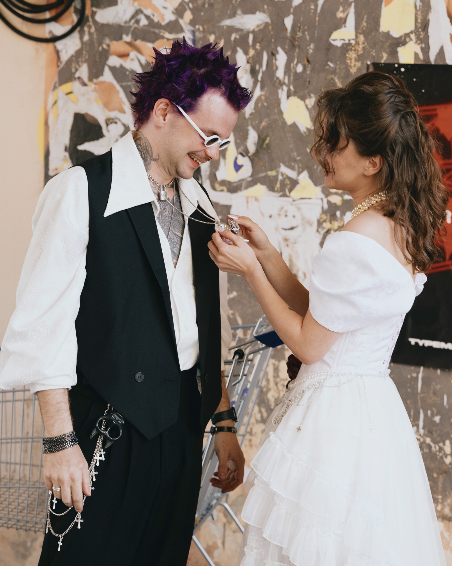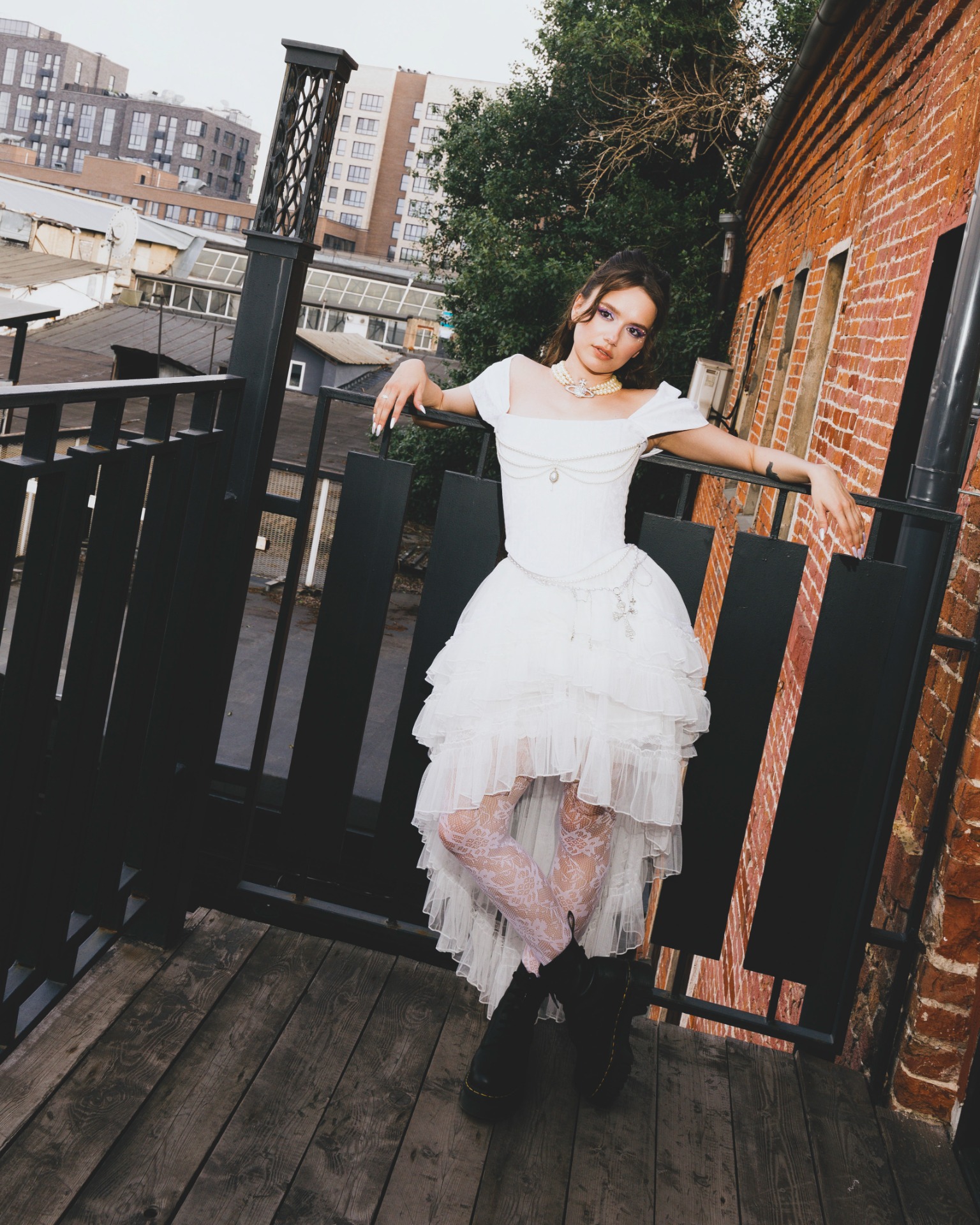 Мне изначально предлагали выбрать платье любого цвета, кроме белого, чтобы попасть в тематику. Но потом появилась Диана и услышала мои «молитвы» о том, что я хочу белое платье. Я была уверена, что и в этом цвете можно сделать настоящий панк-образ! Корсет и сумку в форме человеческого сердца мне сделали на заказ, колье от Vivienne Westwood мы нашли на Avito, а остальное — вещи с Wildberries и AliExpress.
